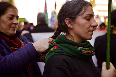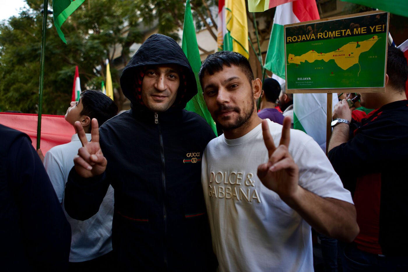 La série montre la diversité des participants : enfants et bébés brandissant des drapeaux, hommes et femmes posant des gestes de paix, et des portraits expressifs de militants, certains avec des symboles kurdes sur leurs uniformes ou peintures faciales. Ces images reflètent l’unité, la résistance et l’engagement collectif au sein de la manifestation, tout en capturant des instants d’intimité et de concentration au cœur de la mobilisation.