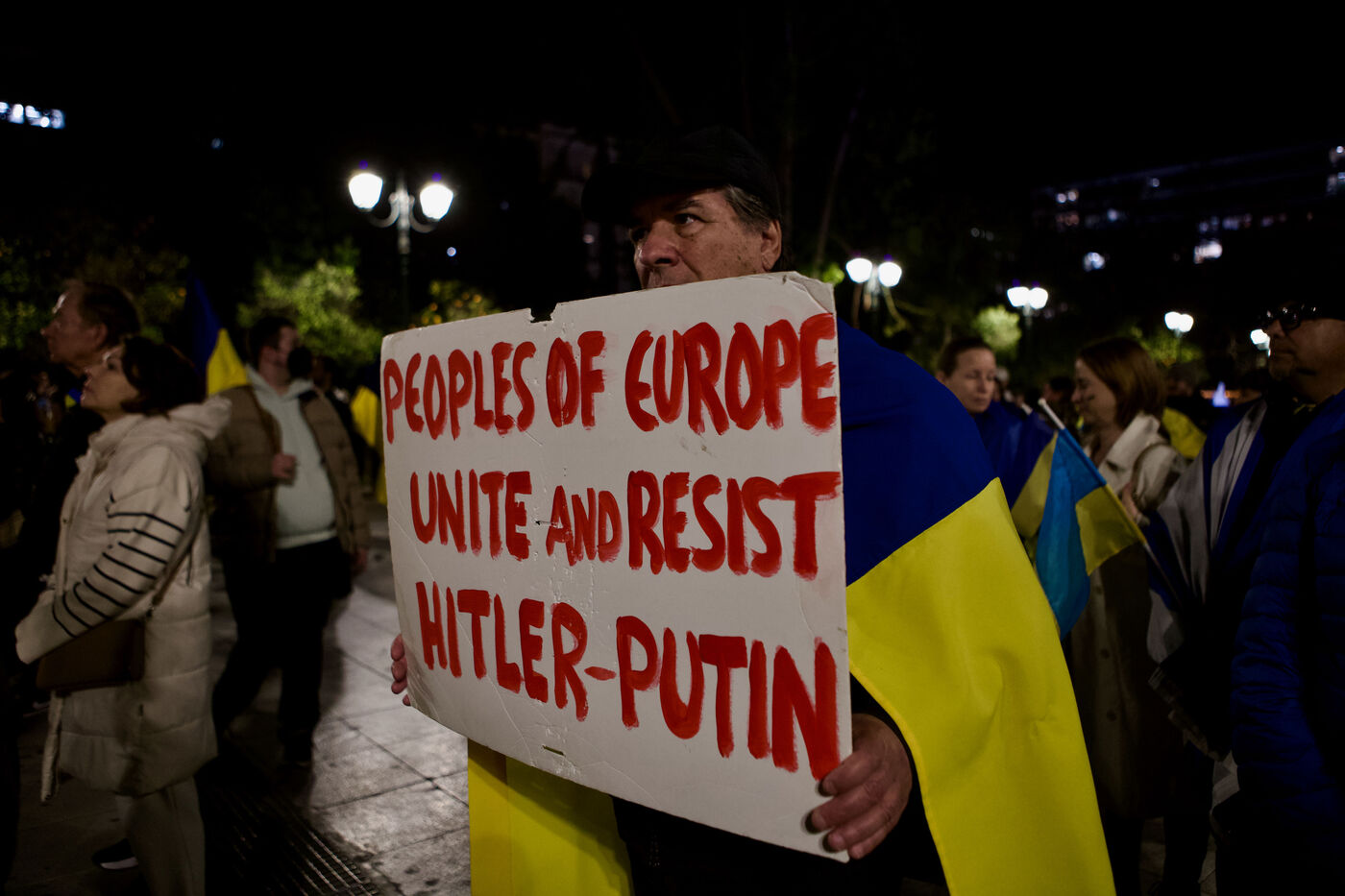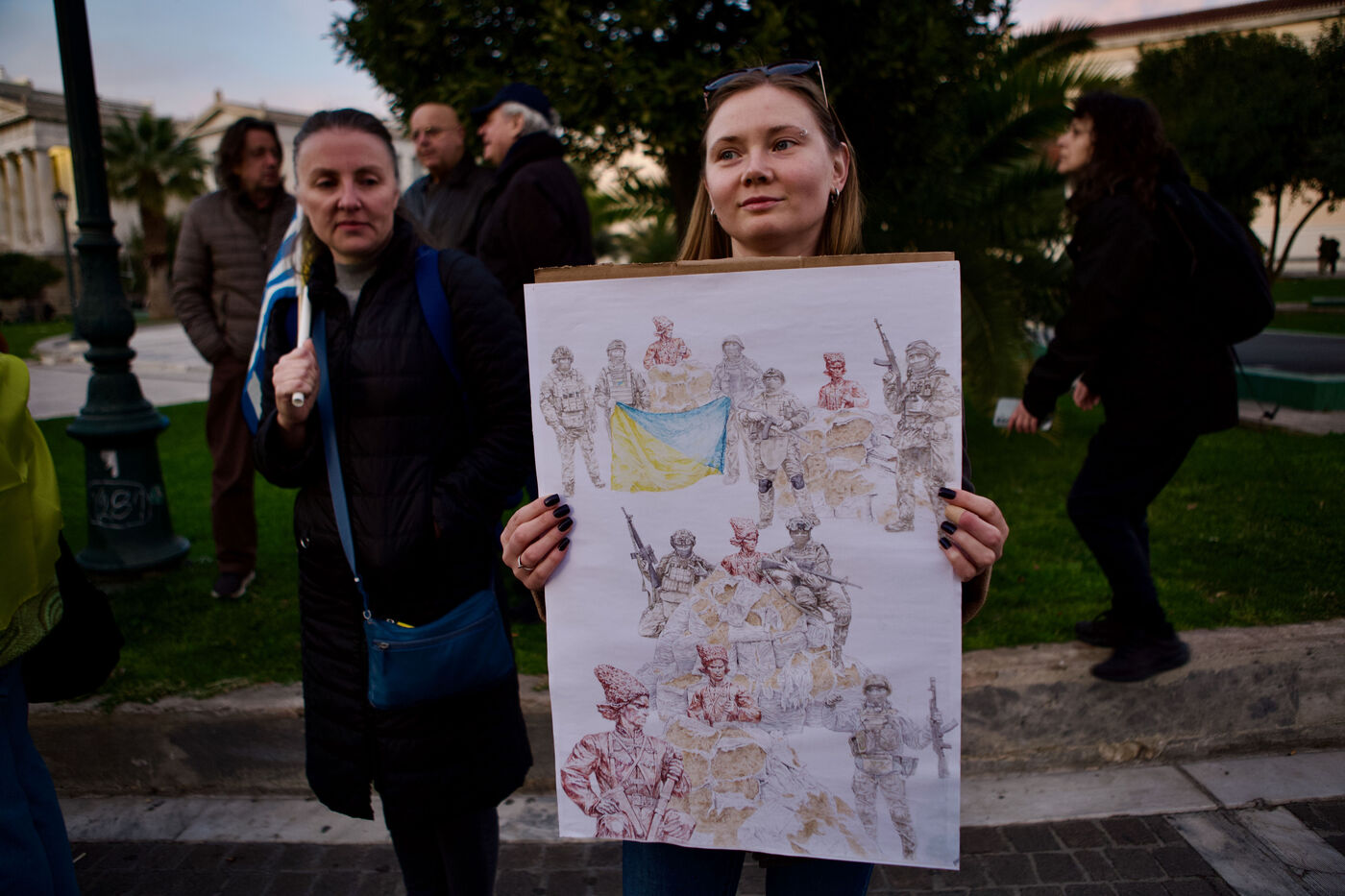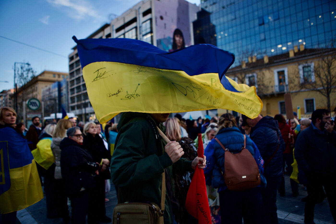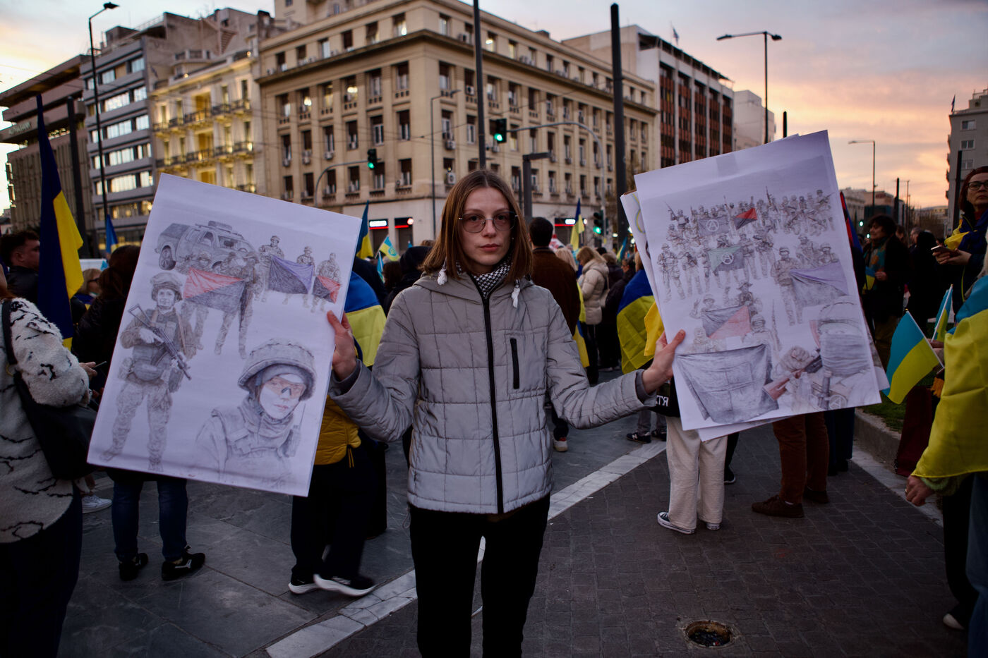Children and women in traditional Ukrainian attire and flower crowns were seen staring at the camera or contemplative in the crowd. Marches progressed through the city centre towards Syntagma Square, with demonstrators waving blue and yellow flags and holding signs, including anti-Putin messages. At Syntagma, a massive crowd gathered, collectively waving a huge Ukrainian flag while chanting. Artworks by David Chichkan depicting anarchist-themed Ukrainian soldiers with Nestor Makhno were also displayed.