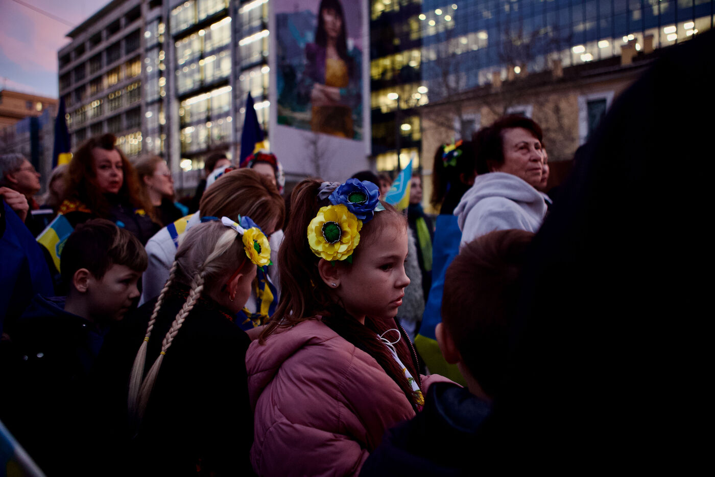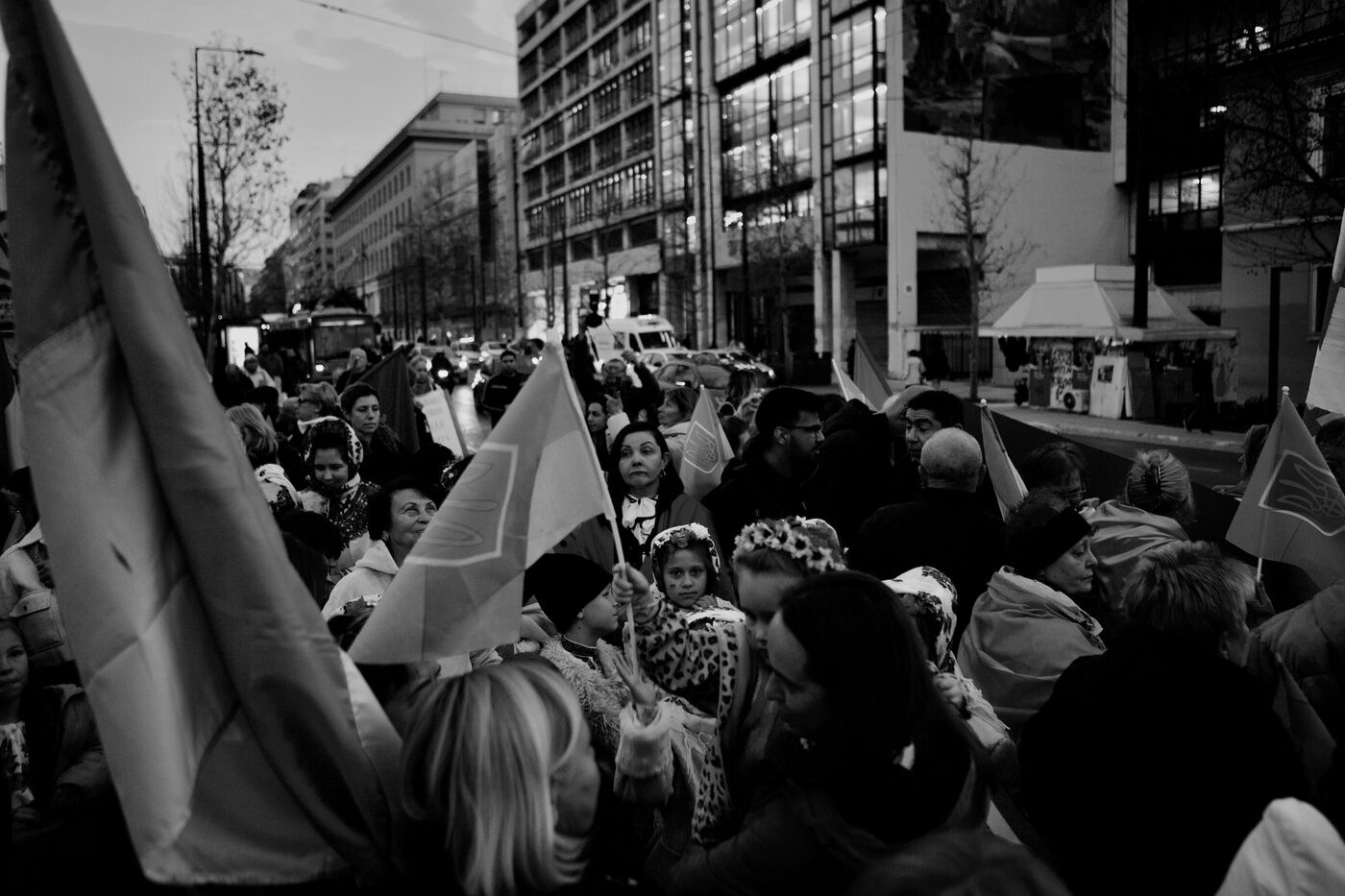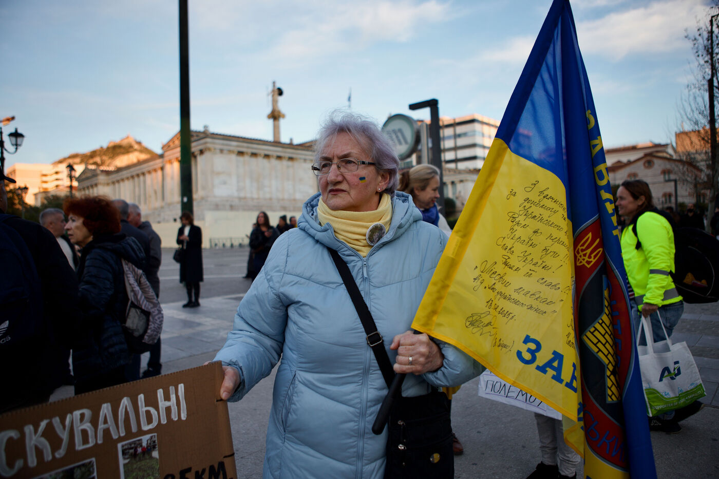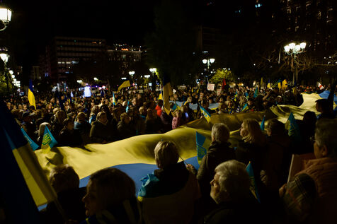 Children and women in traditional Ukrainian attire and flower crowns were seen staring at the camera or contemplative in the crowd. Marches progressed through the city centre towards Syntagma Square, with demonstrators waving blue and yellow flags and holding signs, including anti-Putin messages. At Syntagma, a massive crowd gathered, collectively waving a huge Ukrainian flag while chanting. Artworks by David Chichkan depicting anarchist-themed Ukrainian soldiers with Nestor Makhno were also displayed.