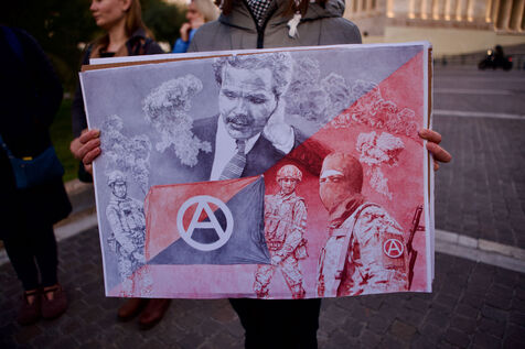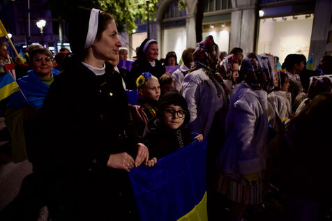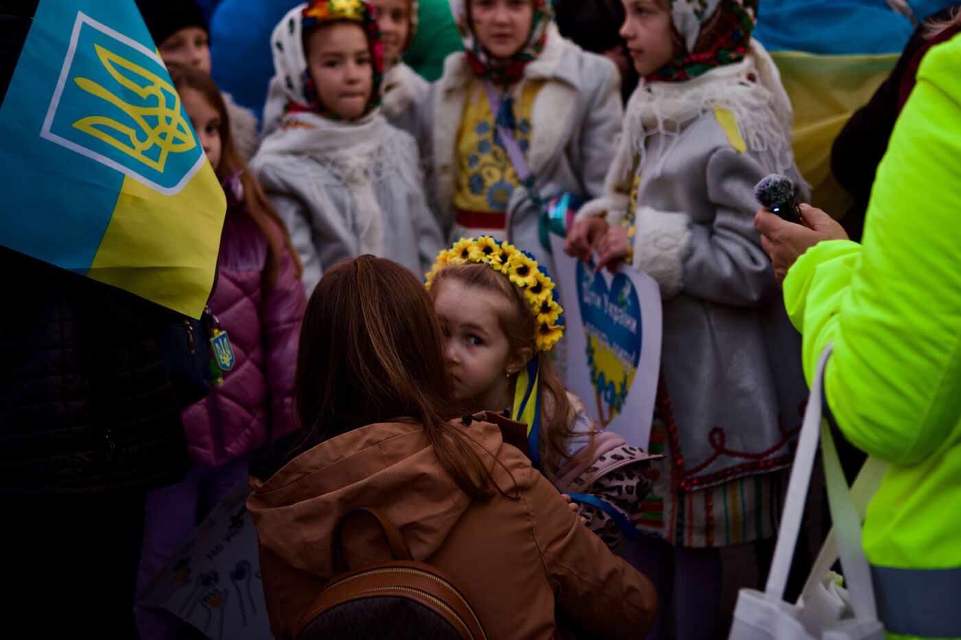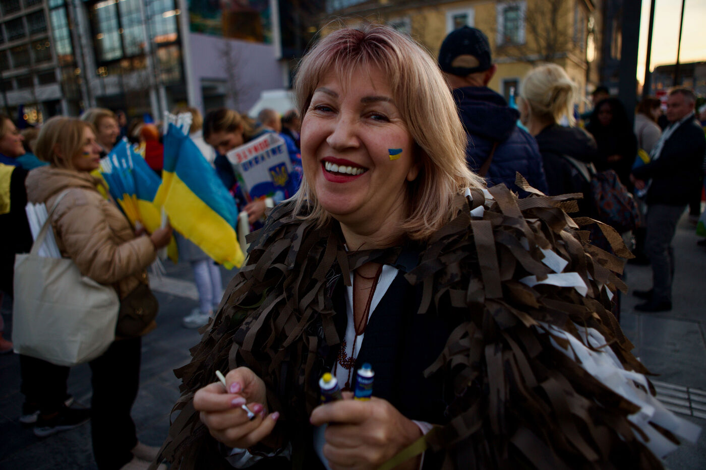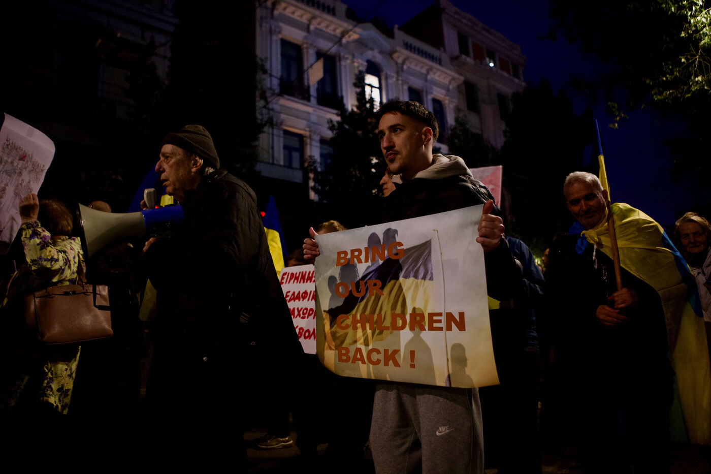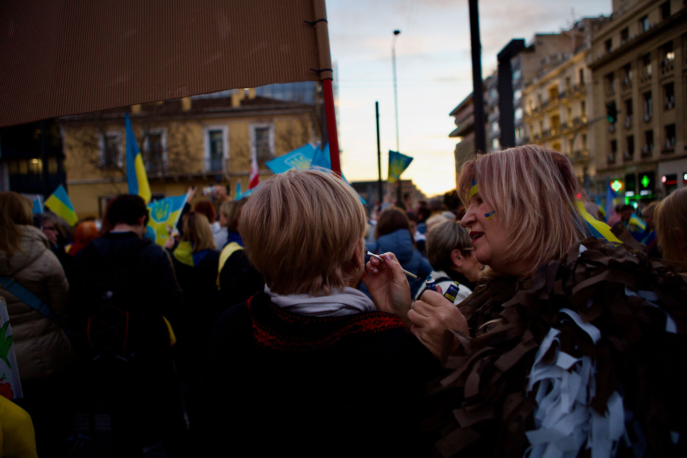 Children and women in traditional Ukrainian attire and flower crowns were seen staring at the camera or contemplative in the crowd. Marches progressed through the city centre towards Syntagma Square, with demonstrators waving blue and yellow flags and holding signs, including anti-Putin messages. At Syntagma, a massive crowd gathered, collectively waving a huge Ukrainian flag while chanting. Artworks by David Chichkan depicting anarchist-themed Ukrainian soldiers with Nestor Makhno were also displayed.