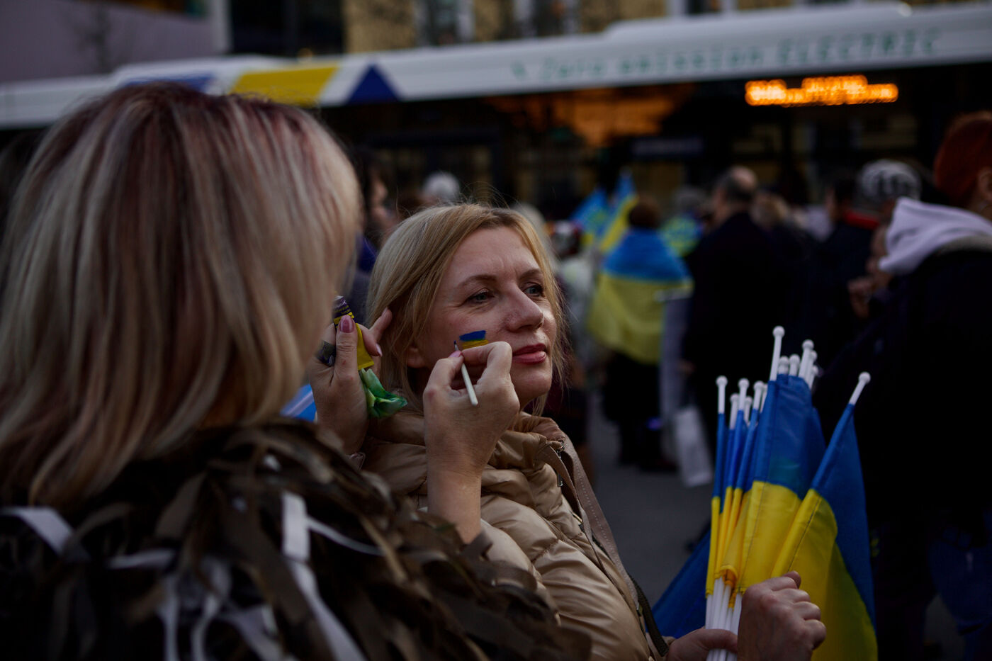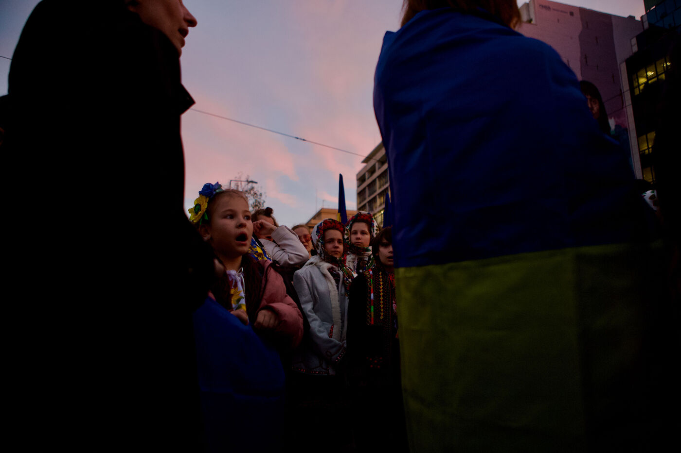Des enfants et des femmes portant des tenues traditionnelles ukrainiennes et des couronnes de fleurs regardaient l appareil photo ou semblaient contemplatifs dans la foule. Des marches ont traversé le centre-ville vers la place Syntagma, avec des manifestants agitants des drapeaux bleu et jaune et tenant des pancartes, y compris des messages anti-Poutine. Sur la place Syntagma, une foule massive se rassemblait, agitant collectivement un grand drapeau ukrainien tout en chantant. Des oeuvres de David Chichkan representant des soldats ukrainiens anarchistes avec Nestor Makhno etaient egalement exposees.