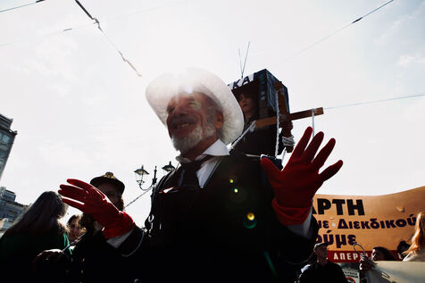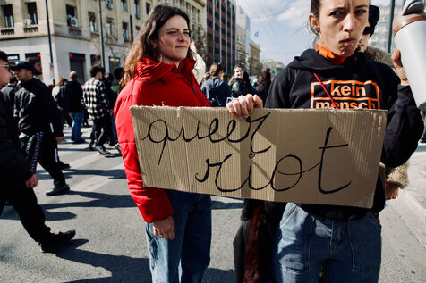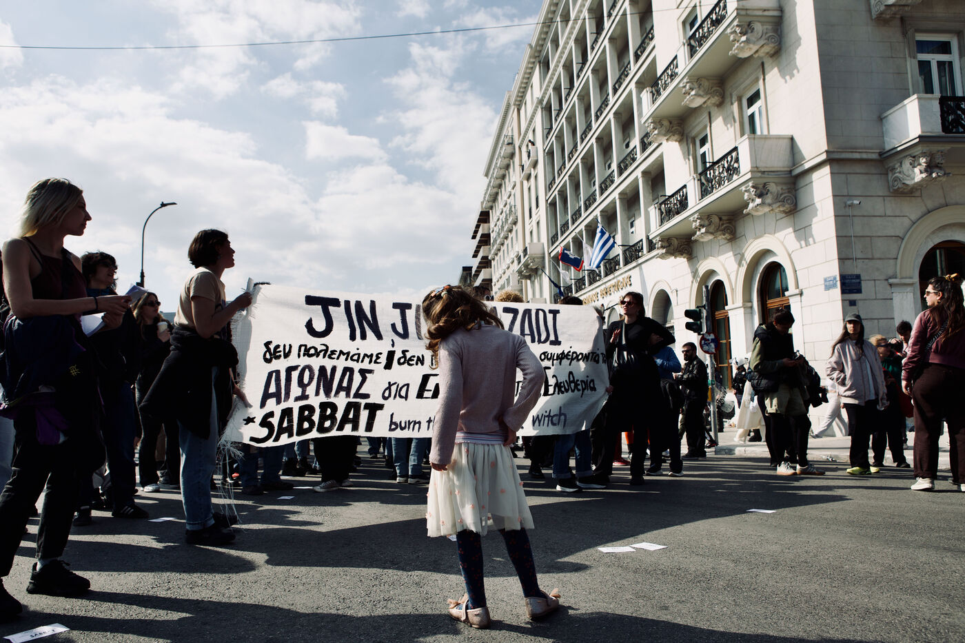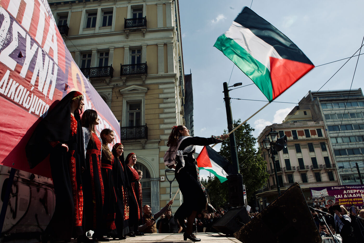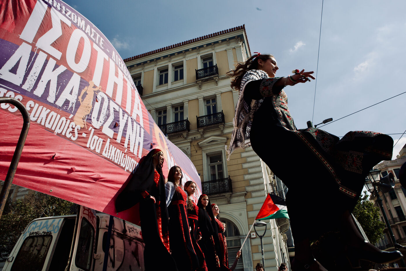 Across Athens city centre, demonstrators marked International Women’s Day with marches, street performances, and creative signage. From women dancing on stages in kufiye scarves to individuals waving flags for human and animal liberation, the protests combined satire, solidarity, and visual storytelling. The events highlighted feminist demands, queer visibility, and broader social justice causes, capturing the energy of collective civic engagement.