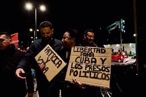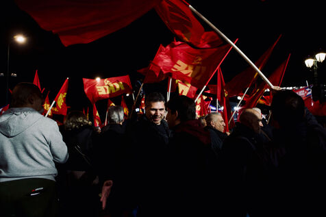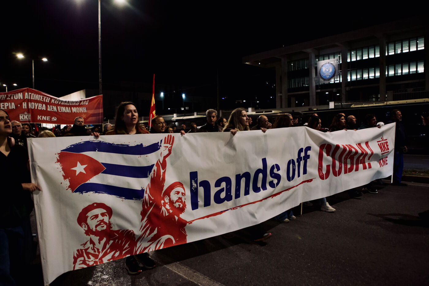 On March 11, 2026, KKE supporters filled Syntagma Square in Athens for a night rally showing solidarity with Cuba. Demonstrators held red flags and banners, including a “Hands Off Cuba” banner featuring Che Guevara and Fidel Castro, while children, activists, and wide crowds joined in. Leader Dimitris Koutsoumpas addressed the supporters as they marched toward the U.S. Embassy. Counter-demonstrators opposing Cuba were removed by security, adding tense moments to the politically charged atmosphere. Aerial and wide-angle shots captured the scale of the protest, highlighting banners, energetic flag waving, and expressions ranging from serious to smiling among participants.
