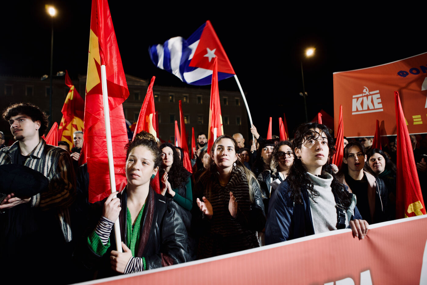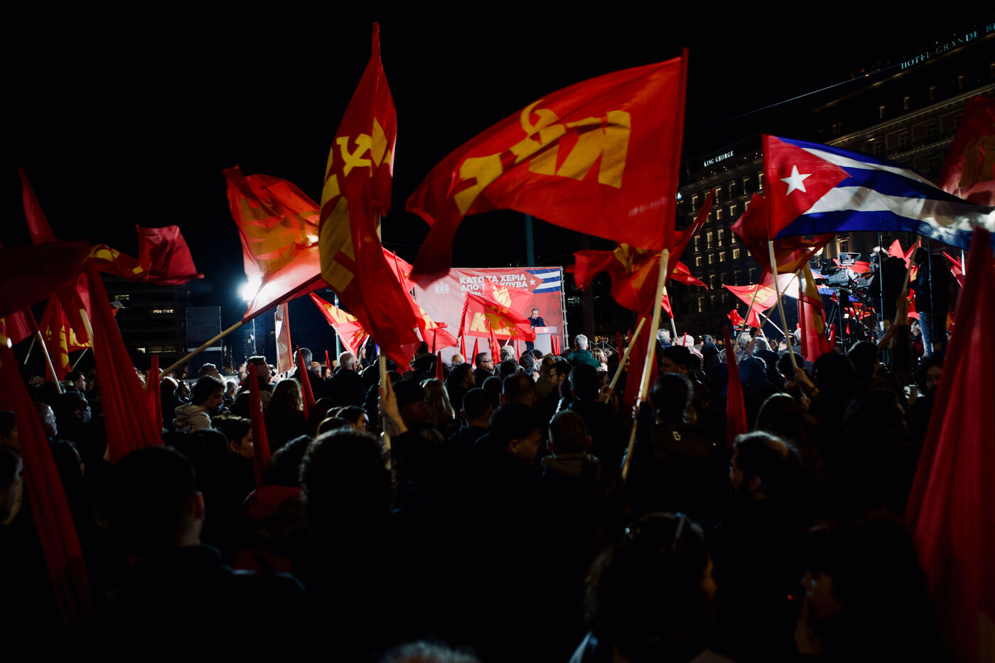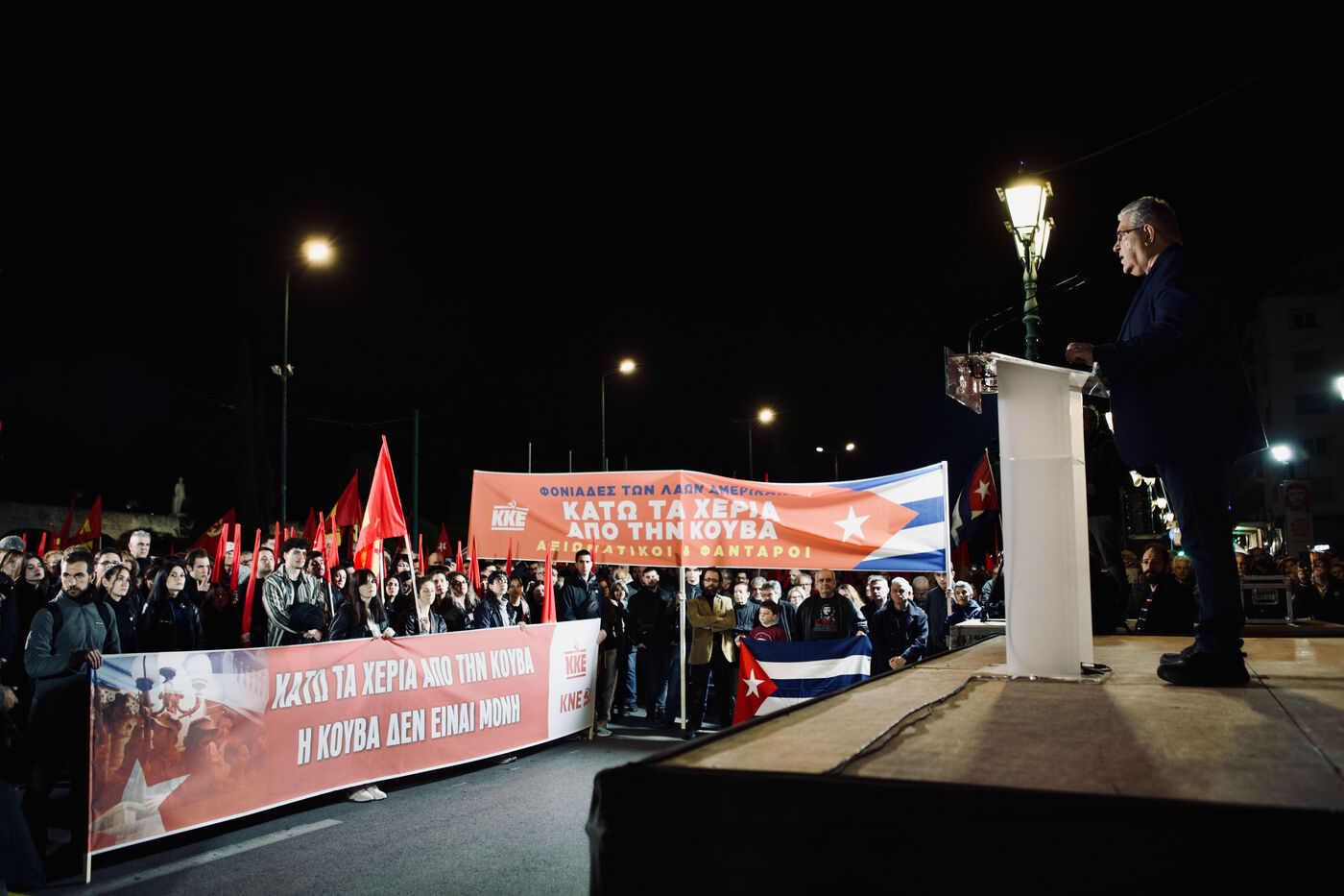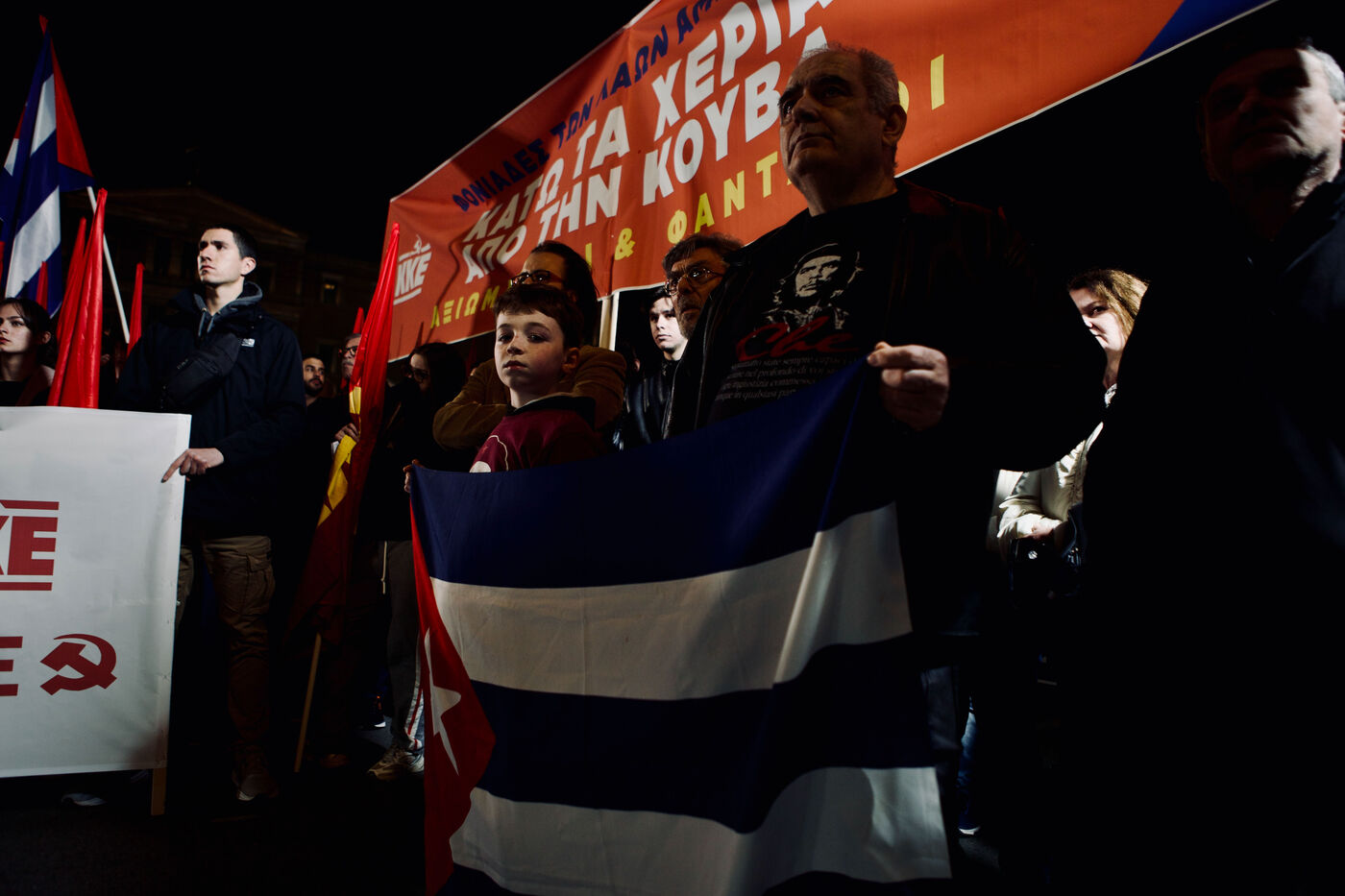 Le 11 mars 2026, les partisans du KKE ont rempli la place Syntagma à Athènes pour un rassemblement nocturne en solidarité avec Cuba. Les manifestants tenaient des drapeaux rouges et des banderoles, dont une banderole « Hands Off Cuba » avec Che Guevara et Fidel Castro, tandis que des enfants, activistes et une foule nombreuse participaient. Le leader Dimitris Koutsoumpas s’est adressé aux partisans alors qu’ils marchaient vers l’ambassade des États-Unis. Des contre-manifestants opposés à Cuba ont été escortés par la sécurité, ajoutant des moments de tension à l’atmosphère politique. Des prises de vue aériennes et grand-angle ont montré l’ampleur de la manifestation, mettant en avant les banderoles, l’agitation des drapeaux et les expressions des participants, sérieuses ou souriantes.
