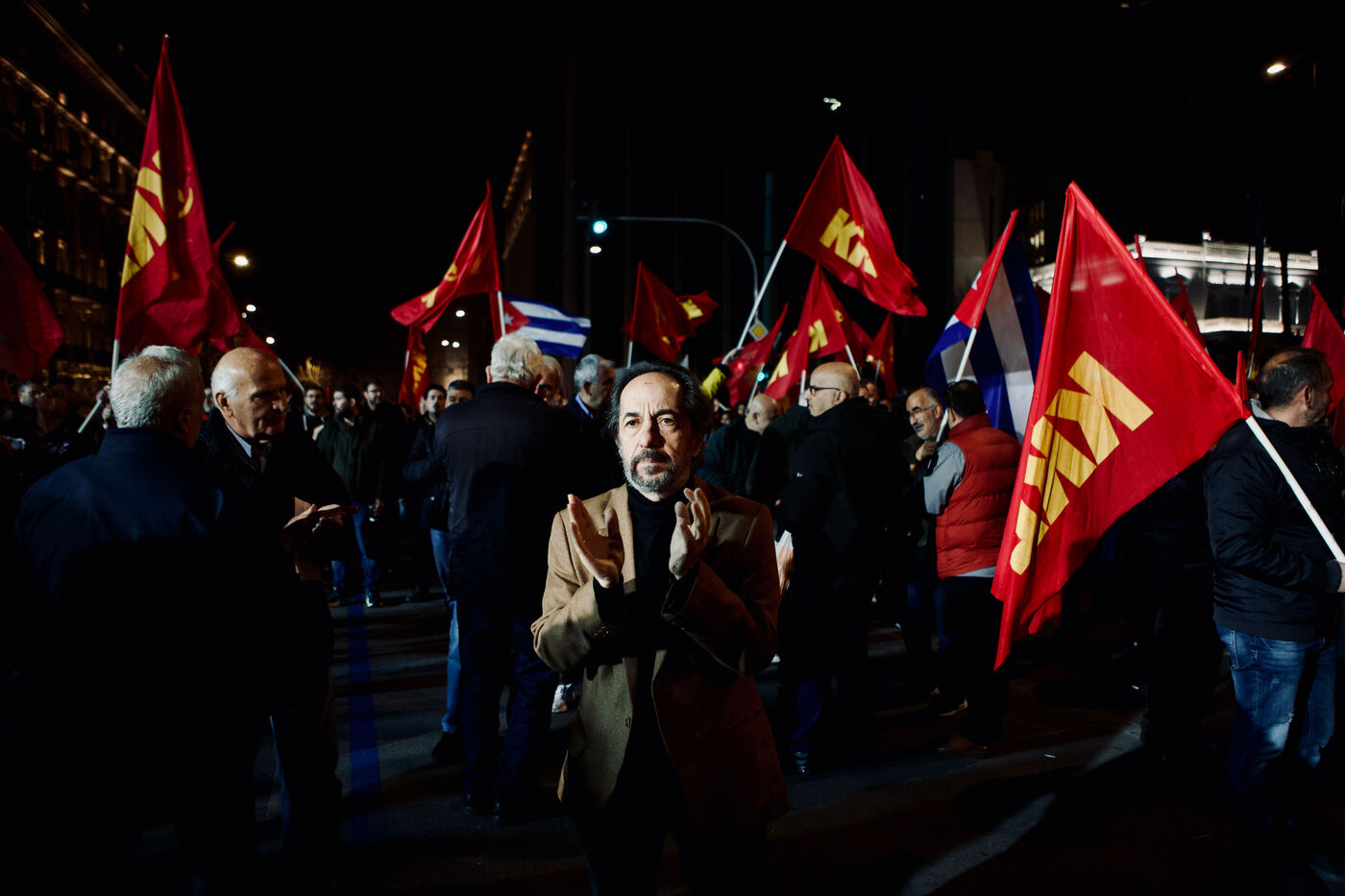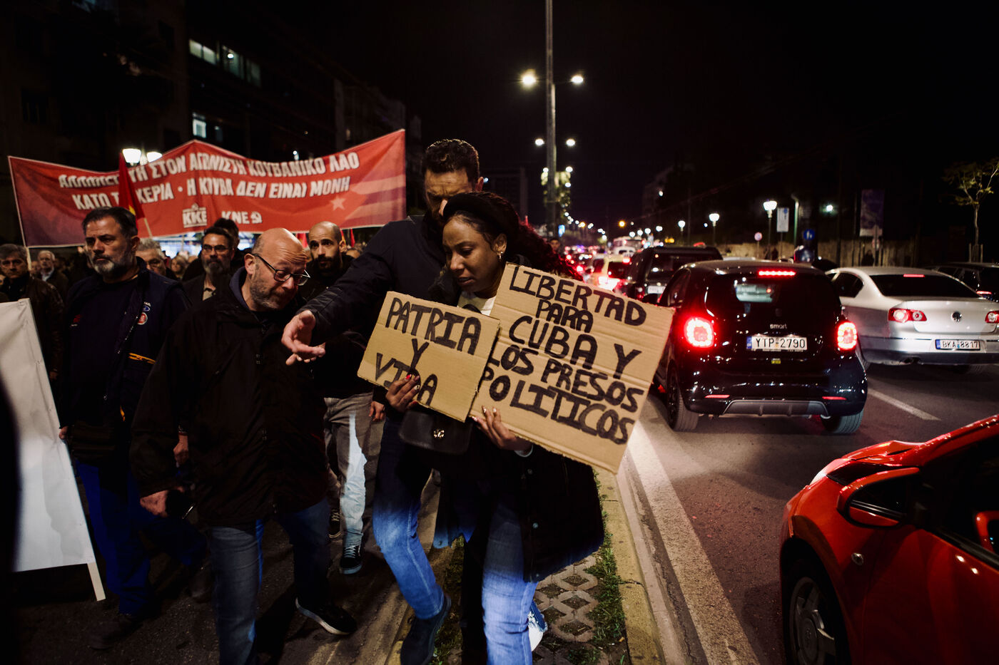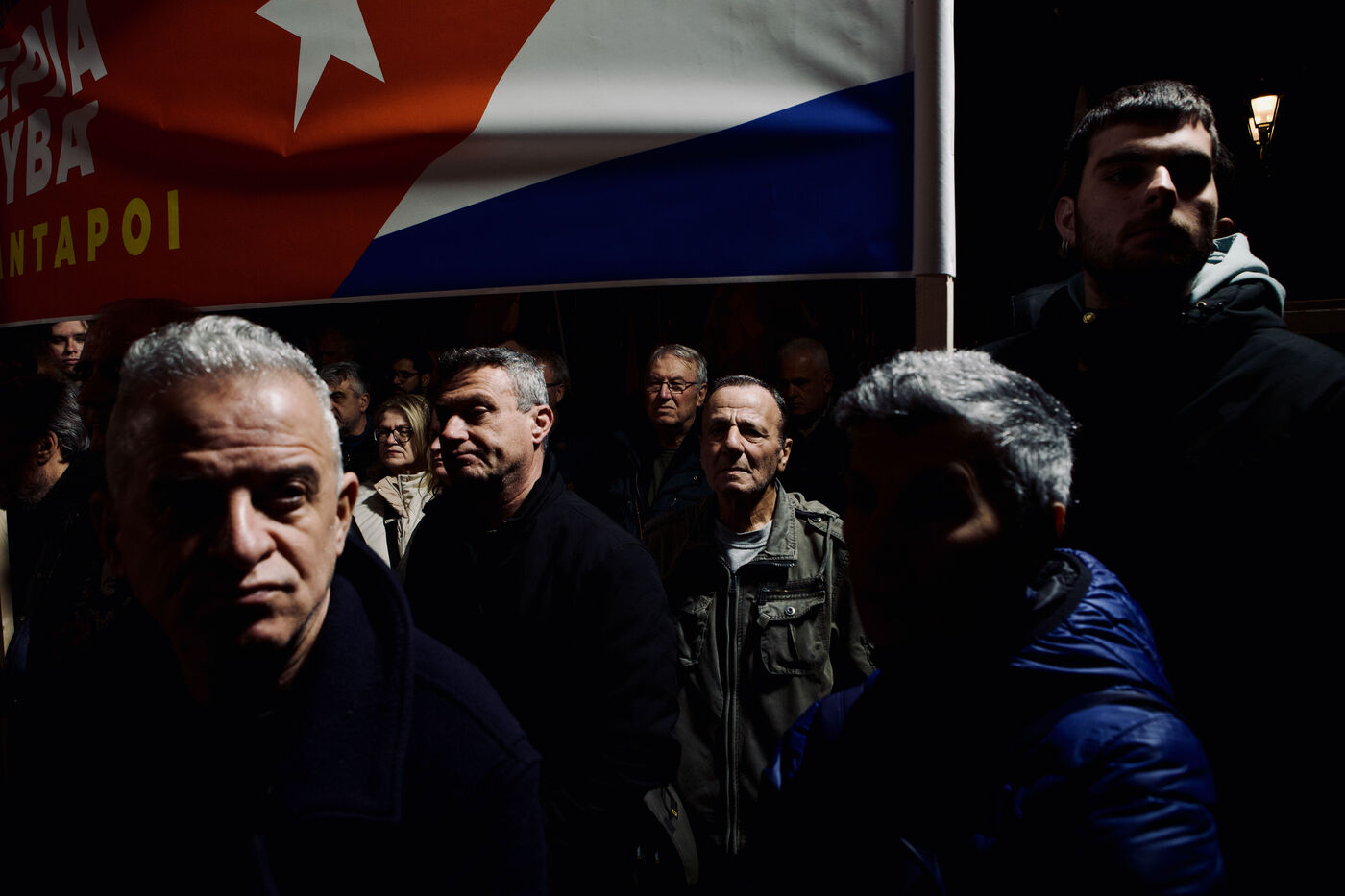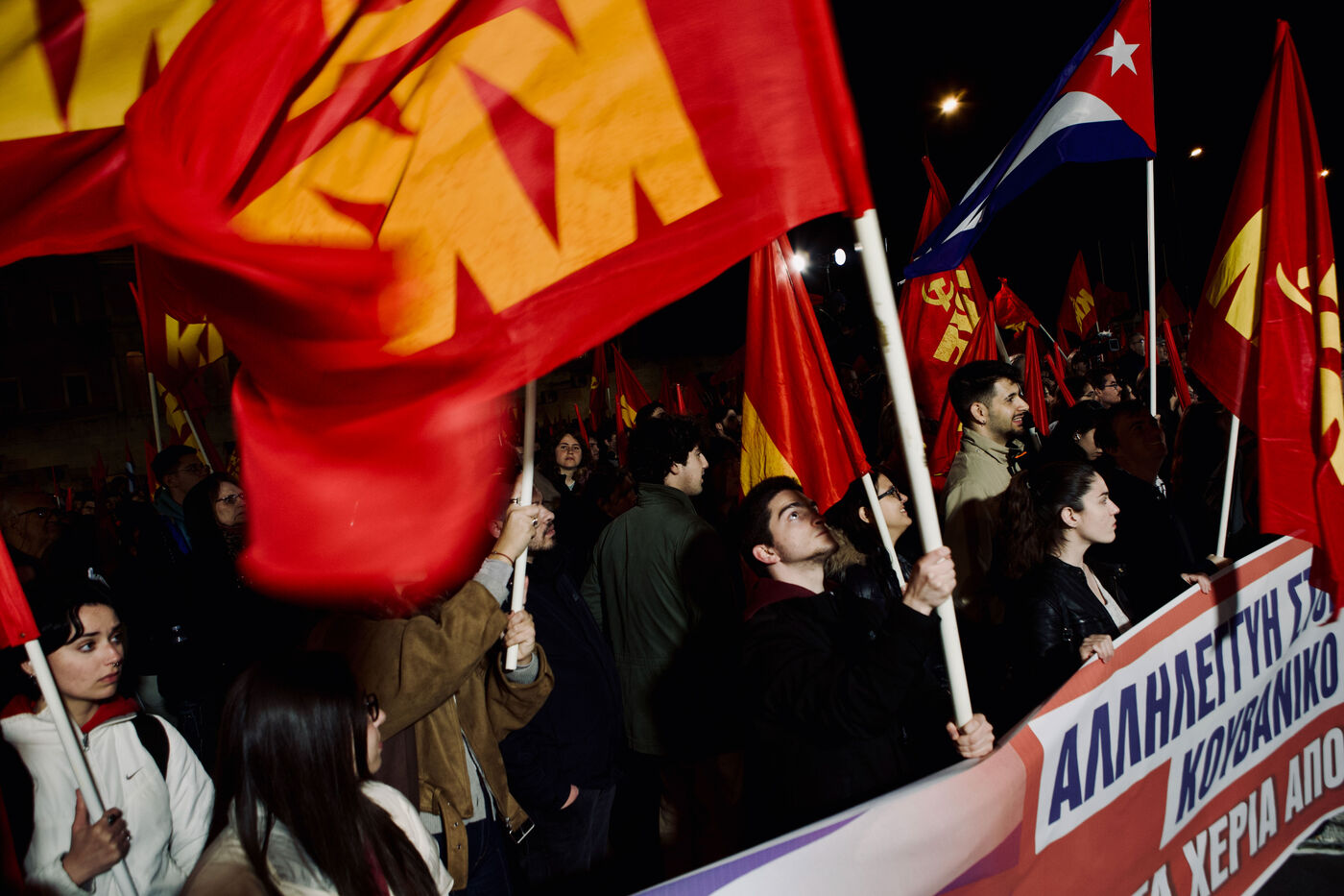 Le 11 mars 2026, les partisans du KKE ont rempli la place Syntagma à Athènes pour un rassemblement nocturne en solidarité avec Cuba. Les manifestants tenaient des drapeaux rouges et des banderoles, dont une banderole « Hands Off Cuba » avec Che Guevara et Fidel Castro, tandis que des enfants, activistes et une foule nombreuse participaient. Le leader Dimitris Koutsoumpas s’est adressé aux partisans alors qu’ils marchaient vers l’ambassade des États-Unis. Des contre-manifestants opposés à Cuba ont été escortés par la sécurité, ajoutant des moments de tension à l’atmosphère politique. Des prises de vue aériennes et grand-angle ont montré l’ampleur de la manifestation, mettant en avant les banderoles, l’agitation des drapeaux et les expressions des participants, sérieuses ou souriantes.