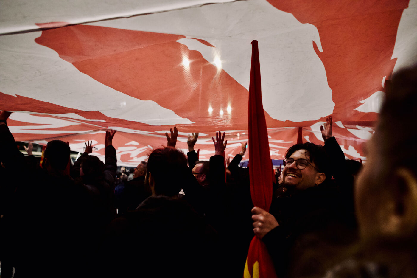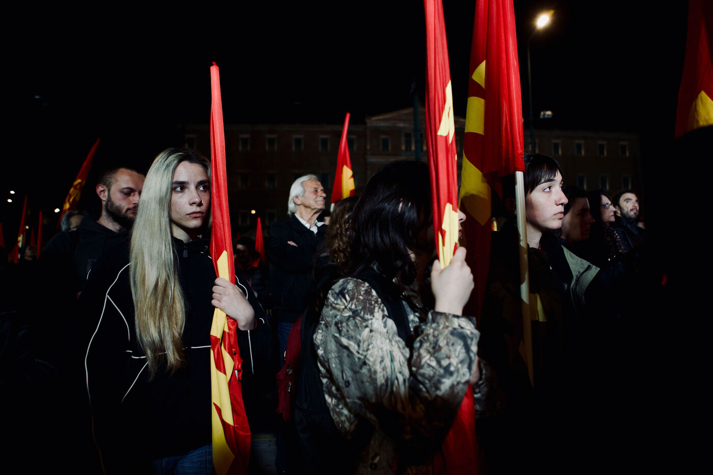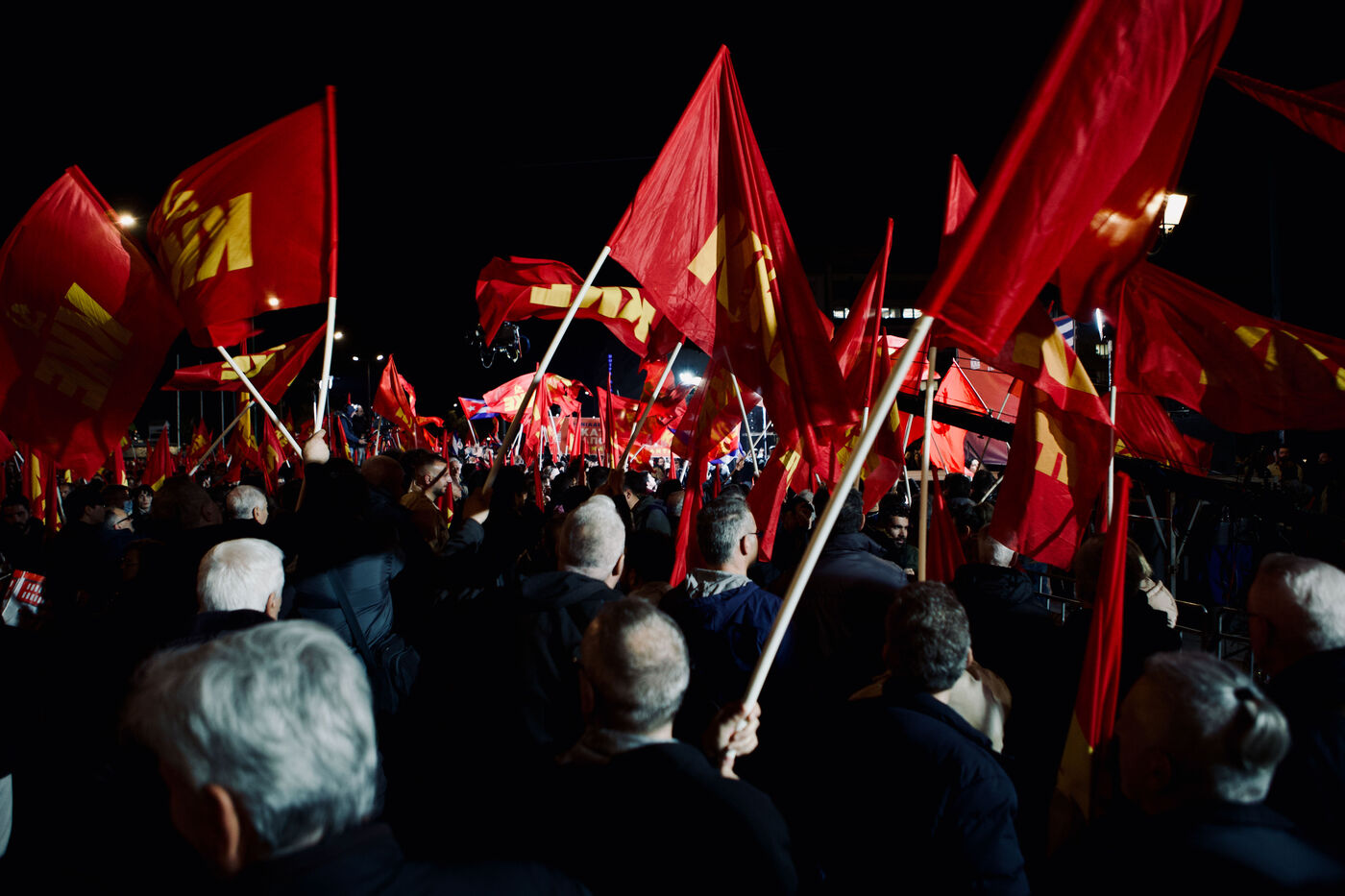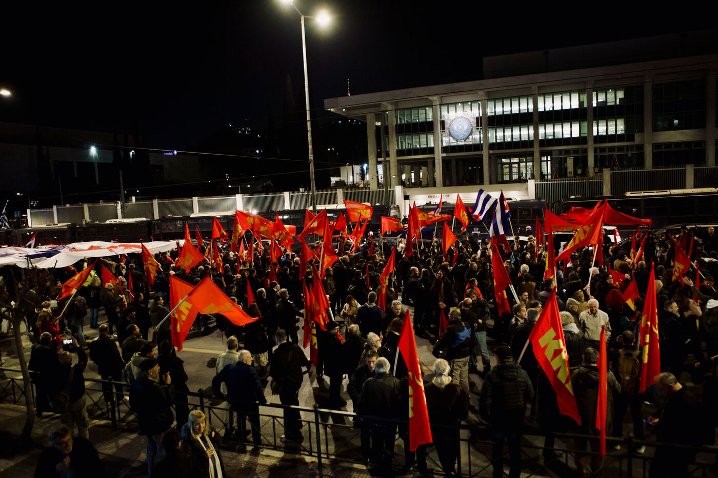 Le 11 mars 2026, les partisans du KKE ont rempli la place Syntagma à Athènes pour un rassemblement nocturne en solidarité avec Cuba. Les manifestants tenaient des drapeaux rouges et des banderoles, dont une banderole « Hands Off Cuba » avec Che Guevara et Fidel Castro, tandis que des enfants, activistes et une foule nombreuse participaient. Le leader Dimitris Koutsoumpas s’est adressé aux partisans alors qu’ils marchaient vers l’ambassade des États-Unis. Des contre-manifestants opposés à Cuba ont été escortés par la sécurité, ajoutant des moments de tension à l’atmosphère politique. Des prises de vue aériennes et grand-angle ont montré l’ampleur de la manifestation, mettant en avant les banderoles, l’agitation des drapeaux et les expressions des participants, sérieuses ou souriantes.