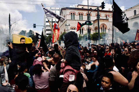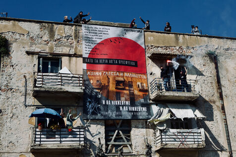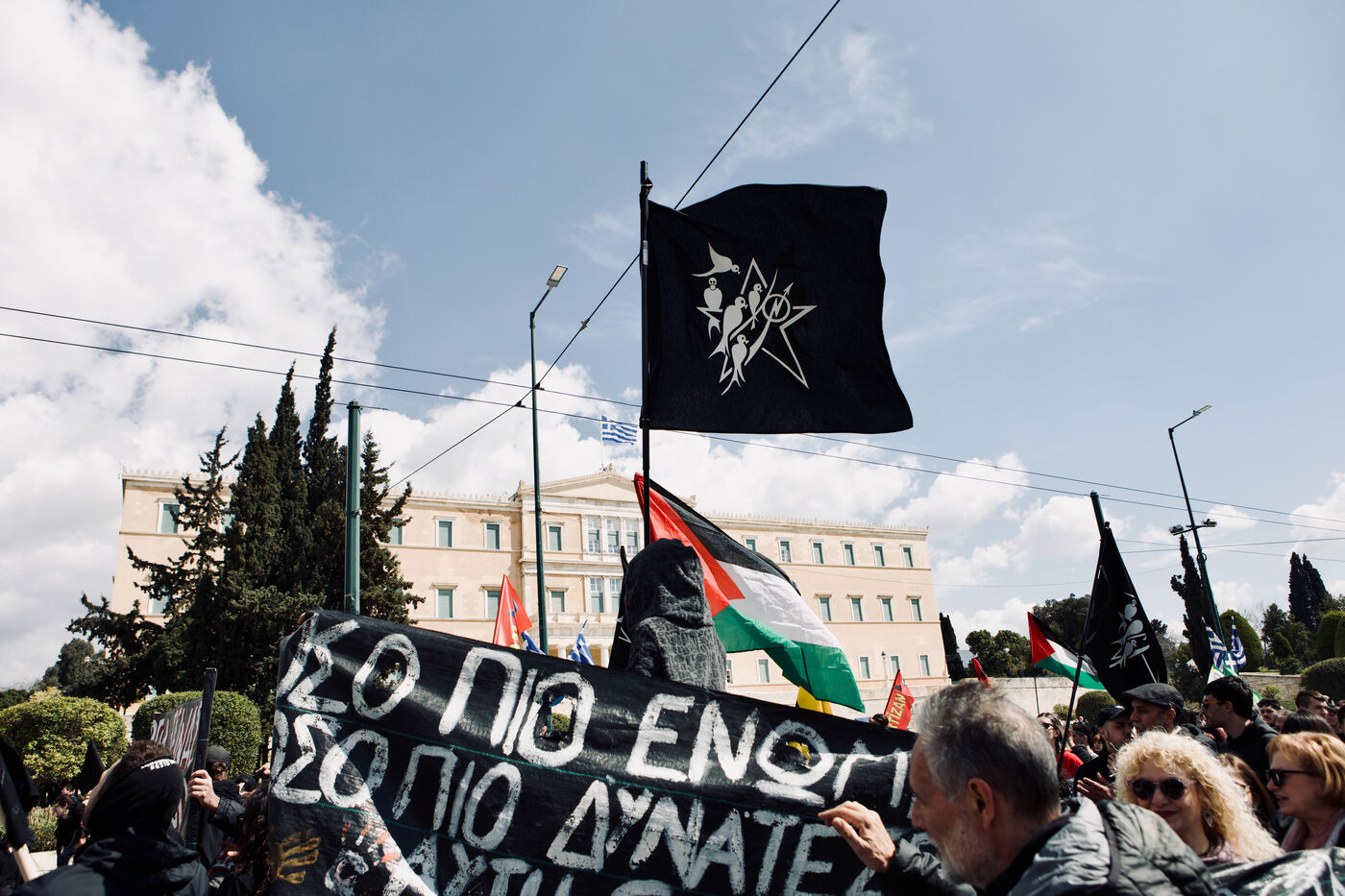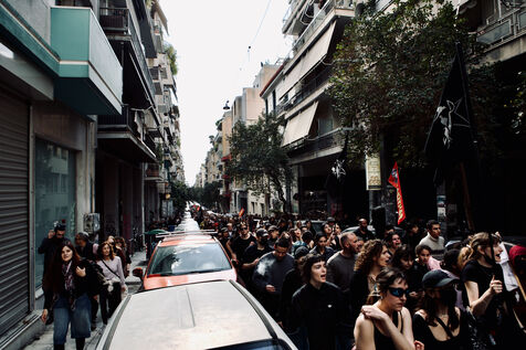 On April 5, 2026, Athens witnessed a long, vibrant march in support of the Prosfygika squat. Crowds filled the streets of the city centre and Exarcheia, carrying banners, flags—including YPJ and Palestinian symbols—and chanting in solidarity. Children peeked through dark banners, smiled, and held flags; musicians led the procession with lively sounds while Kurdish dances punctuated the demonstration. Riot police maintained vigilance along the route. Activists, including Aristotelis Hantzis on his 60th day of hunger strike, joined the rally, and supporters threw down large banners from the Prosfygika building. The event blended cultural expression, political protest, and public solidarity with refugees.