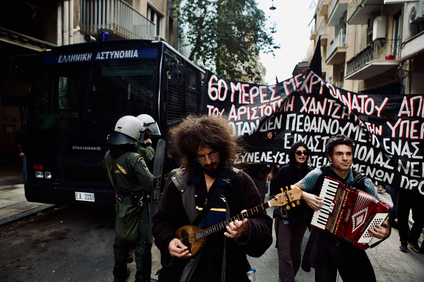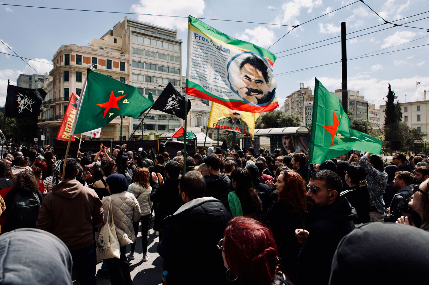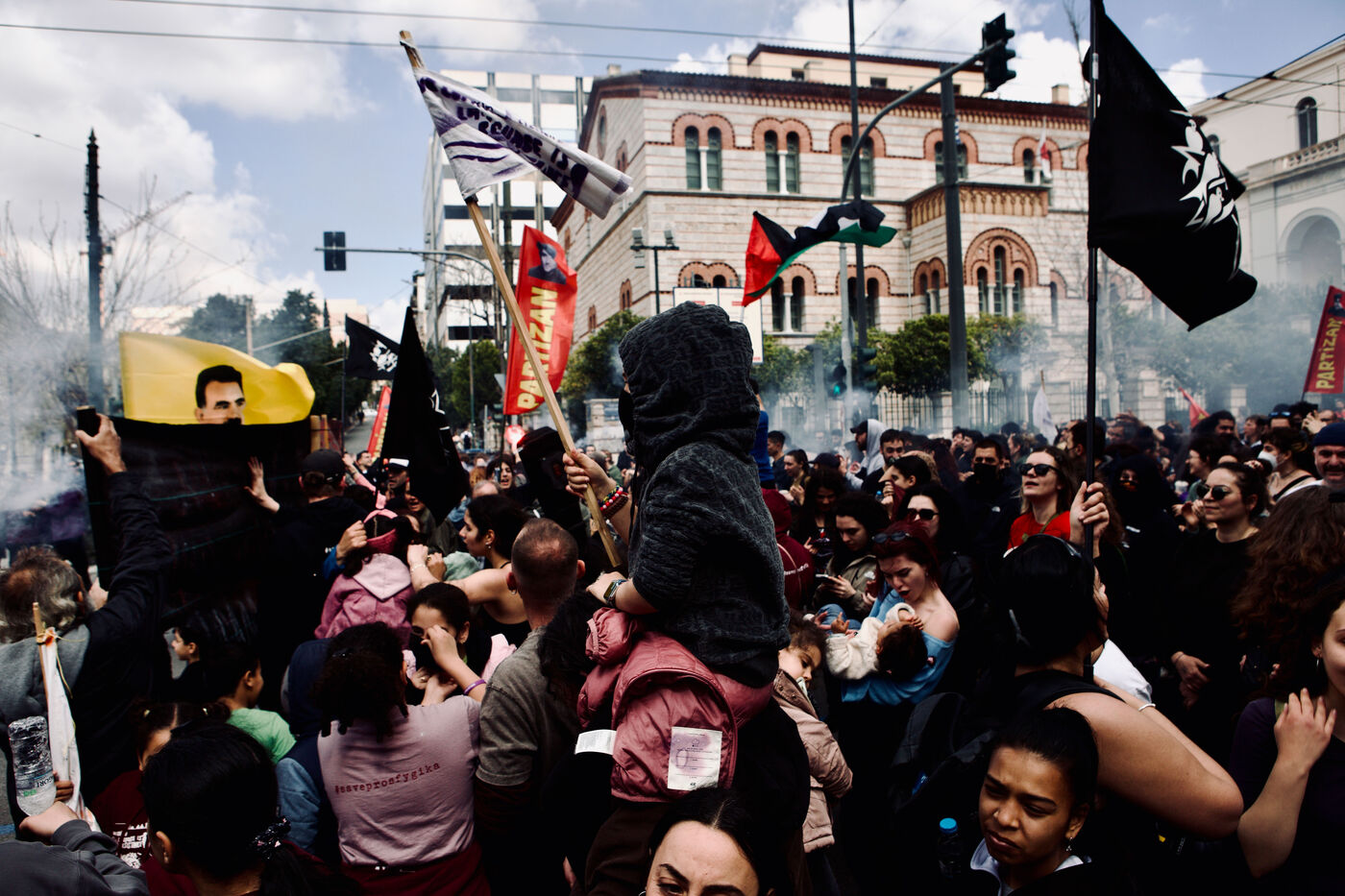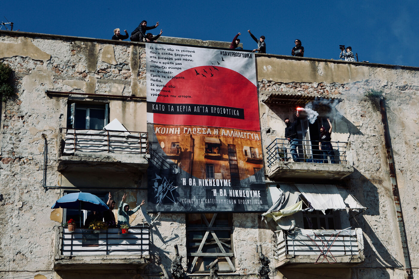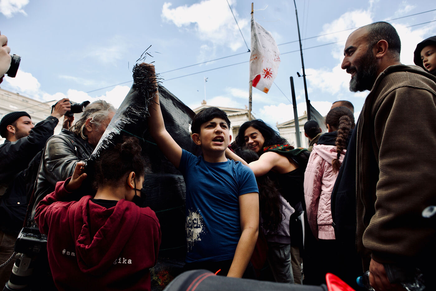 Le 5 avril 2026, Athènes a été le théâtre d’un long et vibrant cortège en soutien au squat Prosfygika. Les foules ont investi le centre-ville et le quartier d’Exarcheia, brandissant banderoles, drapeaux — dont ceux du YPJ et de la Palestine — et scandant des slogans de solidarité. Des enfants regardaient à travers des bâches sombres, souriaient et tenaient des drapeaux ; des musiciens ouvraient le cortège avec des sons entraînants tandis que des danses kurdes ponctuaient la manifestation. Les policiers anti-émeute assuraient la vigilance le long du parcours. Des activistes, dont Aristotelis Hantzis au 60ᵉ jour de sa grève de la faim, ont rejoint le rassemblement, et des banderoles ont été jetées depuis le bâtiment Prosfygika. L’événement a mêlé expression culturelle, protestation politique et solidarité publique envers les réfugiés.