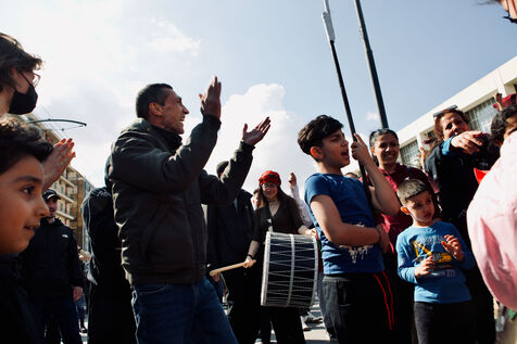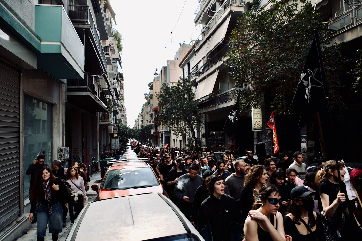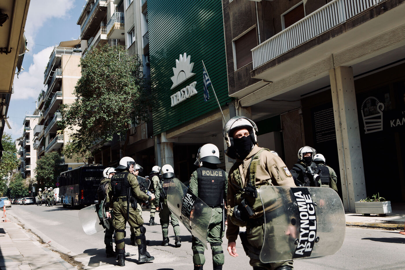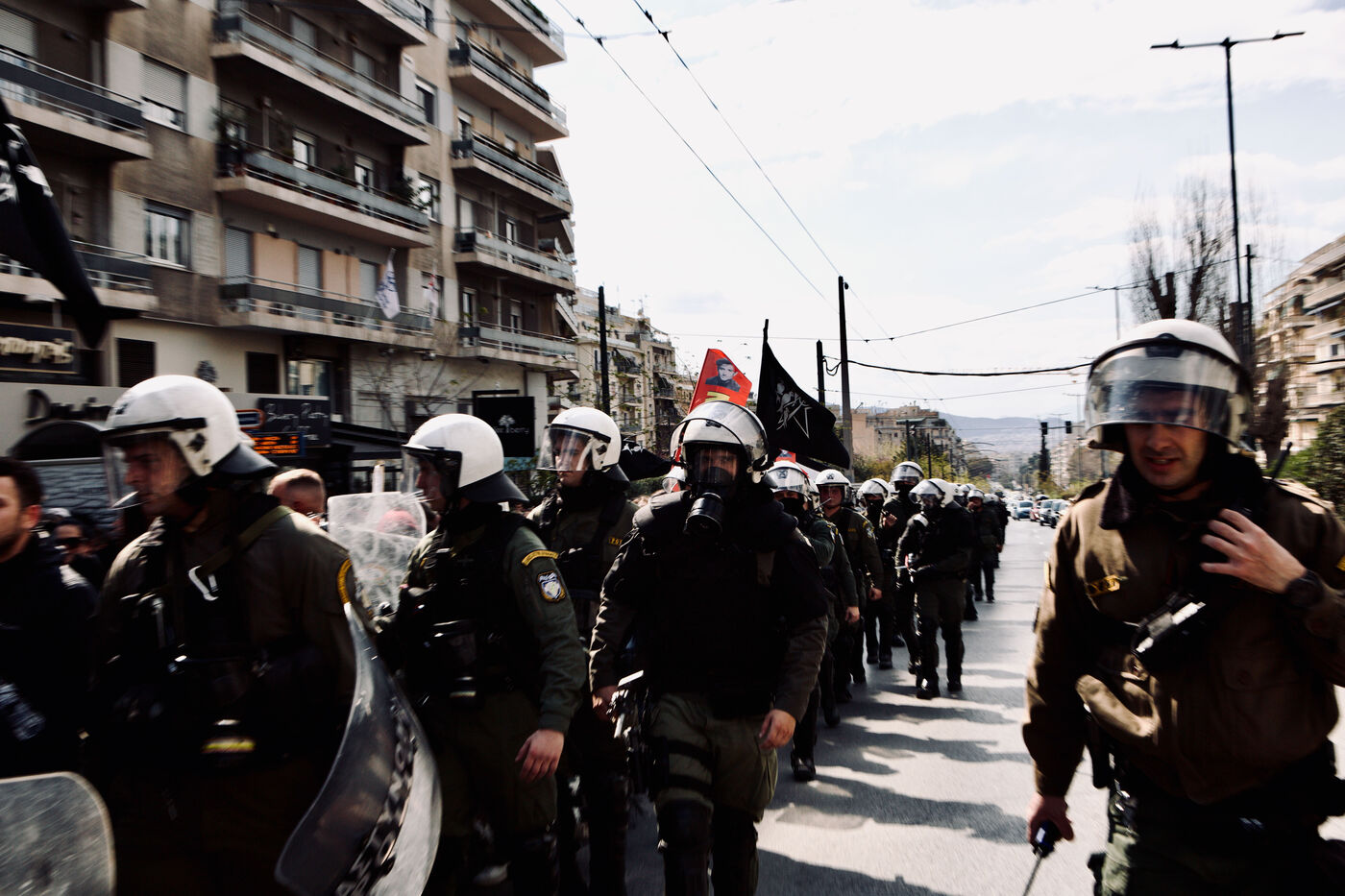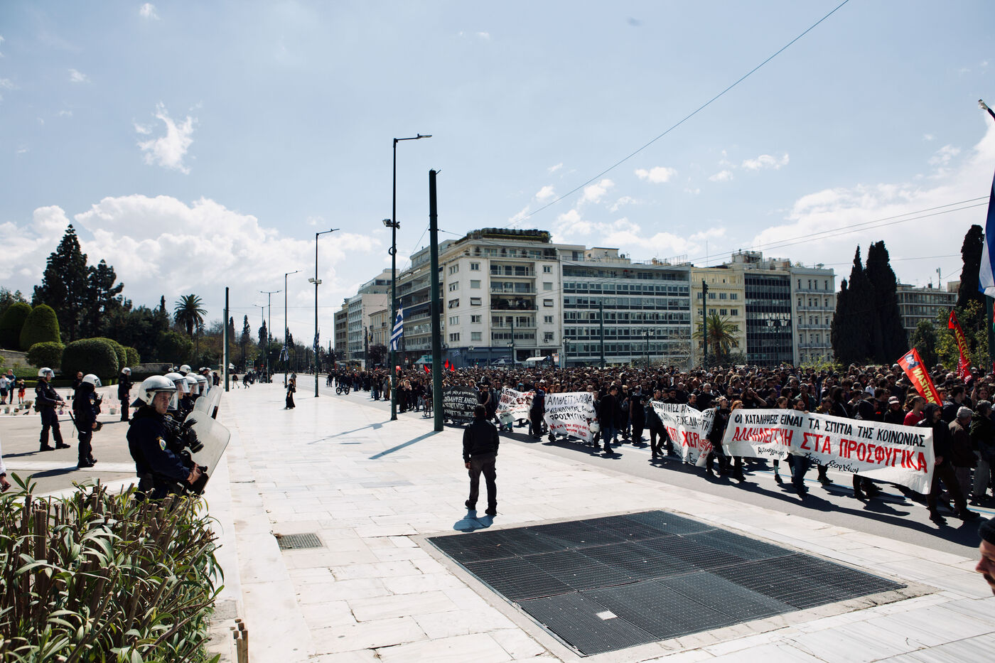 Le 5 avril 2026, Athènes a été le théâtre d’un long et vibrant cortège en soutien au squat Prosfygika. Les foules ont investi le centre-ville et le quartier d’Exarcheia, brandissant banderoles, drapeaux — dont ceux du YPJ et de la Palestine — et scandant des slogans de solidarité. Des enfants regardaient à travers des bâches sombres, souriaient et tenaient des drapeaux ; des musiciens ouvraient le cortège avec des sons entraînants tandis que des danses kurdes ponctuaient la manifestation. Les policiers anti-émeute assuraient la vigilance le long du parcours. Des activistes, dont Aristotelis Hantzis au 60ᵉ jour de sa grève de la faim, ont rejoint le rassemblement, et des banderoles ont été jetées depuis le bâtiment Prosfygika. L’événement a mêlé expression culturelle, protestation politique et solidarité publique envers les réfugiés.