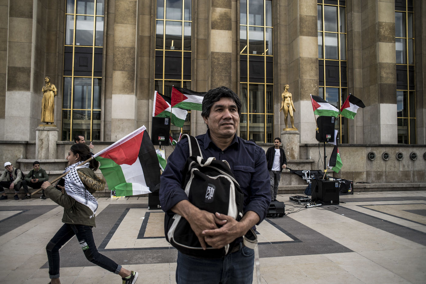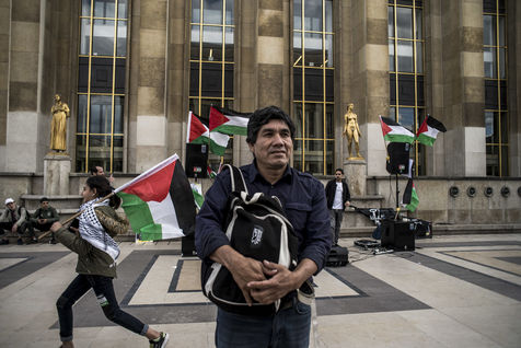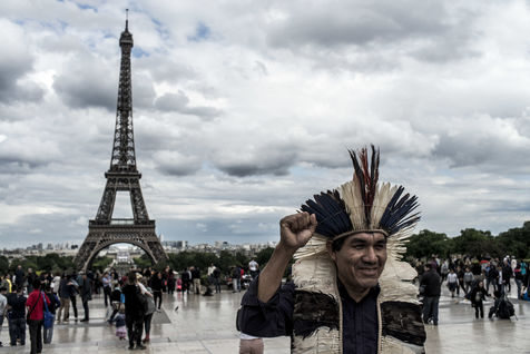 À l'occasion de la tournée européenne de Ladio Véron, le représentant du peuple Guarani-Kaiowa un rassemblement à eu lieu au Trocadéro à Paris. Cette tournée qui vise à dénoncer la forte répression dont est victime la tribu, ainsi que tous les indigènes au Brésil, qui réclament par ailleurs une démarcation de leurs terres par le gouvernement. Le représentant de la tribu des Guarani-Kaiowá du Brésil, Ladio Veron sera reçu au Sénat le 23 mai de 9h30 à 12h à l'occasion d'une réunion publique. Paris, France - 20 mai 2017.