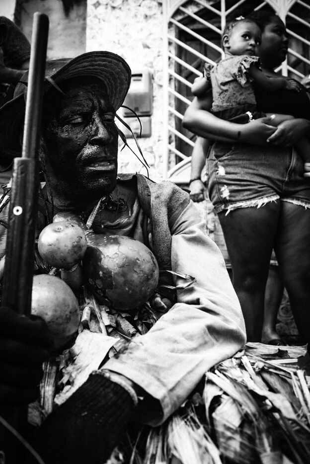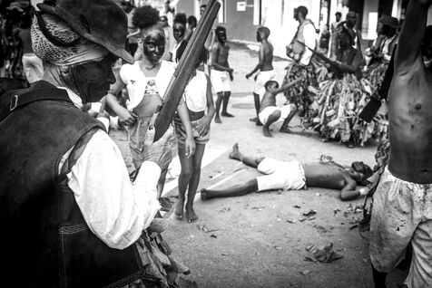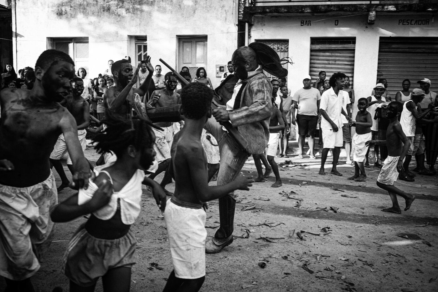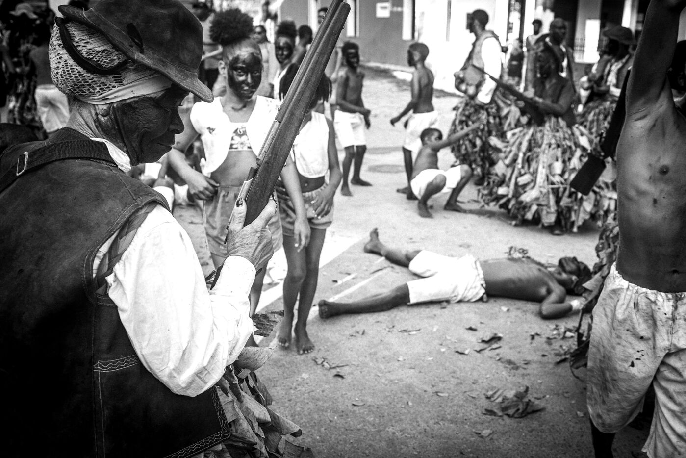 La série présentée ici est un regard sur des manifestations culturelles liées aux peuples de la diaspora africaine, arrachés de leurs territoires pour être envoyés au Brésil comme esclaves. Une fois arrivés au Brésil, les esclaves qui arrivaient à fuir leurs oppresseurs pouvaient parfois trouver refuge dans des territoires bien cachés, les quilombos. Parmi les innombrables manifestations culturelles liées aux peuples Bantous, Yorubas, Fon et Ewe, Mandés, Minas, Hausas, Ashantis, Malinkés, Nego fugido (noir fugitif) est l'une des plus importantes manifestations de l’état de Bahia. Nego fugido n’est pas inscrit dans les livres de l’histoire o cielle du Brésil, et les registres perme ant de dater la période de sa naissance sont inexistants, mais le recueil des traditions orales et des témoignages remonte à la période du XIXe siècle. Nego Fugido est une cérémonie théâtrale qui a émergé à Acupe, territoire quilombola situé dans les environs de la ville de Santo Amaro. Ce e cérémonie est née principalement pour faire parler des morts et des malheurs causés par les siècles d’esclavage. Parmi ses personnages, on compte les “negas”, “capitães do mato”, la “police”, “l’empereur” et la “princesse”, qui représentent la lu e contre l’esclavage. Contrairement à ce qui a été écrit par “l’histoire o cielle”, où la fin de l’esclavage au Brésil aurait été “accordée” par la bonne volonté de la famille royale, Nego Fugido raconte une histoire marquée par les lu es des peuples quilombolas, qui sont les véritables acteurs historiques de la conquête de leur liberté. Ce e histoire est celle de leur rébellion et de leur combat pour arracher leur liberté des mains des seigneurs. Les cérémonies théâtrales de Nego Fugido ont lieu tous les dimanches du mois de juillet dans les rues d’Acupe. Nego Fugido est une démonstration de la résistance culturelle au fil du temps comme un facteur générateur et de maintien d’une culture de résistance.