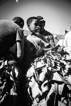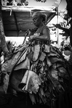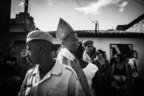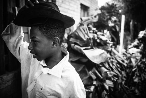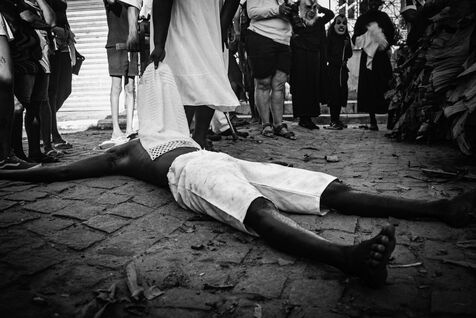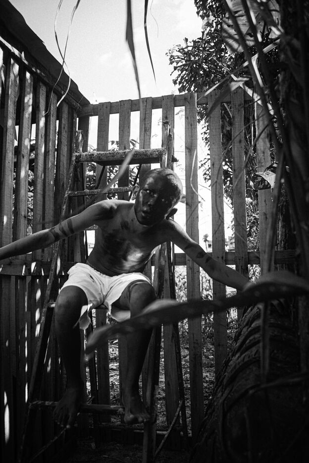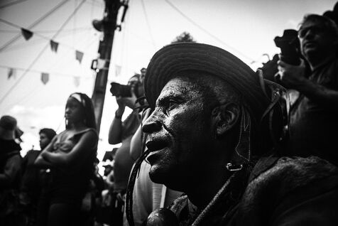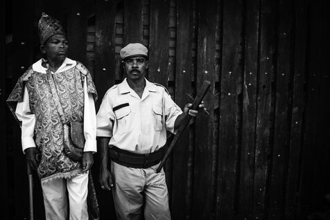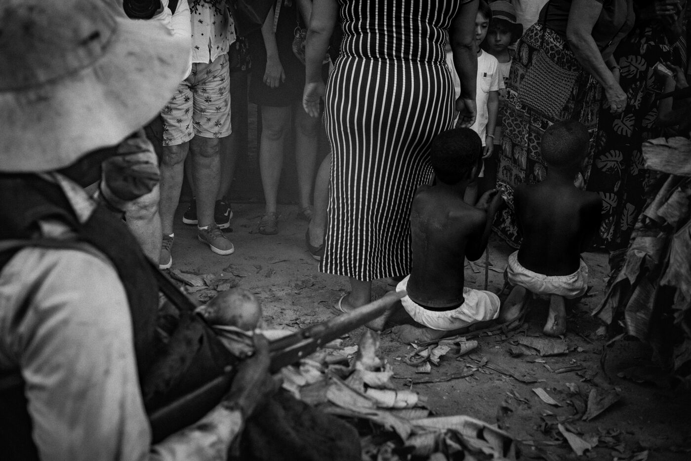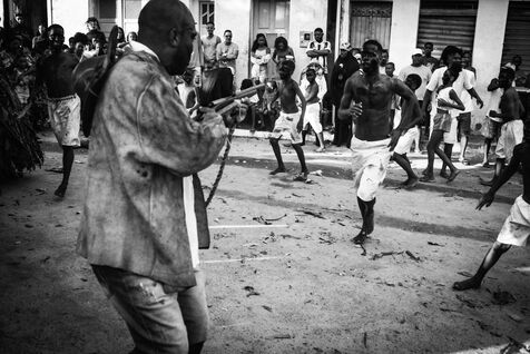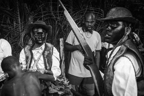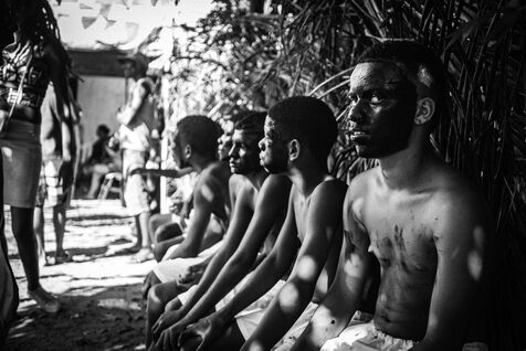 La série présentée ici est un regard sur des manifestations culturelles liées aux peuples de la diaspora africaine, arrachés de leurs territoires pour être envoyés au Brésil comme esclaves. Une fois arrivés au Brésil, les esclaves qui arrivaient à fuir leurs oppresseurs pouvaient parfois trouver refuge dans des territoires bien cachés, les quilombos. Parmi les innombrables manifestations culturelles liées aux peuples Bantous, Yorubas, Fon et Ewe, Mandés, Minas, Hausas, Ashantis, Malinkés, Nego fugido (noir fugitif) est l'une des plus importantes manifestations de l’état de Bahia. Nego fugido n’est pas inscrit dans les livres de l’histoire o cielle du Brésil, et les registres perme ant de dater la période de sa naissance sont inexistants, mais le recueil des traditions orales et des témoignages remonte à la période du XIXe siècle. Nego Fugido est une cérémonie théâtrale qui a émergé à Acupe, territoire quilombola situé dans les environs de la ville de Santo Amaro. Ce e cérémonie est née principalement pour faire parler des morts et des malheurs causés par les siècles d’esclavage. Parmi ses personnages, on compte les “negas”, “capitães do mato”, la “police”, “l’empereur” et la “princesse”, qui représentent la lu e contre l’esclavage. Contrairement à ce qui a été écrit par “l’histoire o cielle”, où la fin de l’esclavage au Brésil aurait été “accordée” par la bonne volonté de la famille royale, Nego Fugido raconte une histoire marquée par les lu es des peuples quilombolas, qui sont les véritables acteurs historiques de la conquête de leur liberté. Ce e histoire est celle de leur rébellion et de leur combat pour arracher leur liberté des mains des seigneurs. Les cérémonies théâtrales de Nego Fugido ont lieu tous les dimanches du mois de juillet dans les rues d’Acupe. Nego Fugido est une démonstration de la résistance culturelle au fil du temps comme un facteur générateur et de maintien d’une culture de résistance.