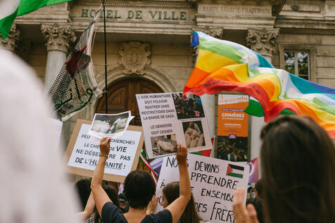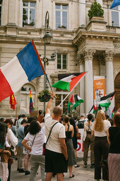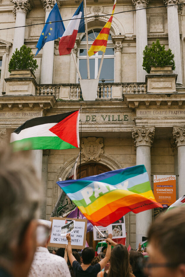On the square, Palestinian, French, and LFI (La France Insoumise) flags flew alongside a rainbow flag bearing the word “Peace.” Demonstrators held signs calling for solidarity with the Palestinian people and respect for international law. Activists, citizens, and supporters urged the French and European governments to take firm action to secure the release of those detained and to condemn violations of maritime law and human rights.