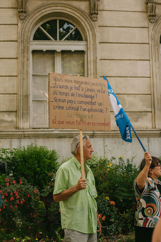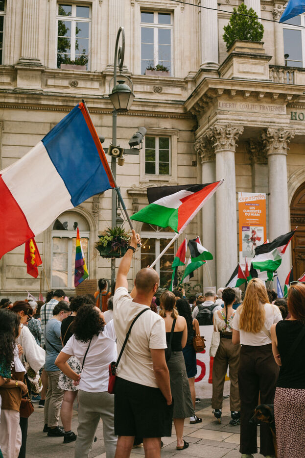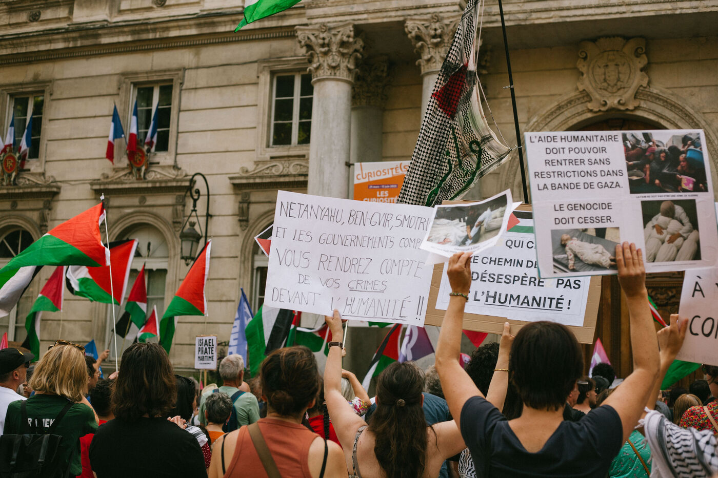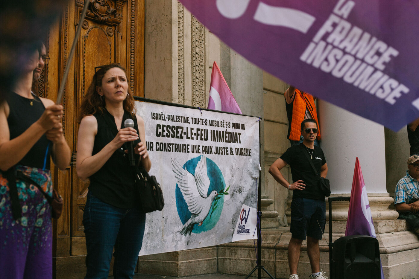 Sur la place, drapeaux palestiniens, français et LFI (La France Insoumise) flottaient aux côtés d’un drapeau arc-en-ciel porteur du mot « Paix ». Les manifestants ont brandi des pancartes appelant à la solidarité avec le peuple palestinien et au respect du droit international. Militants, citoyens et activistes ont exhorté les gouvernements français et européens à intervenir fermement pour la libération des détenus et à condamner les violations du droit maritime et des droits humains.
