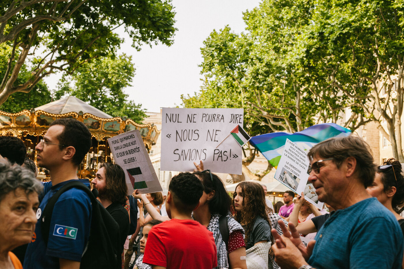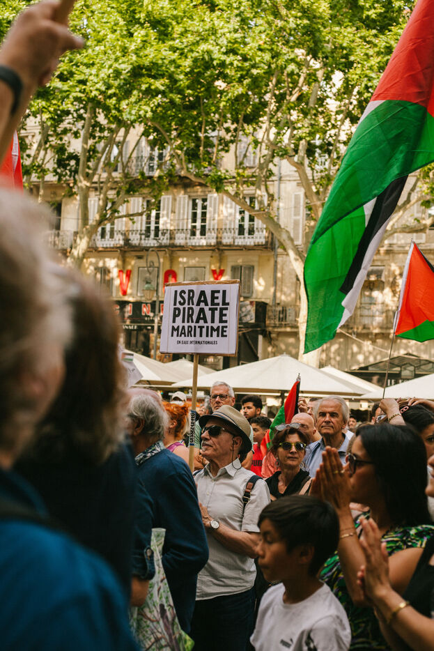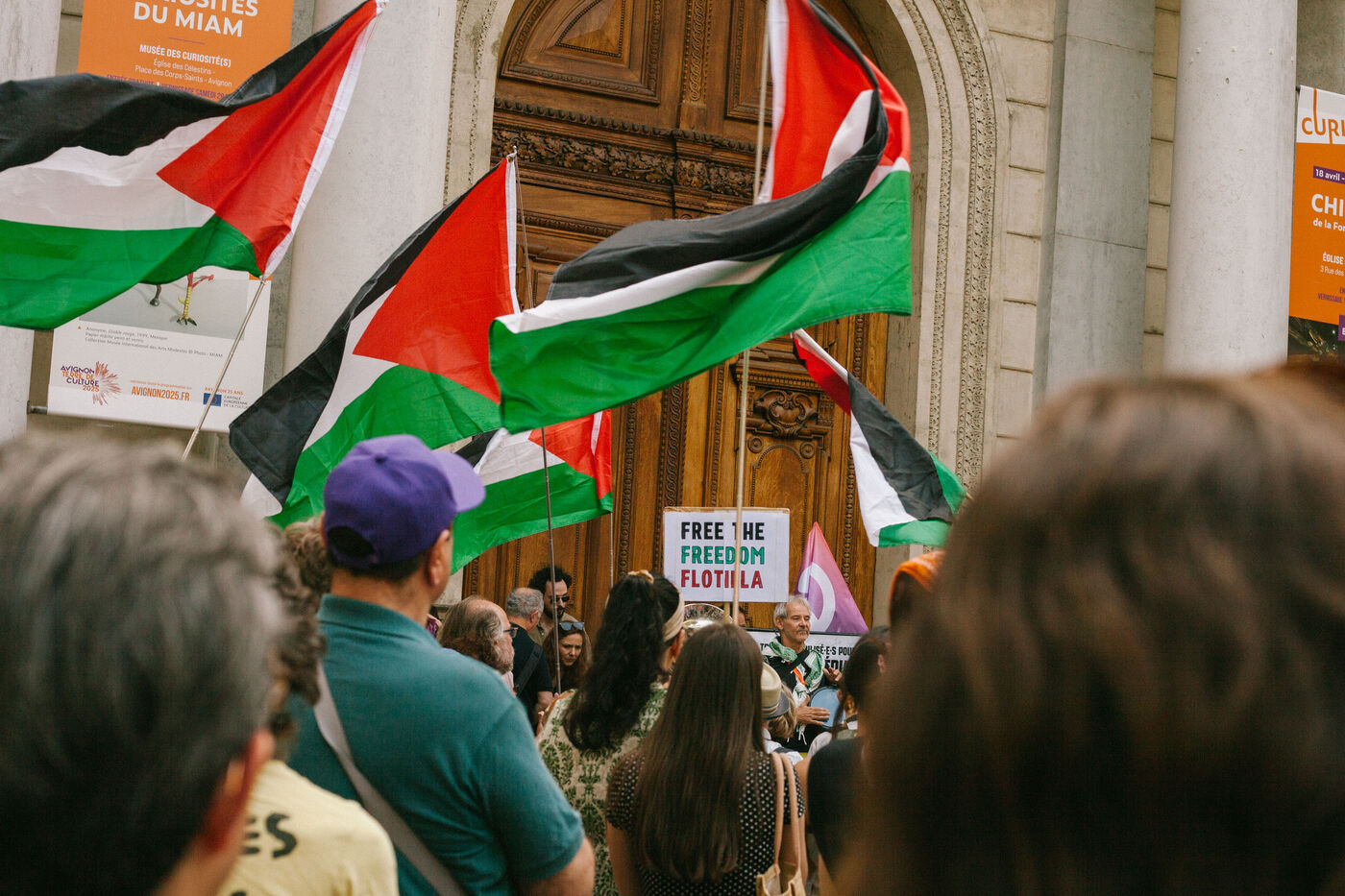 A spontaneous gathering was held on Monday, June 9, 2025, at Place de l’Horloge in Avignon, in solidarity with the Freedom Flotilla, Rima Hassan, Greta Thunberg, and twelve peaceful activists, including six French nationals, who were illegally detained by Israeli authorities in international waters while attempting to break the blockade of Gaza. Across France, many cities hosted similar gatherings, denouncing these arbitrary arrests and demanding the immediate release of the activists, as well as a permanent ceasefire in Gaza.