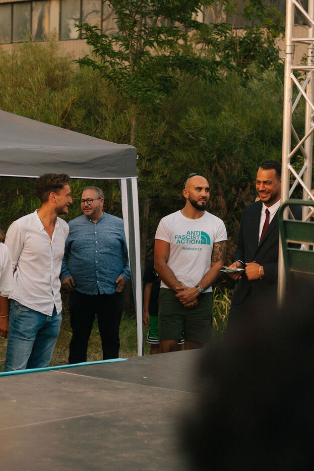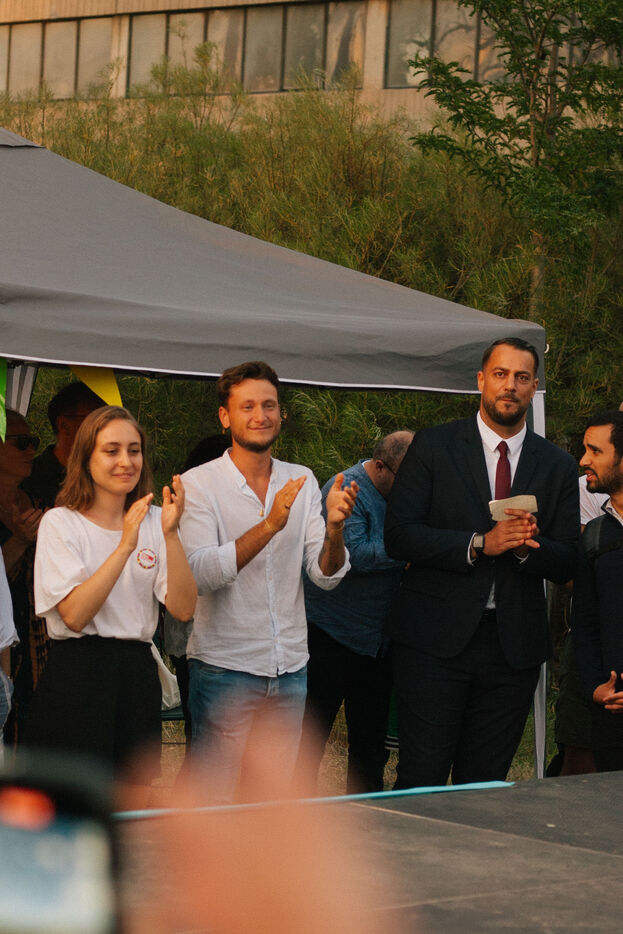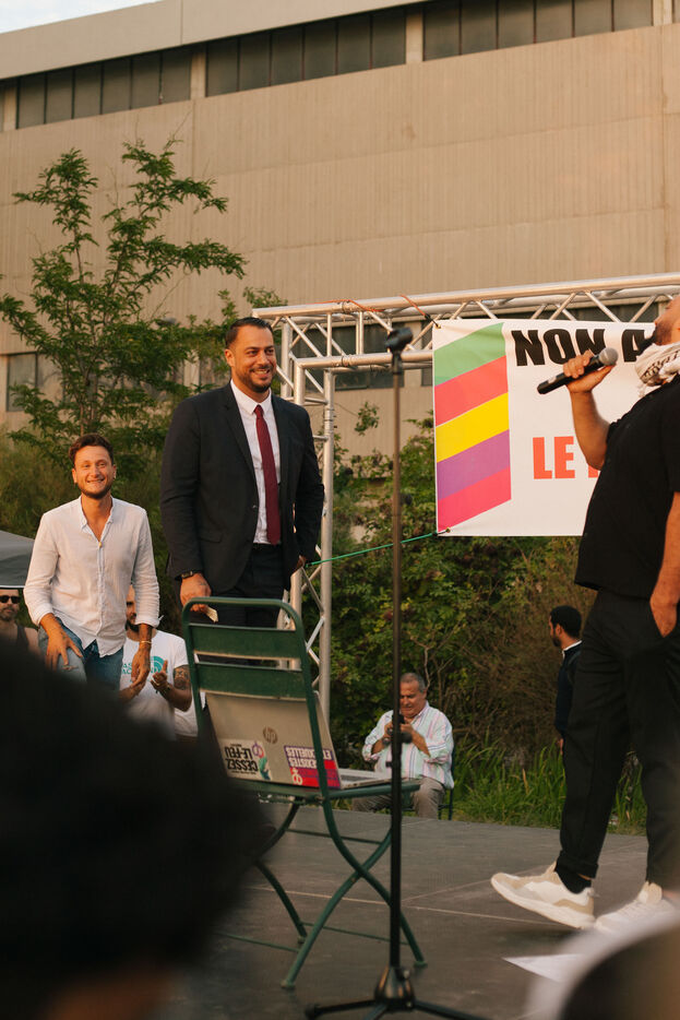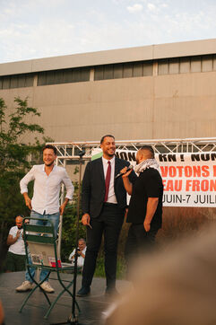 These images were taken in 2024 during an election night event organized by the New Popular Front (NFP) as part of the legislative elections. They show Sébastien Delogu visiting to support Member of Parliament Raphaël Arnault during speeches and exchanges with supporters.