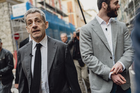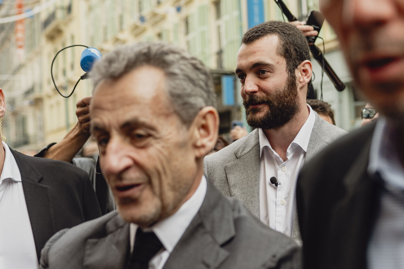 FRANCE, Menton, Decembre 12, 2025. Former president Nicolas Sarkozy and his son Louis Sarkozy, during a book-signing session. Book-signing session by former president Nicolas Sarkozy for his book The Diary of a Prisoner, written during his incarceration at La Santé prison in October 2025. Photo frederic DIDES/hanslucas