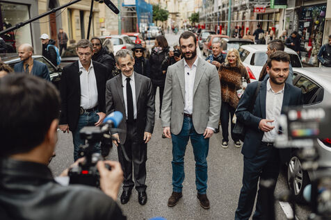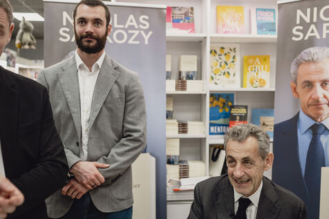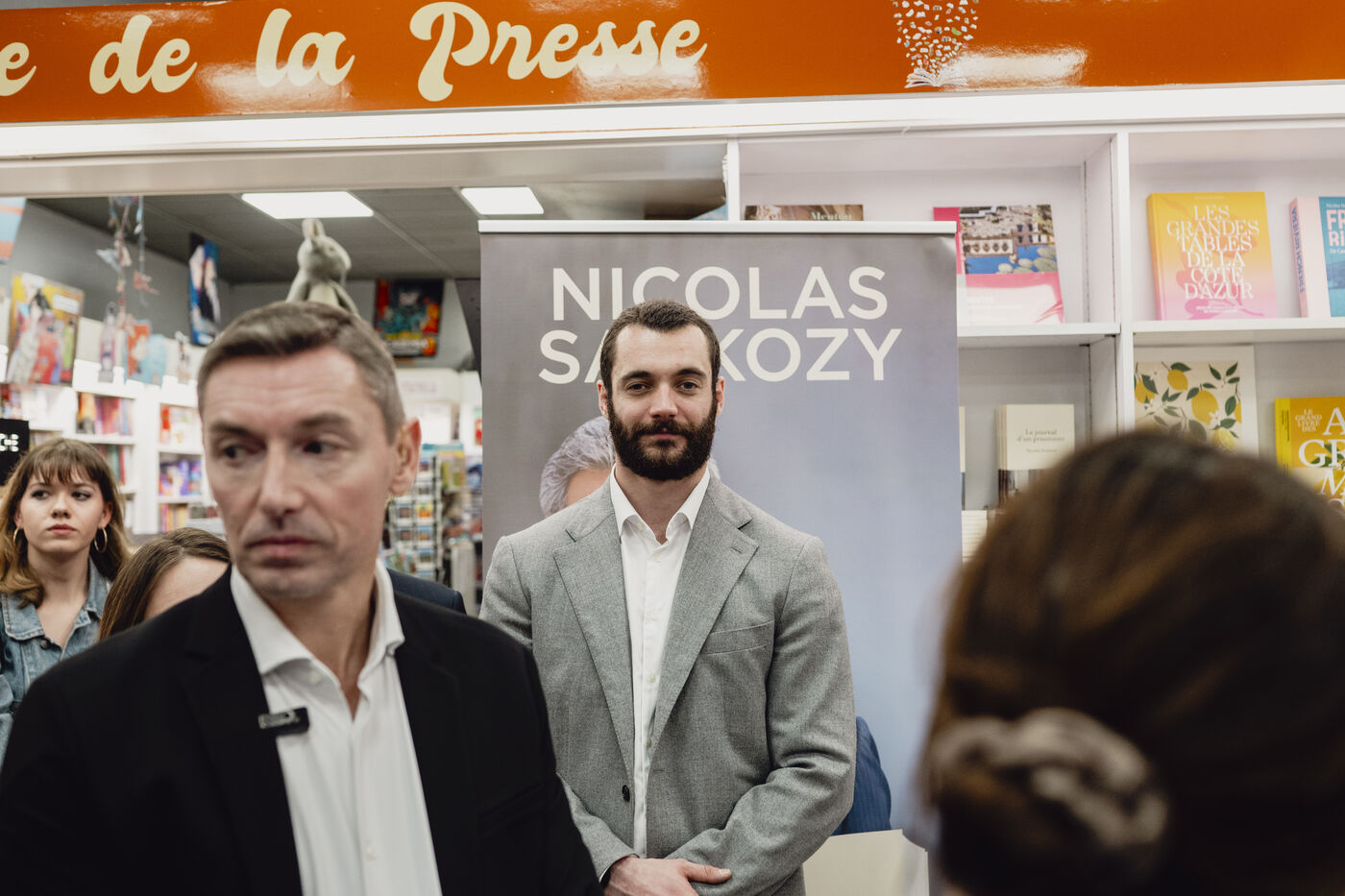L’ancien président Nicolas Sarkozy et son fils Louis Sarkozy, lors d’une séance de dédicace.