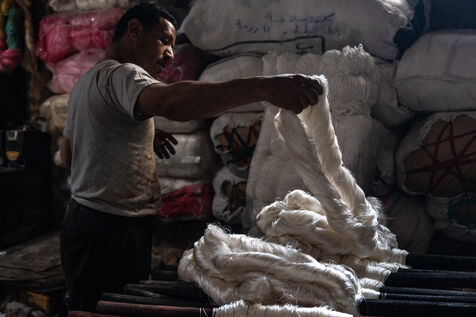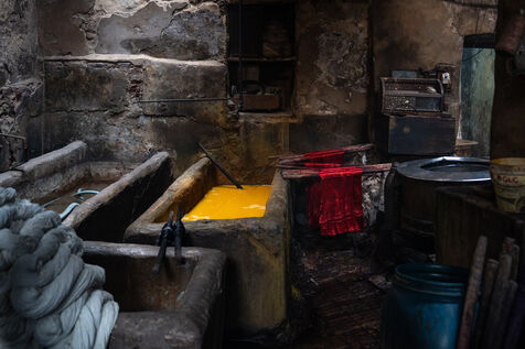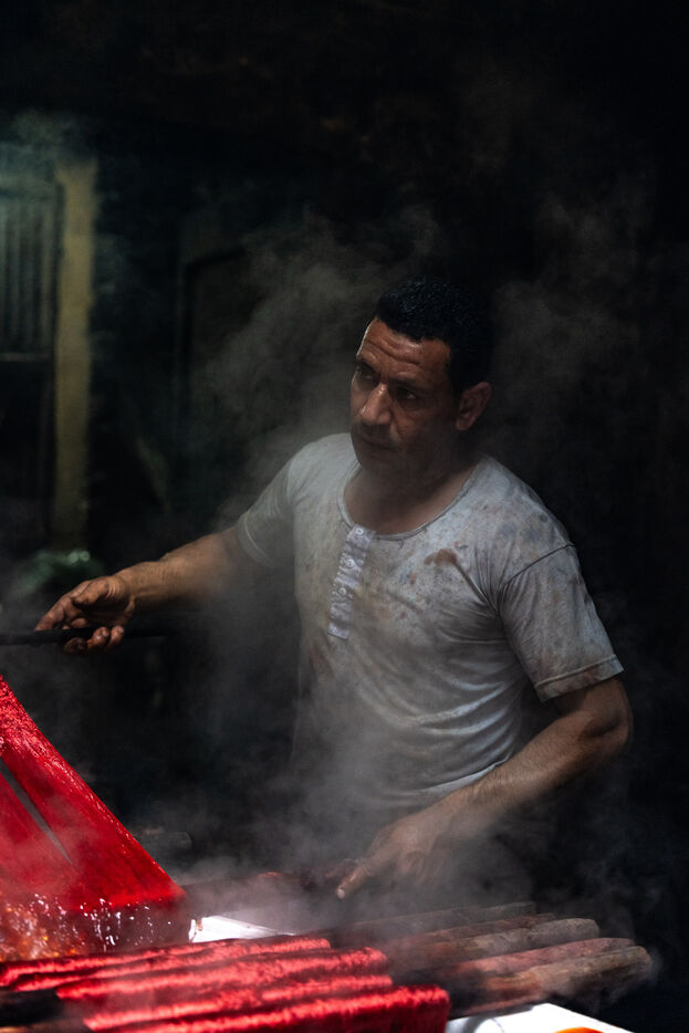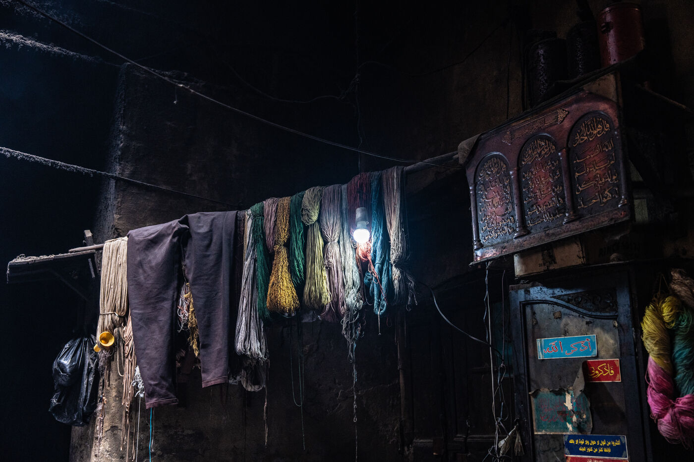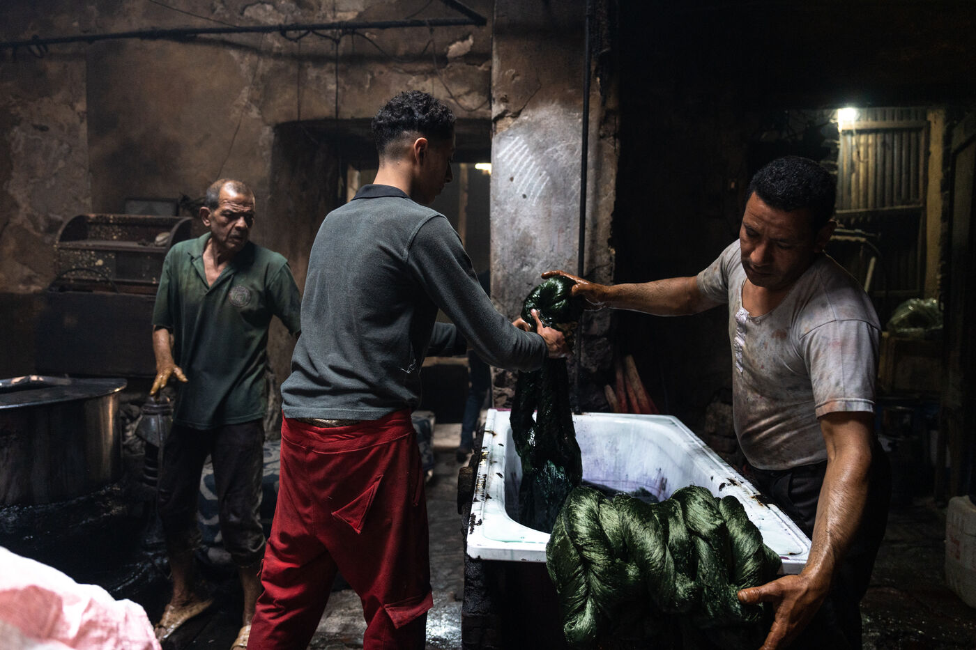 Dans cette teinturerie du quartier El Darb El Ahmar, fondée en 190, les artisans continuent toujours aujourd'hui de teindre les fils de façon traditionnelle, à la main, dans de grands bacs d'eau chaude, sous l'oeil expert de son propriétaire, Salama. Une fois teintés, les écheveaux de fils sont alors montés sur le toit où ils seront étendus pour sécher sur de longues tiges en bois.