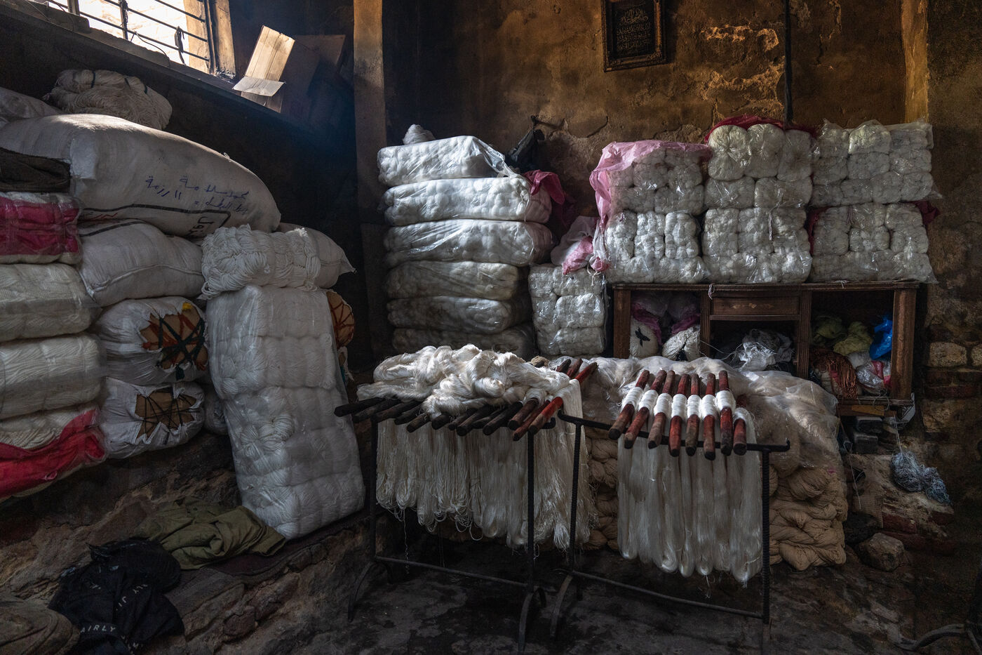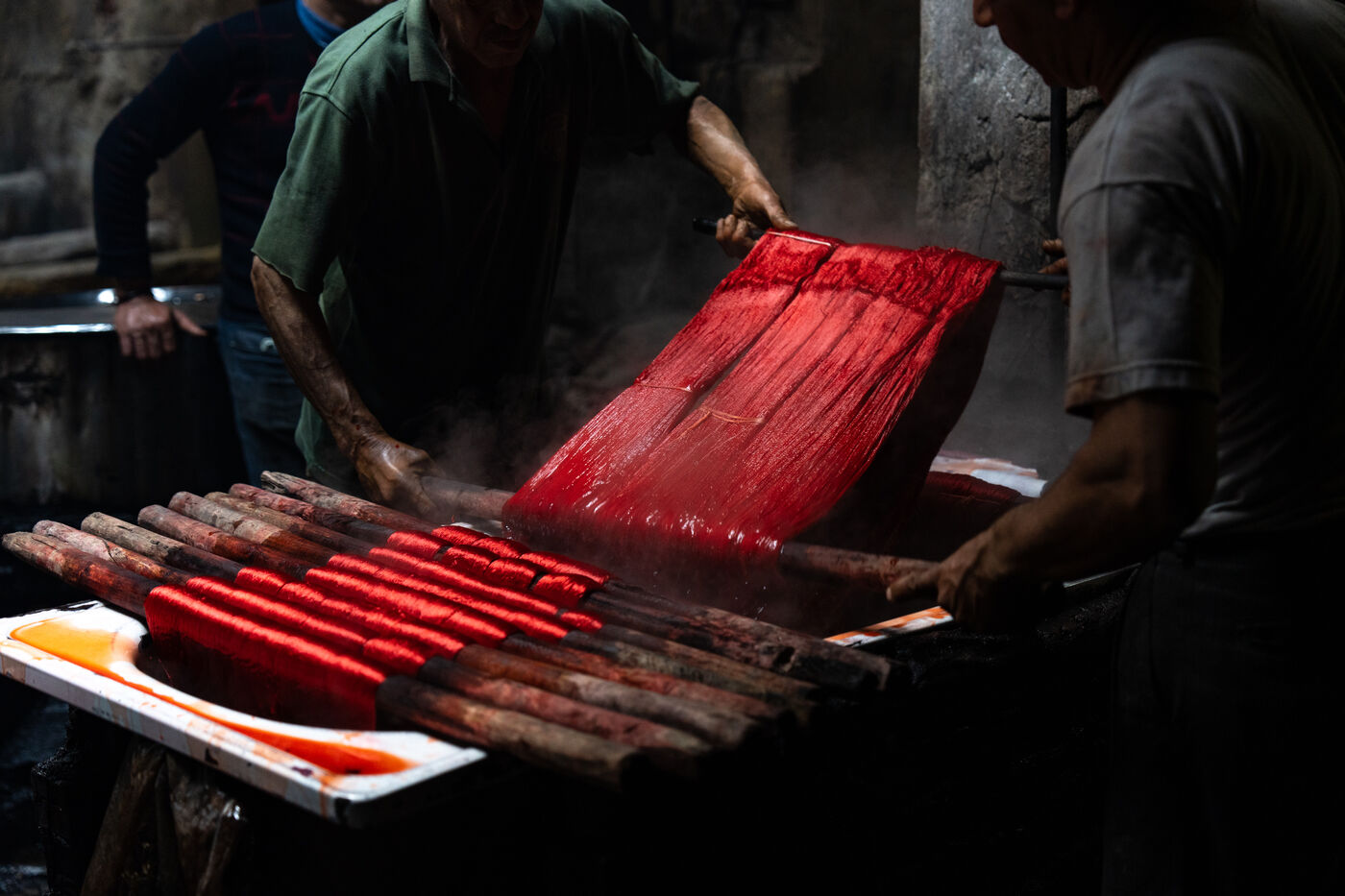 In this dye house in the El Darb El Ahmar district, founded in 190, the craftsmen still continue to dye the yarns in the traditional way, by hand, in large vats of hot water, under the expert eye of its owner, Salama. Once dyed, the skeins of yarn are taken up to the roof where they are laid out to dry on long wooden poles.