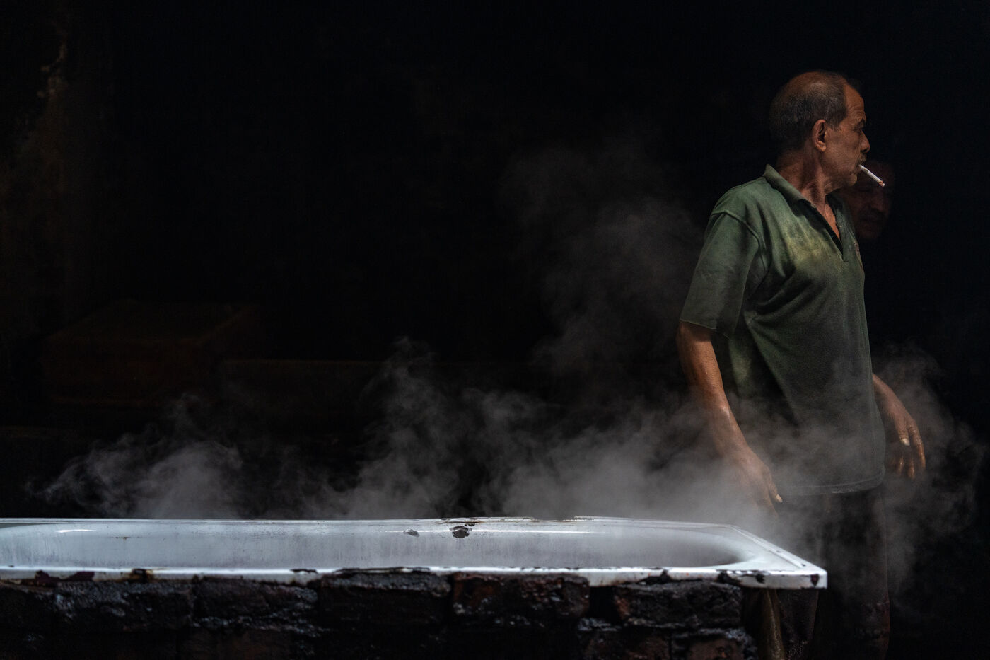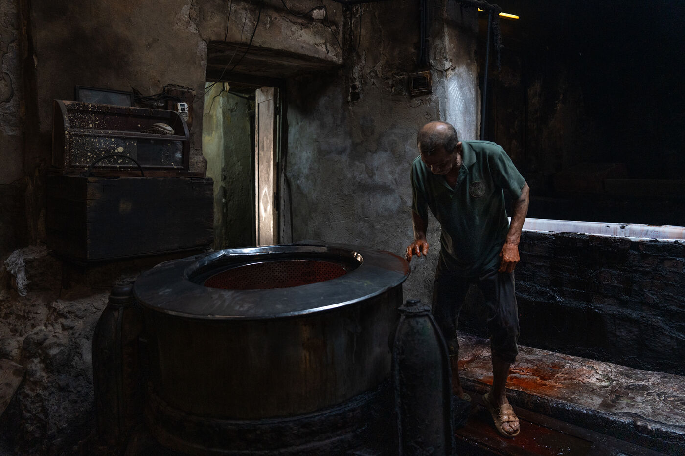 Before becoming the owner in 1975, Salama Mahmoud began working here when he was 17. Unable to read or write, he learnt all the skills from the former owner of the dye works. And so, over the years, he became an expert in the techniques of dyeing different materials (cotton, silk, wool, nylon). Although the small business has seen a marked drop in orders in recent years due to the modernisation of techniques and global competition, there are still customers who prefer the know-how and expertise of Salama, which continues to export internationally.