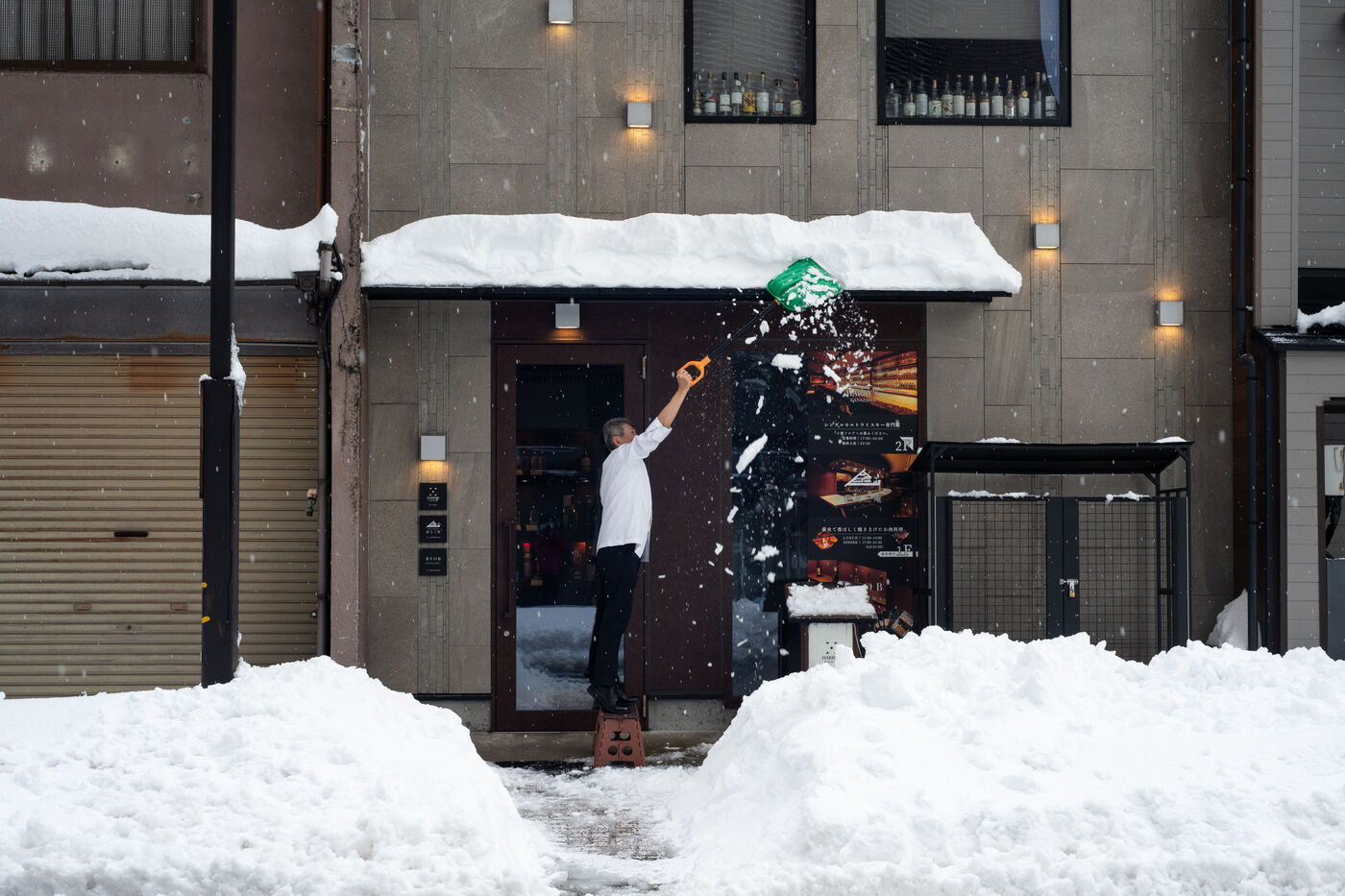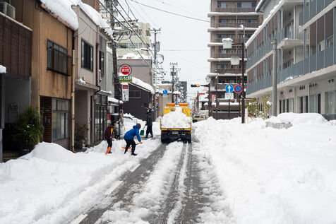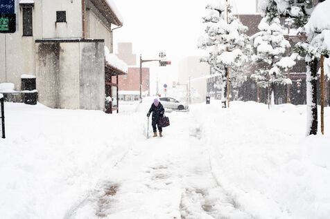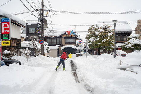 Dans la ville de Kanazawa, où les amoncellements de neige peuvent dépasser les 60 centimètres, la circulation tourne au ralentie, et les habitants sont nombreux à deneiger les rues à l'aide de pelles à neige.