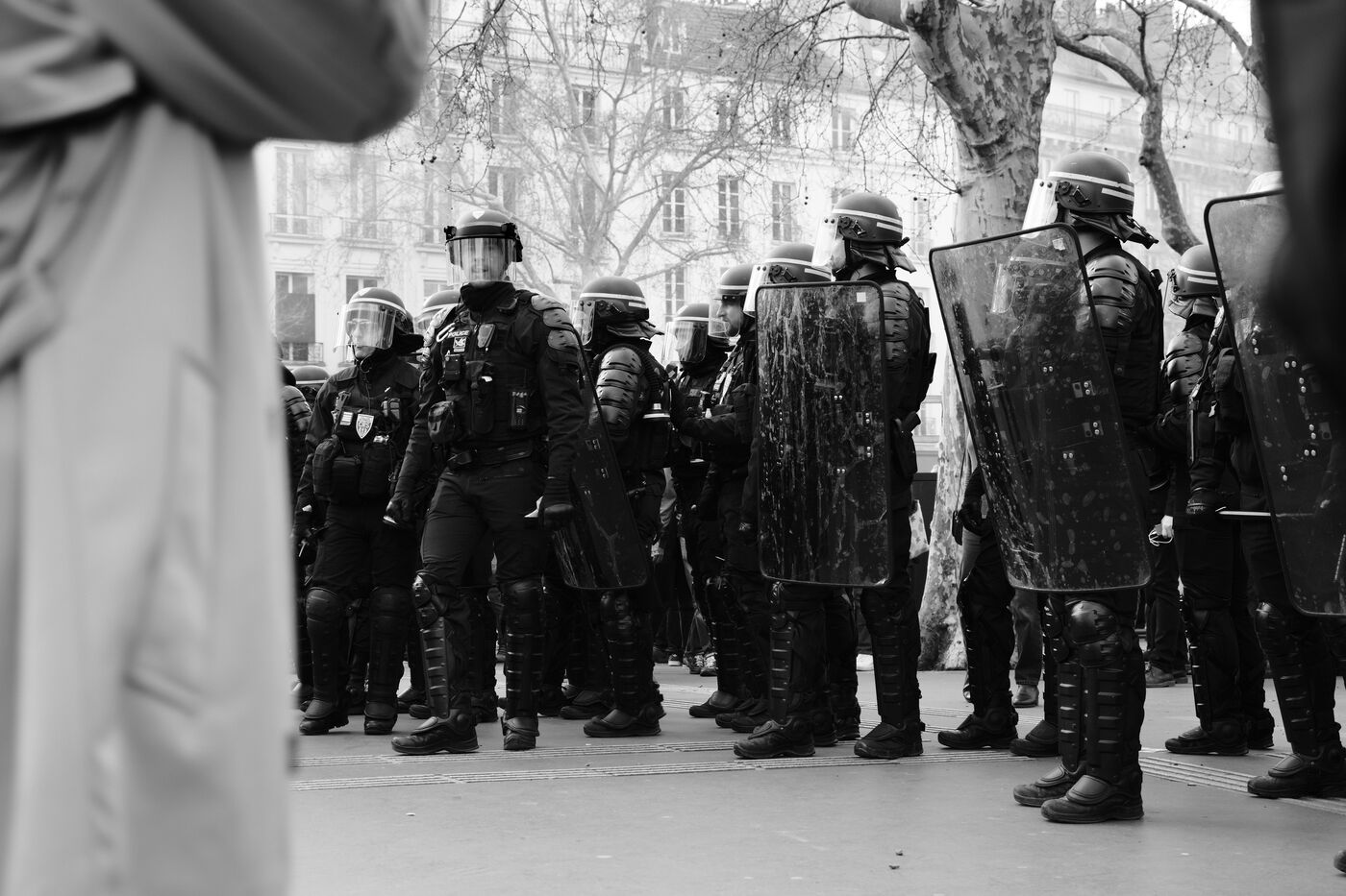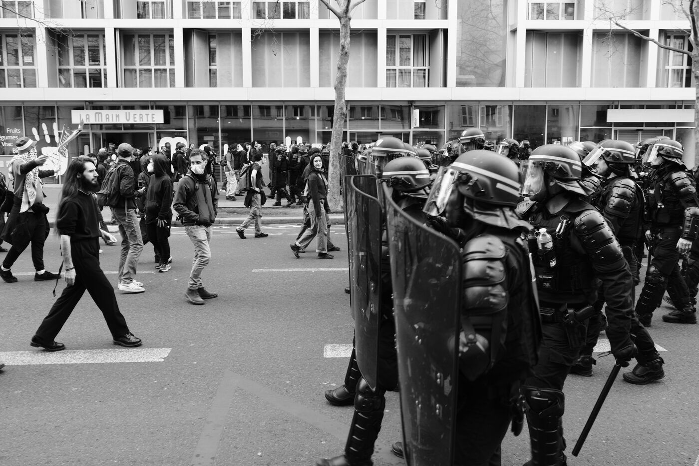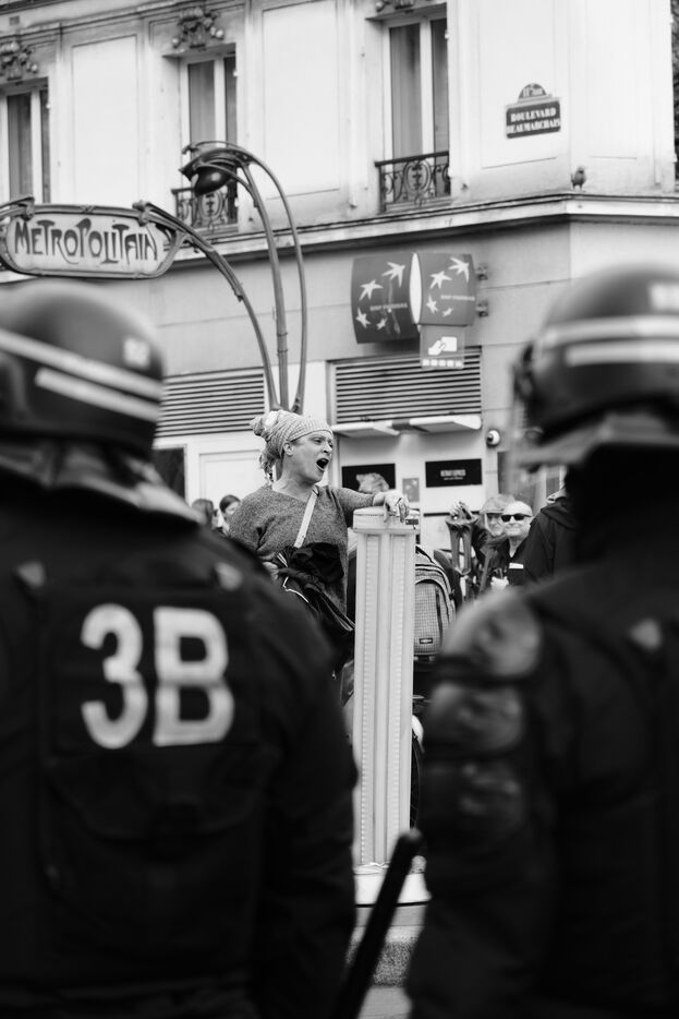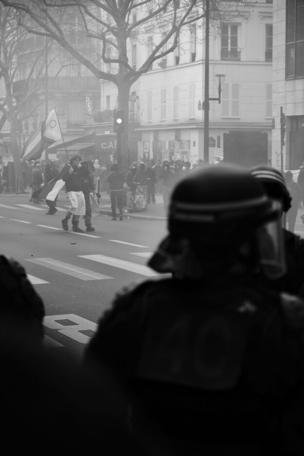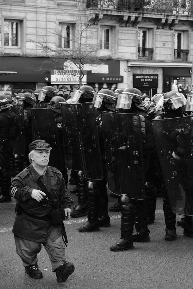 Shields of pressure explores, in black and white, the presence of riot police at the heart of social movements in Paris. Through action scenes, moments of confrontation, and suspended moments, the series documents the mechanics of maintaining order: shield formations, charges, retreats, rapid interventions, but also waiting, fatigue, and coordinated gestures.
