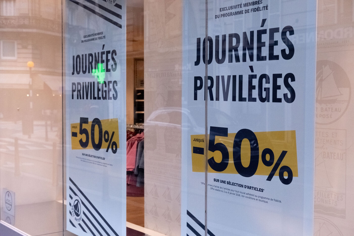 Across the French capital, many clothing stores and retail shops are offering private sales ahead of the winter sales period. Behind the windows, promotional posters, pre sale messages and discount labels highlight offers reserved for members or available under specific conditions. These visual marketing tools reshape the urban landscape and reflect retail strategies aimed at attracting consumers before the official sales period, creating a widespread atmosphere of promotions throughout Paris streets.