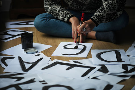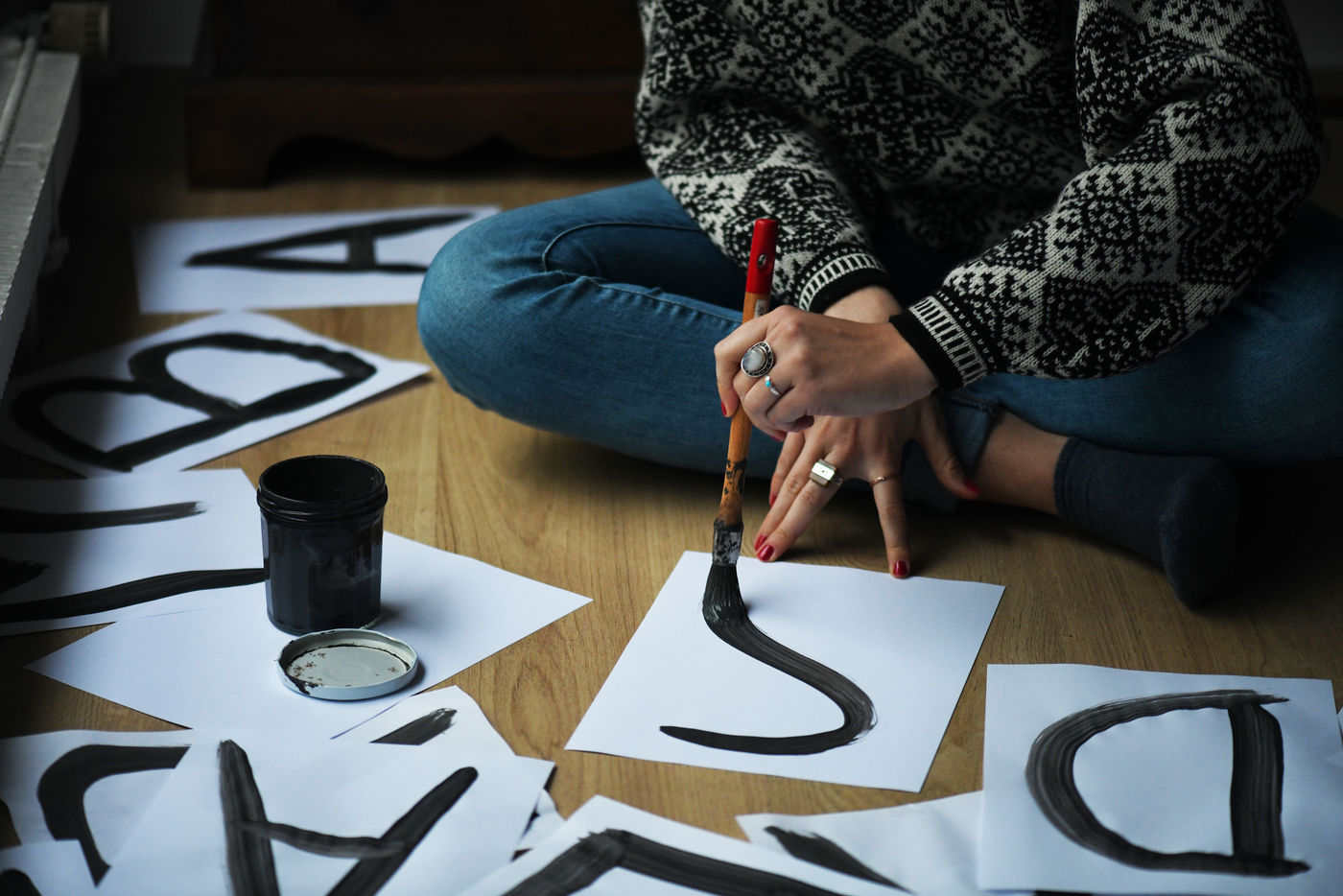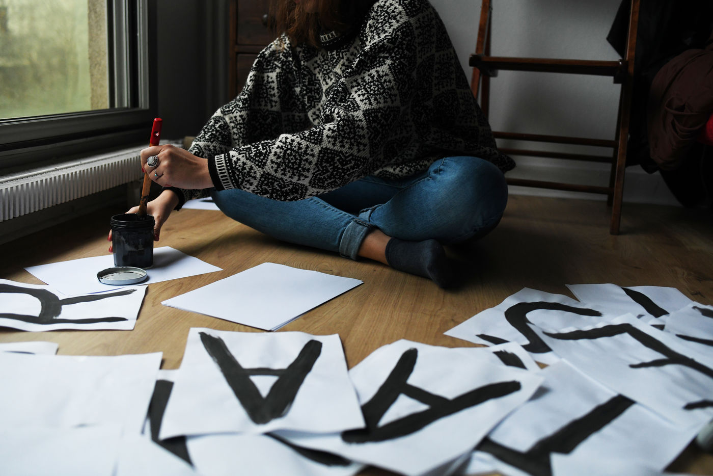 Des membres du collectif Collage féminicides Paris peignent les lettres de leurs slogans qui s'afficheront sur les murs de Paris.