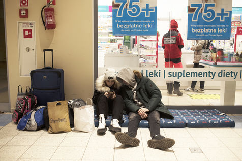 Ukrainian refugees wait for transport to leave Przemysl shortly after crossing the border between Ukraine and Poland. A shopping centre serves as a back-up accommodation for those who have to wait for sometimes several days. March 2, 2022, in Przemysl, Poland.