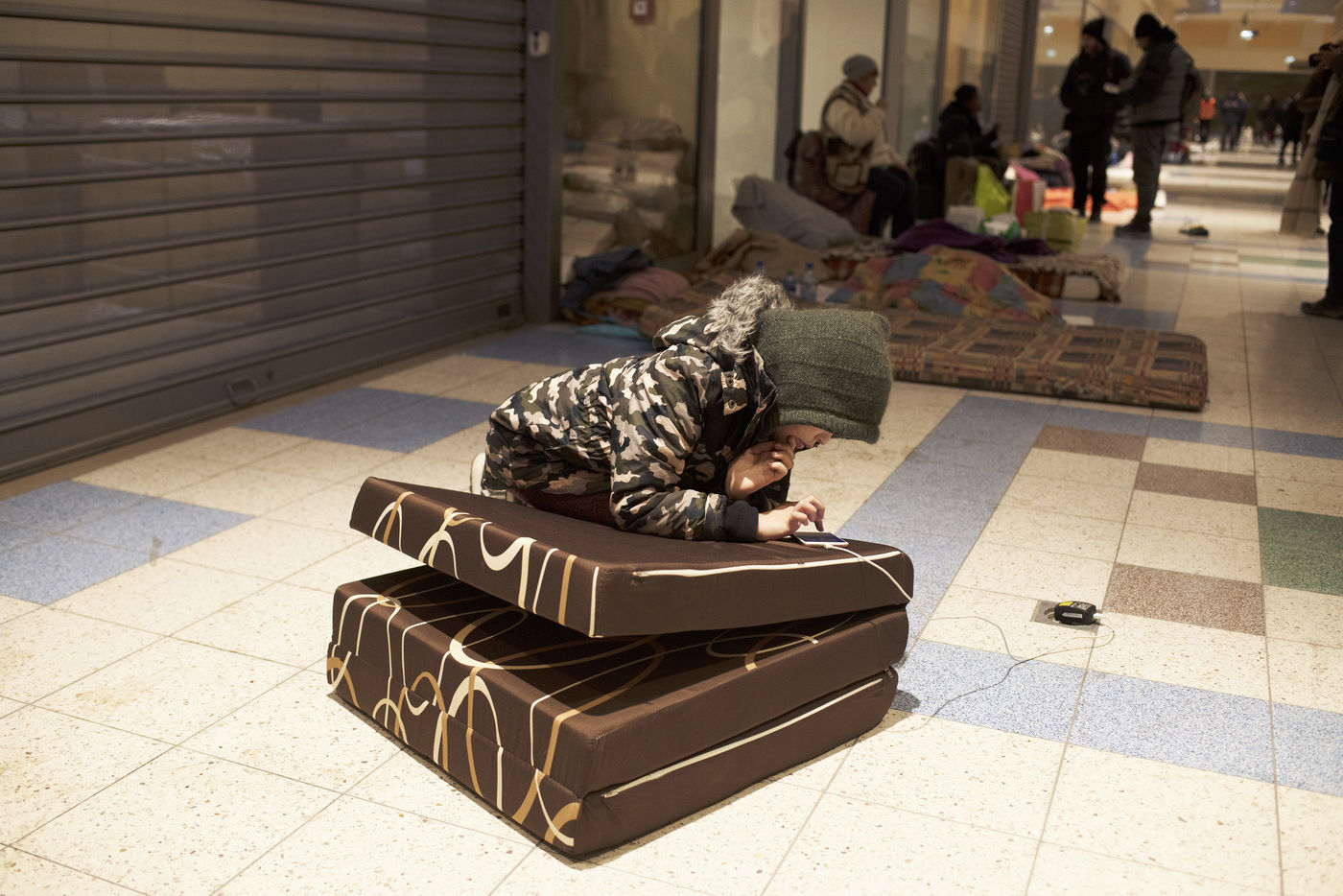 Des réfugiés ukrainiens attendent des moyens de transports pour quitter Przemysl peu de temps après avoir passe le frontière entre l'Ukraine et la Pologne. Un centre commercial sert d'hébergements d'appoint pour ceux qui doivent patienter pendant parfois plusieurs jours. Le 2 Mars 2022, à Przemysl, Pologne.