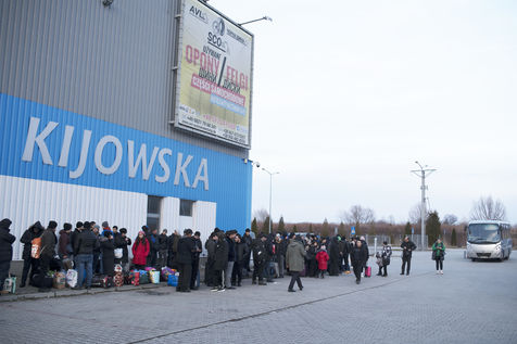 Ukrainian refugees waiting to leave Mlyny after crossing the border between Ukraine and Poland