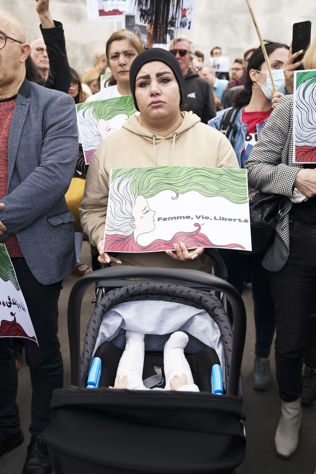 Gathering in support of the Iranian people and in tribute to Mahsa Amini. The young woman died on September 16 after being arrested by the religious police for wearing inappropriate clothing. The suspicious circumstances of her death have led to the anger of the Iranian people who have been demonstrating throughout the country ever since. The Iranian diaspora in Paris gathered on September 25 at the Parvis des Droits de l'Homme du Trocadero to show their support and pay tribute to Jina Mahsa Amini. September 25, 2022, in Paris.