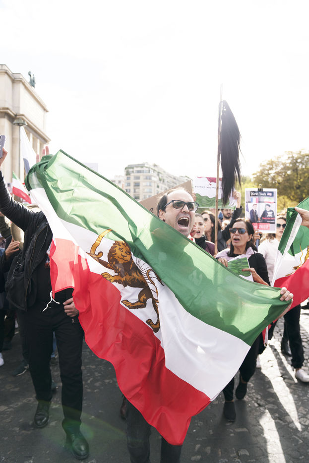 Rassemblement en soutien au peuple iranien et en hommage à Mahsa Amini. La jeune femme est morte le 16 septembre après avoir été arrêtée par la police religieuse pour port de vêtement inapproprié. Les circonstances suspectes de sa mort ont entraine la colère du peuple iranien qui manifeste dans tout le pays depuis. La diaspora iranienne de Paris s'est réunie ce 25 septembre sur le Parvis des droits de l'homme du Trocadéro et a marché jusqu'à l'Ambassade d'Iran pour montrer son soutien au peuple iranien et rendre hommage à Jina Mahsa Amini. Le 25 septembre 2022, à Paris.