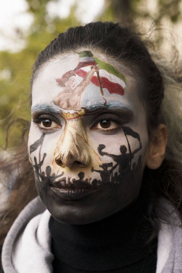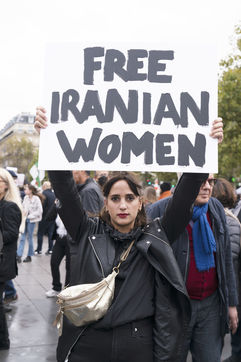 Manifestation en soutien au peuple iranien et en hommage à Mahsa Amini. La jeune femme est morte le 16 septembre après avoir été arrêtée par la police religieuse pour port de vêtement inapproprié. Les circonstances suspectes de sa mort ont entrainé la colère du peuple iranien qui manifeste dans tout le pays depuis. La diaspora iranienne de Paris s'est réunie une nouvelle fois ce 2 octobre Place de la République et a marché jusqu'à Nation pour montrer son soutien au peuple iranien et rendre hommage a Jina Mahsa Amini. Le 2 octobre 2022, à Paris.