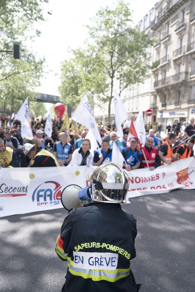 Grève des pompiers et manifestation entre Place de la République et Nation, à Paris, le jeudi 16 mai 2024.