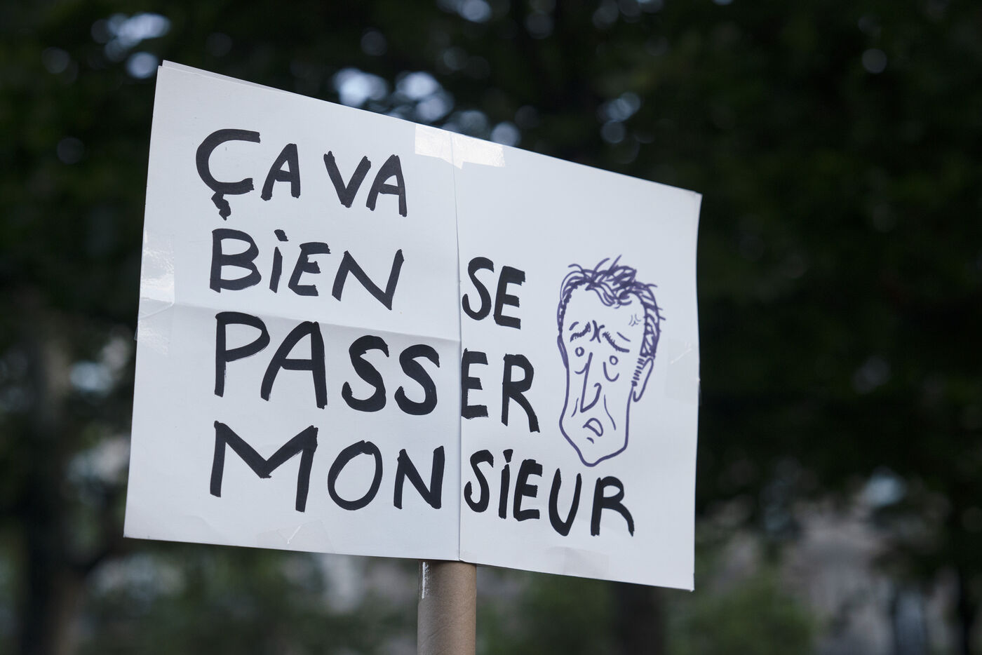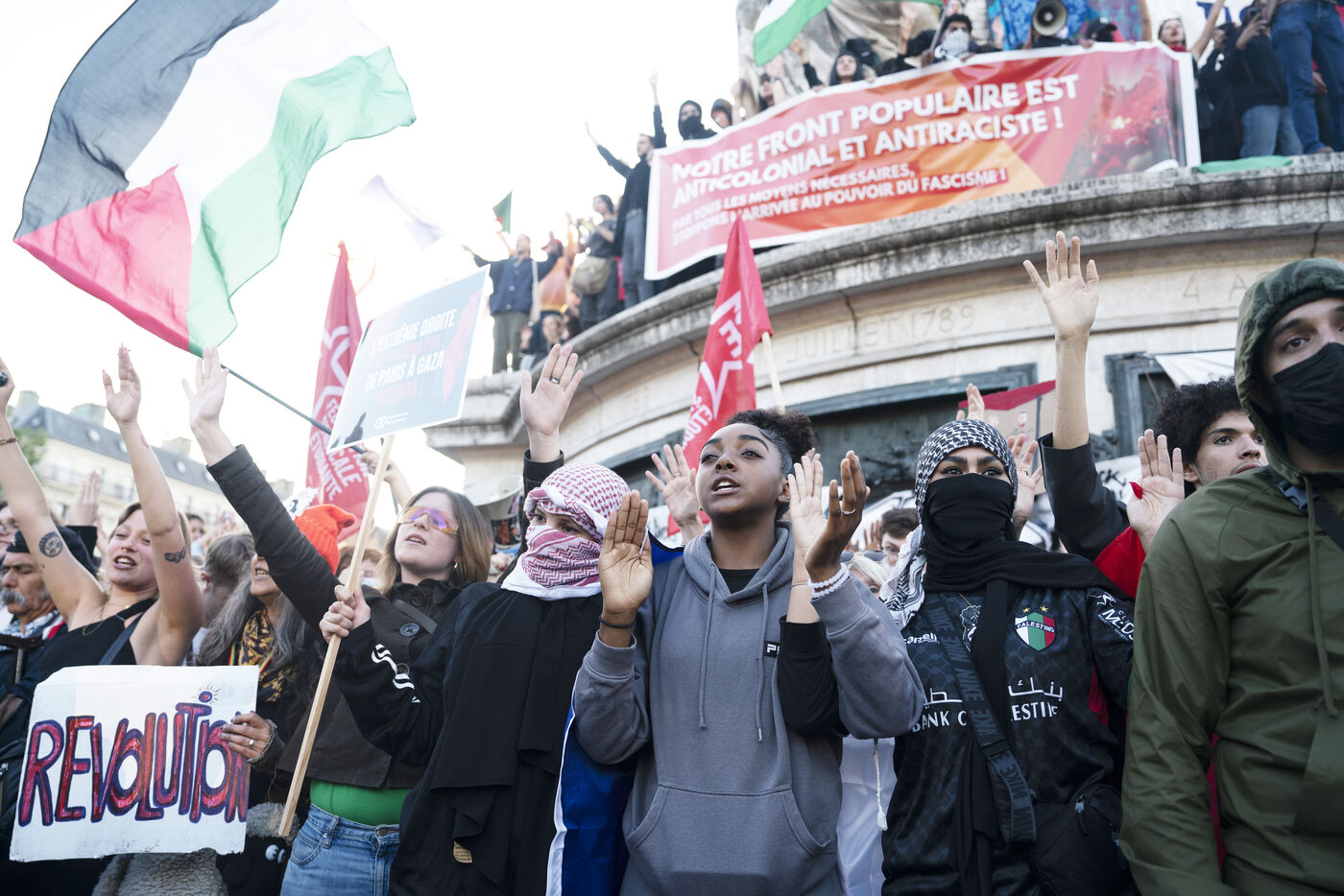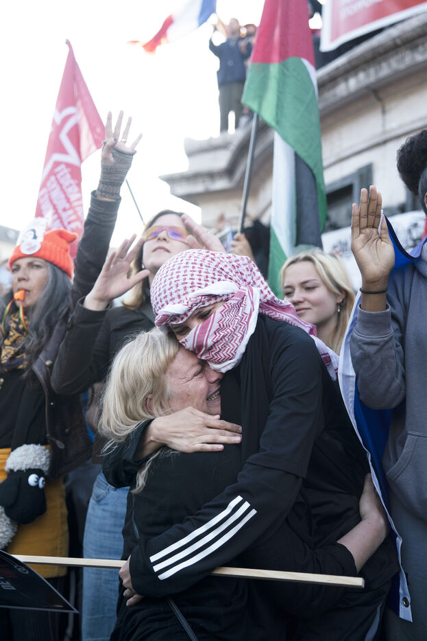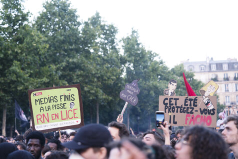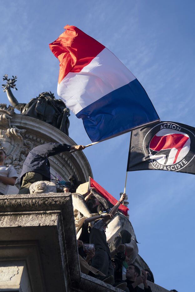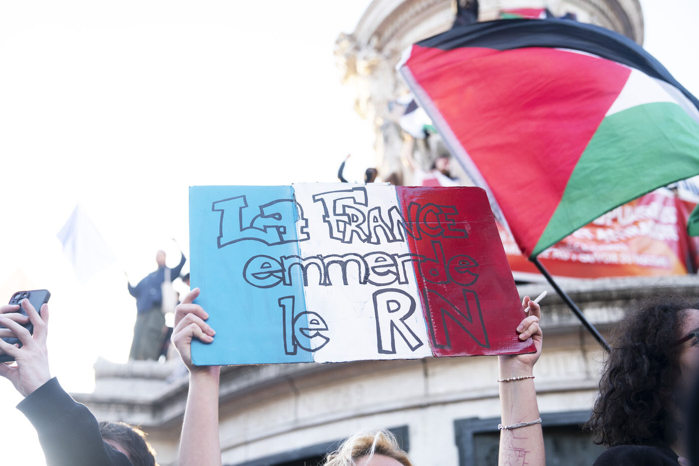 Gathering to celebrate the results of the Nouveau Front Populaire at the legislative elections in Paris. Left-wing supporters gathered on the Place de la République on July 7, 2024, to celebrate their relief at the results of the legislative elections, which had projected the far-right in the lead but ended up coming in third.
