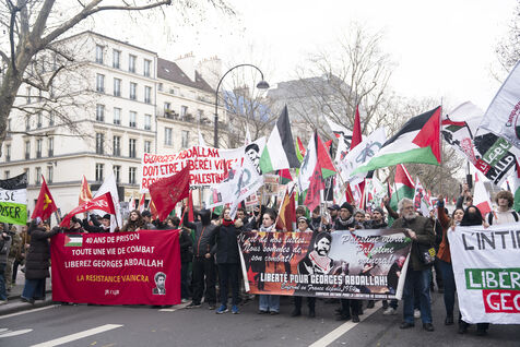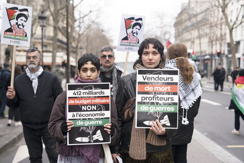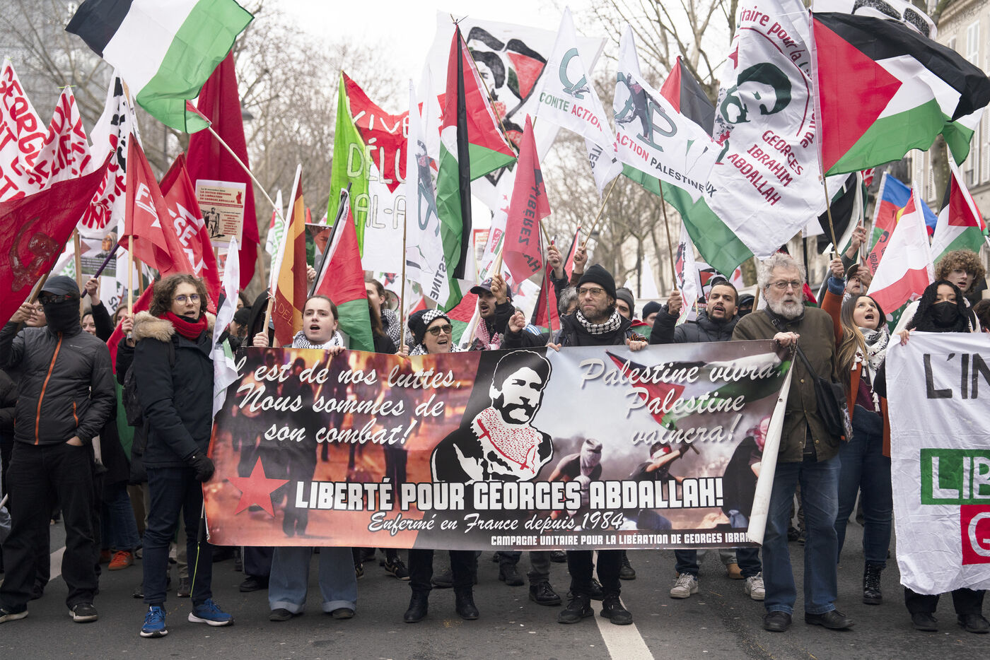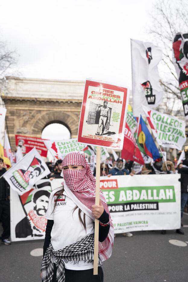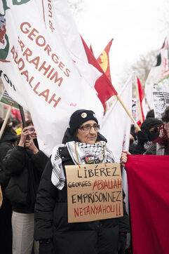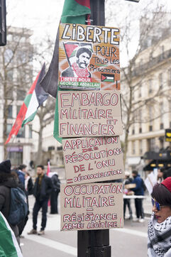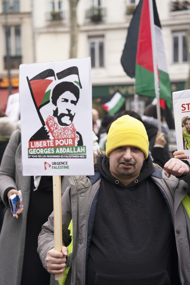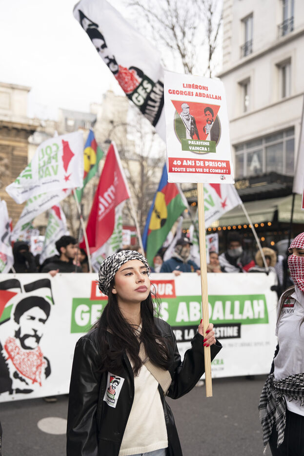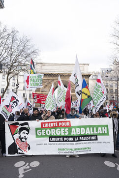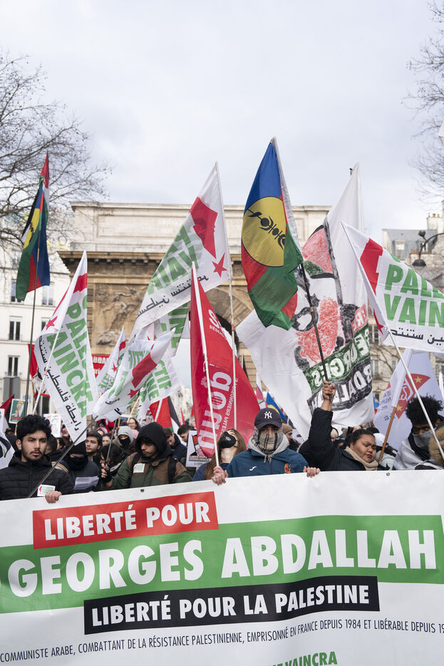 Feminist demonstration against armament and for an end to genocide in Palestine. Demonstrators also marched for the release of Georges Abdallah, who has been detained for 40 years in France for complicity in the assassination of two American and Israeli diplomats. The demonstration took place from Place de la République, on February 8, 2025, in Paris.