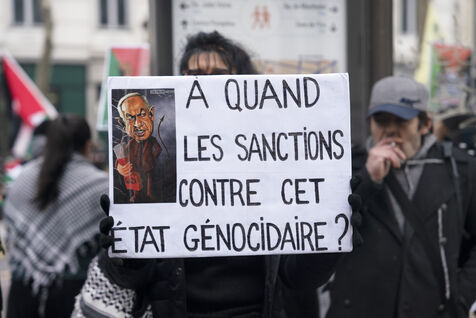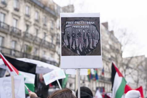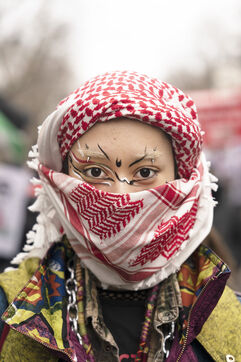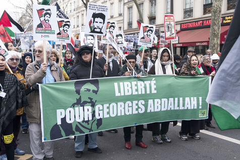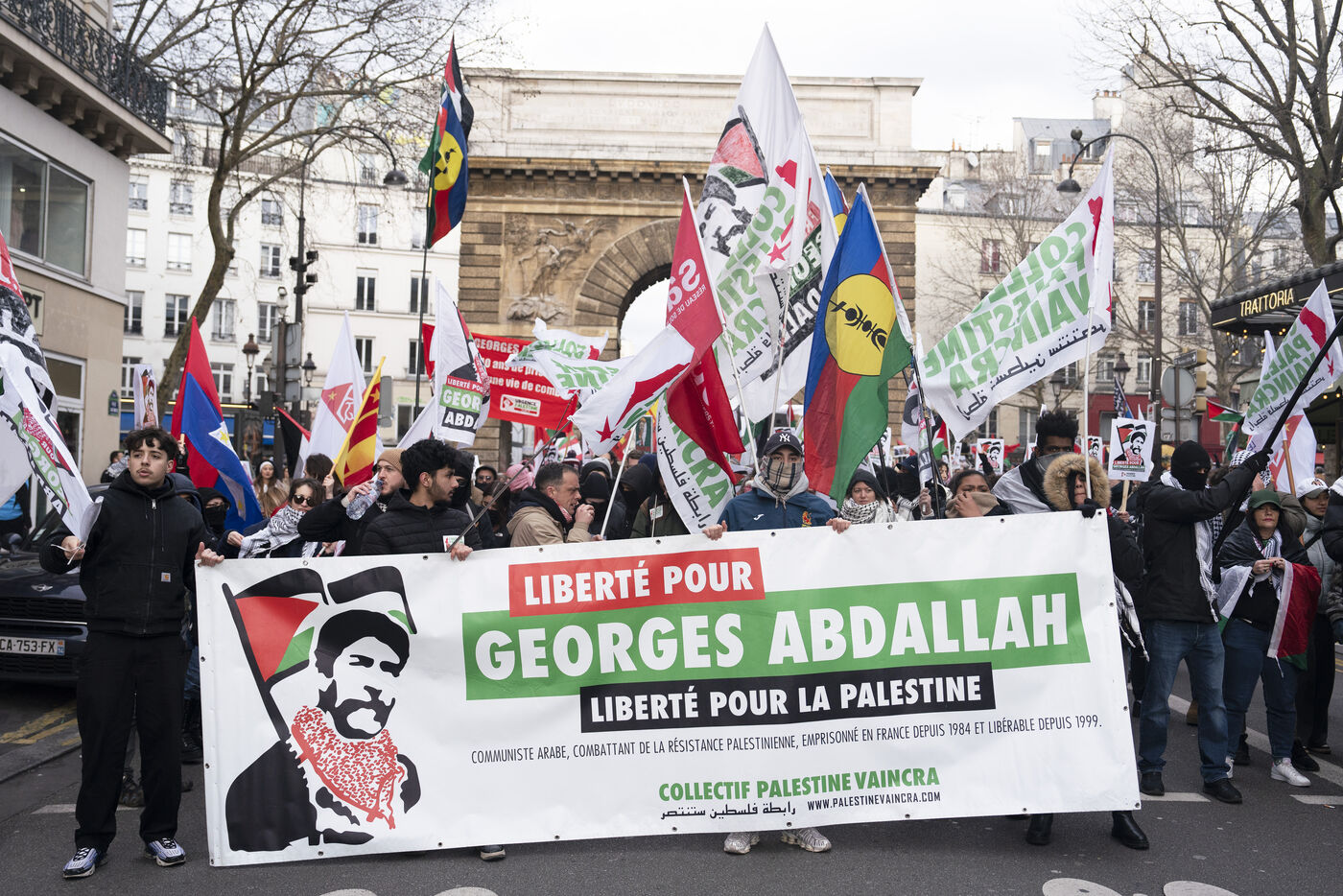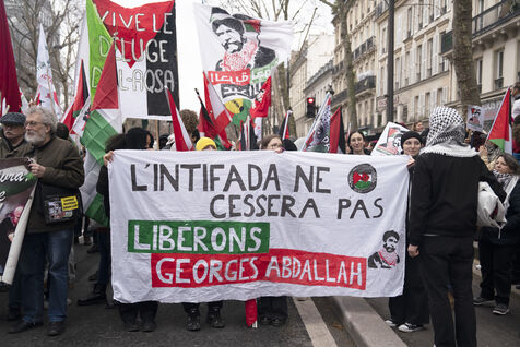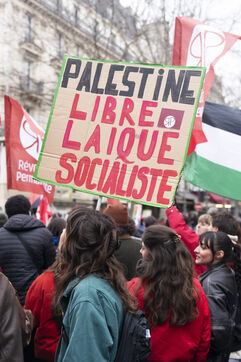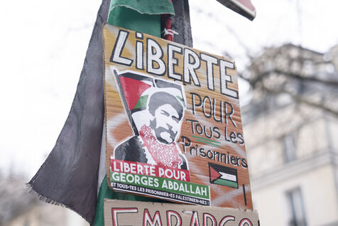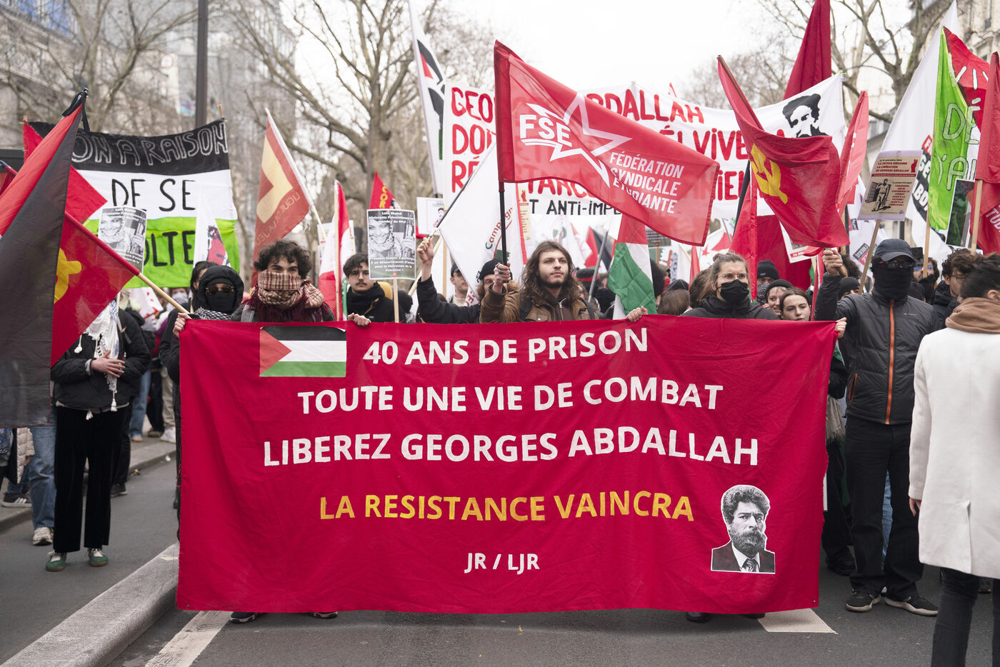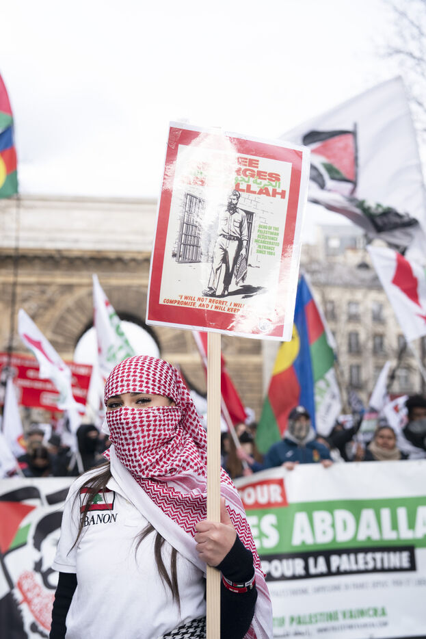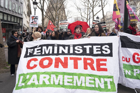 Feminist demonstration against armament and for an end to genocide in Palestine. Demonstrators also marched for the release of Georges Abdallah, who has been detained for 40 years in France for complicity in the assassination of two American and Israeli diplomats. The demonstration took place from Place de la République, on February 8, 2025, in Paris.