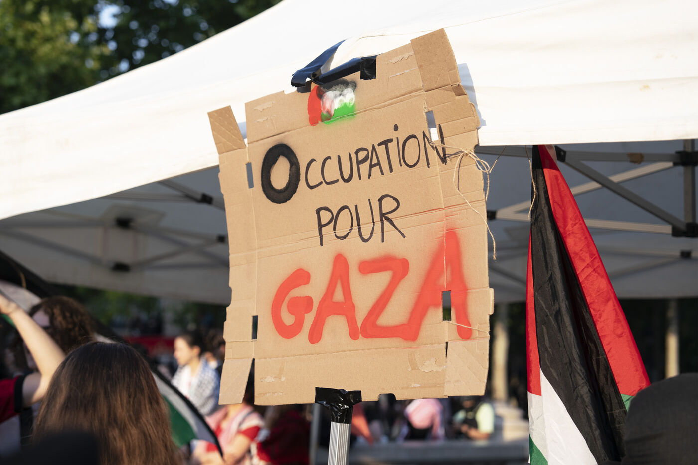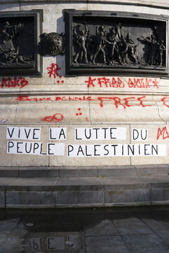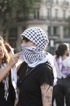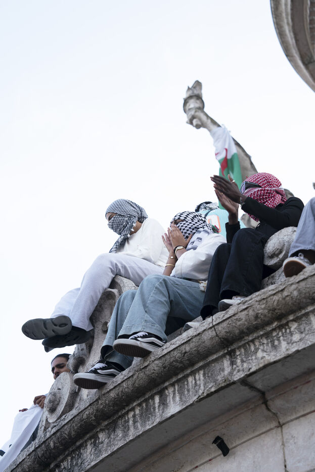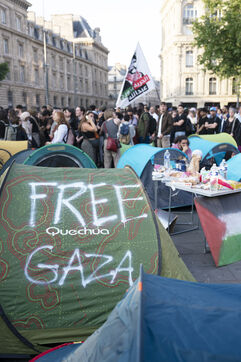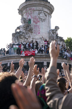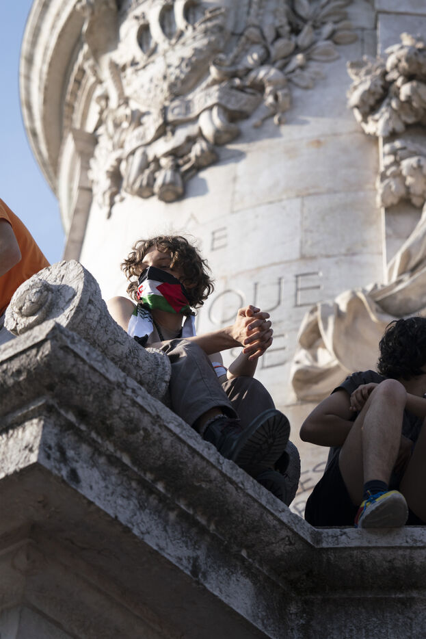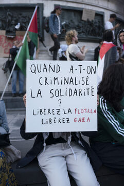 Deuxième soirée de rassemblement et d'occupation en soutien à la Flotille de la liberté, Place de la République, à Paris. Le bateau transportant 12 militants propalestiniens qui dénoncent le blocus humanitaire d'Israël dans la bande Gaza a été repéré et intercepté dans les eaux proches de Gaza la veille, les militants n'ont plus pu communiquer avec l'extérieur depuis. Le bateau comptait parmi les 12 militants plusieurs français dont l'eurodéputée Rima Hassan, mais aussi la jeune suédoise Greta Thunberg. Ils sont militants, humanitaires, journalistes et médecins, français, allemand, brésilien, turc, suédois, espagnol et néerlandais, partis d'Italie le 1er juin pour briser le blocus israélien à Gaza. Le 10 juin 2025.