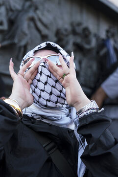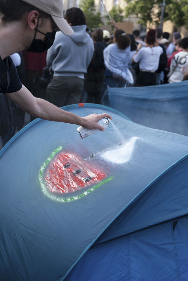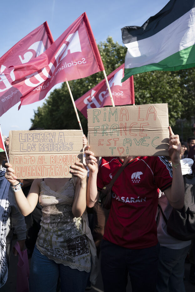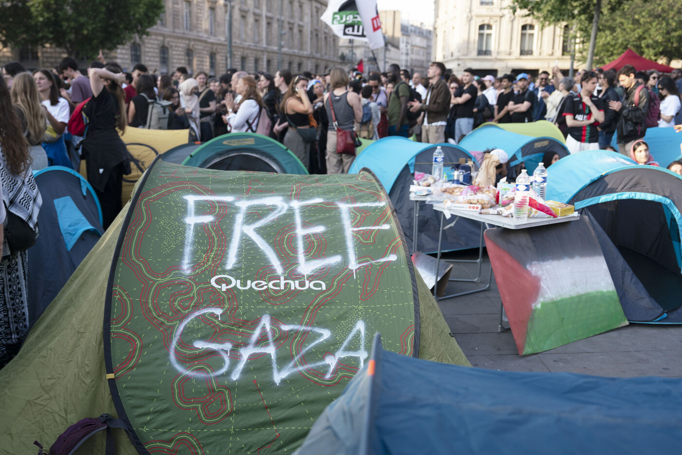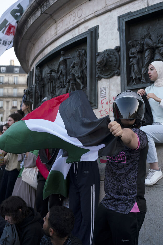 Second evening of rally and occupation in support of the Freedom Flotilla, Place de la République, Paris. The boat carrying 12 pro-Palestinian activists denouncing Israel's humanitarian blockade of the Gaza Strip was spotted and intercepted in waters near Gaza the day before, and the activists have been unable to communicate with the outside world since. Among the 12 activists on board were several French nationals, including MEP Rima Hassan, as well as the young Swedish woman Greta Thunberg. They are activists, humanitarians, journalists and doctors, French, German, Brazilian, Turkish, Swedish, Spanish and Dutch, who left Italy on June 1 to break the Israeli blockade of Gaza. June 10, 2025.