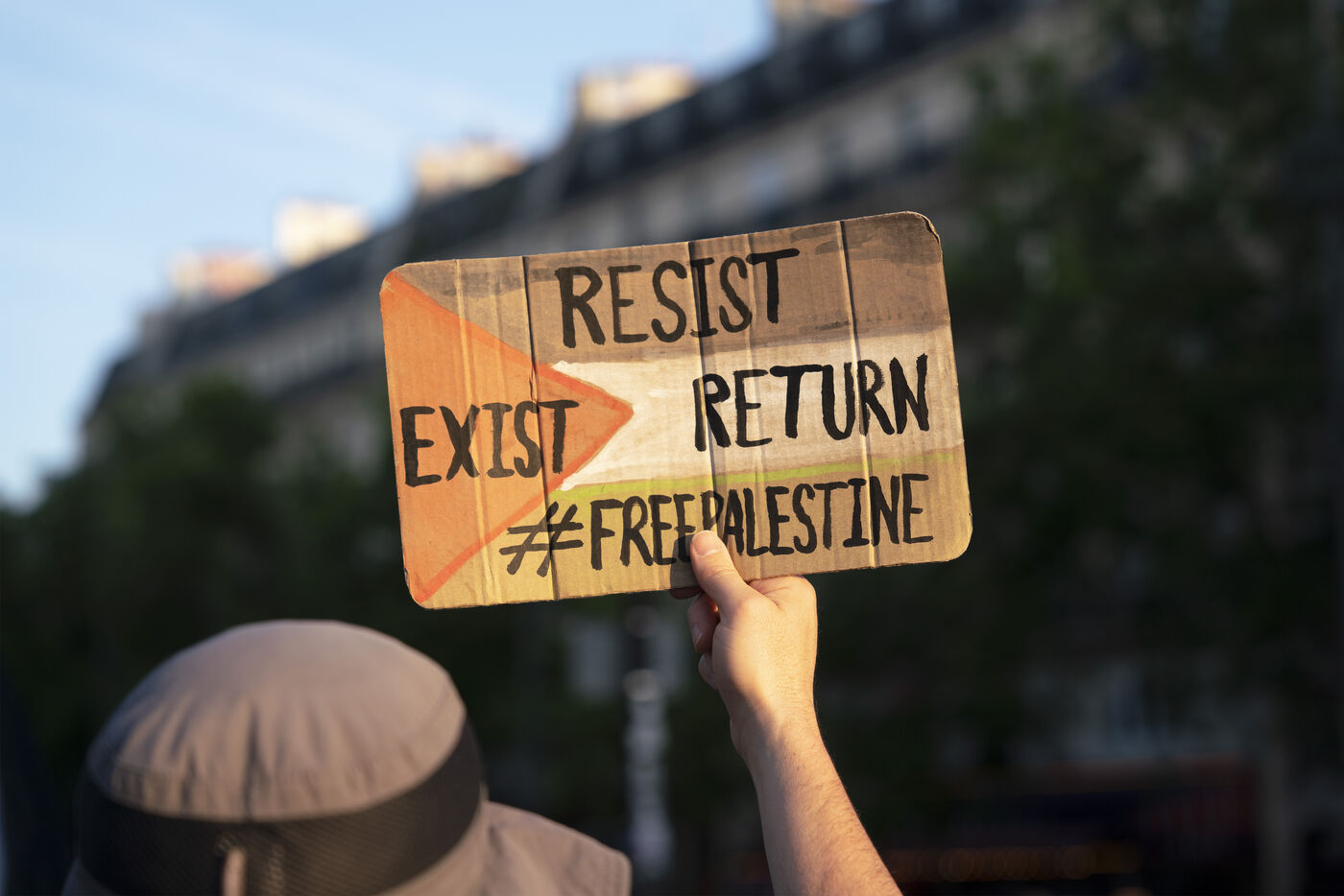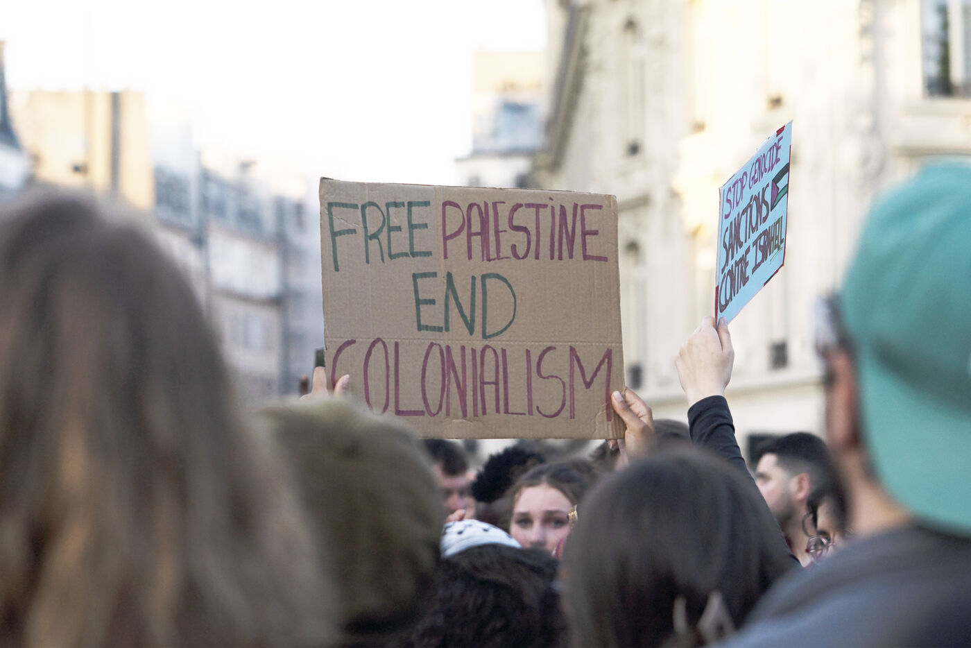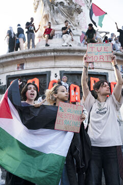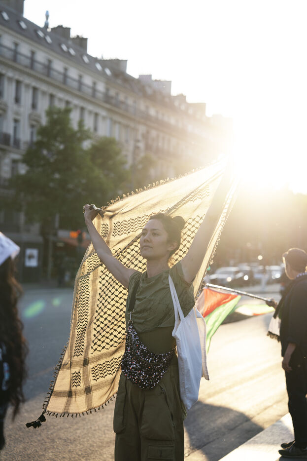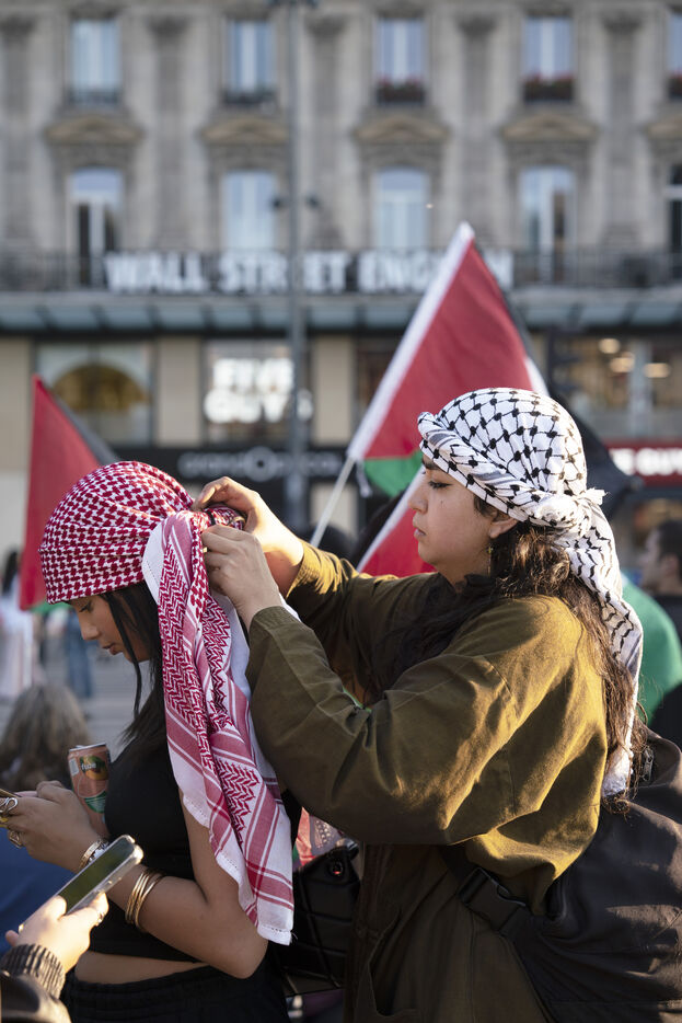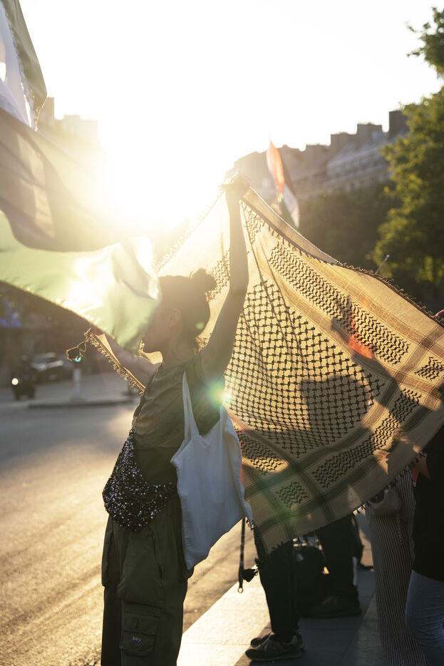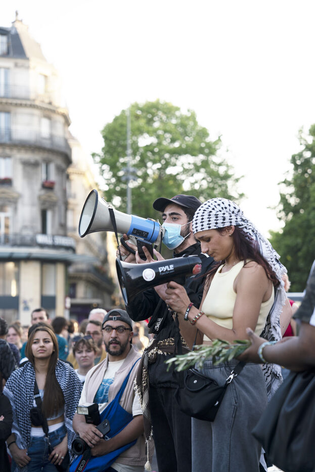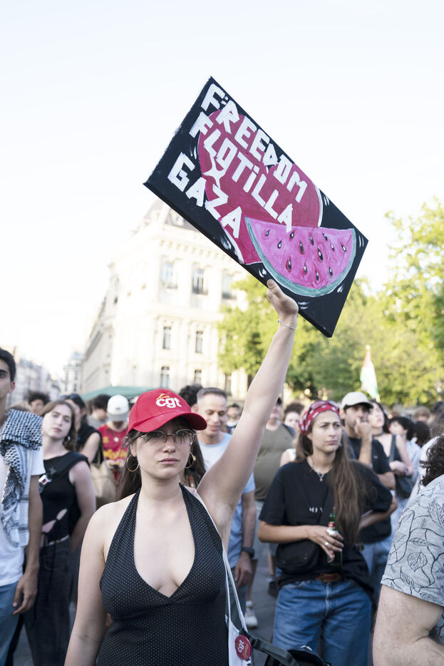 Troisième soirée de rassemblement et d'occupation en soutien à la Flotille de la liberté, Place de la République, à Paris. Le bateau transportant 12 militants propalestiniens qui dénoncent le blocus humanitaire d'Israël dans la bande Gaza a été repéré et intercepté dans les eaux proches de Gaza la veille, les militants n'ont plus pu communiquer avec l'extérieur depuis. Le bateau comptait parmi les 12 militants plusieurs français dont l'eurodéputée Rima Hassan, mais aussi la jeune suédoise Greta Thunberg. Ils sont militants, humanitaires, journalistes et médecins, français, allemand, brésilien, turc, suédois, espagnol et néerlandais, partis d'Italie le 1er juin pour briser le blocus israélien à Gaza. Le 11 juin 2025.