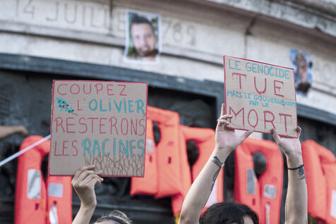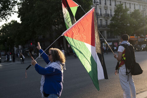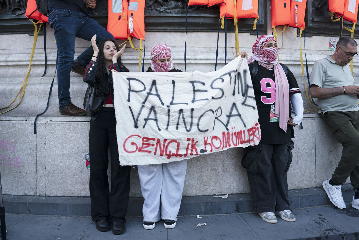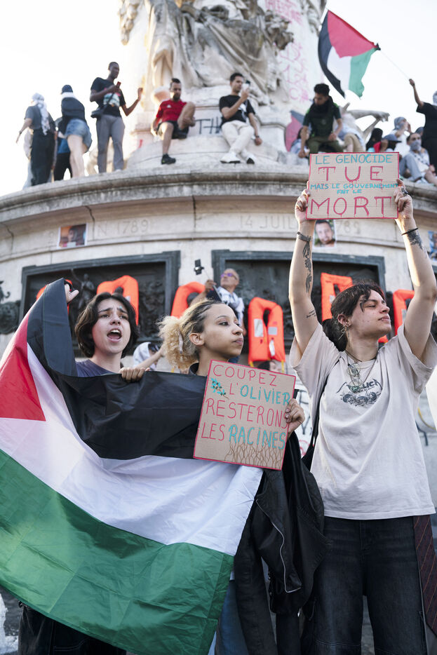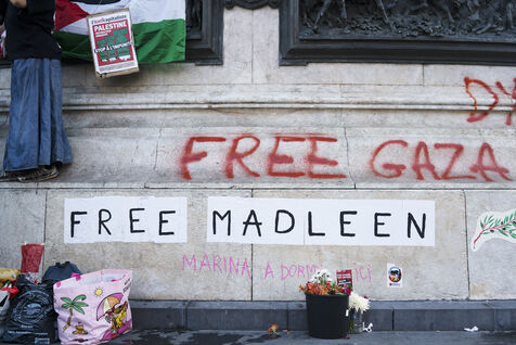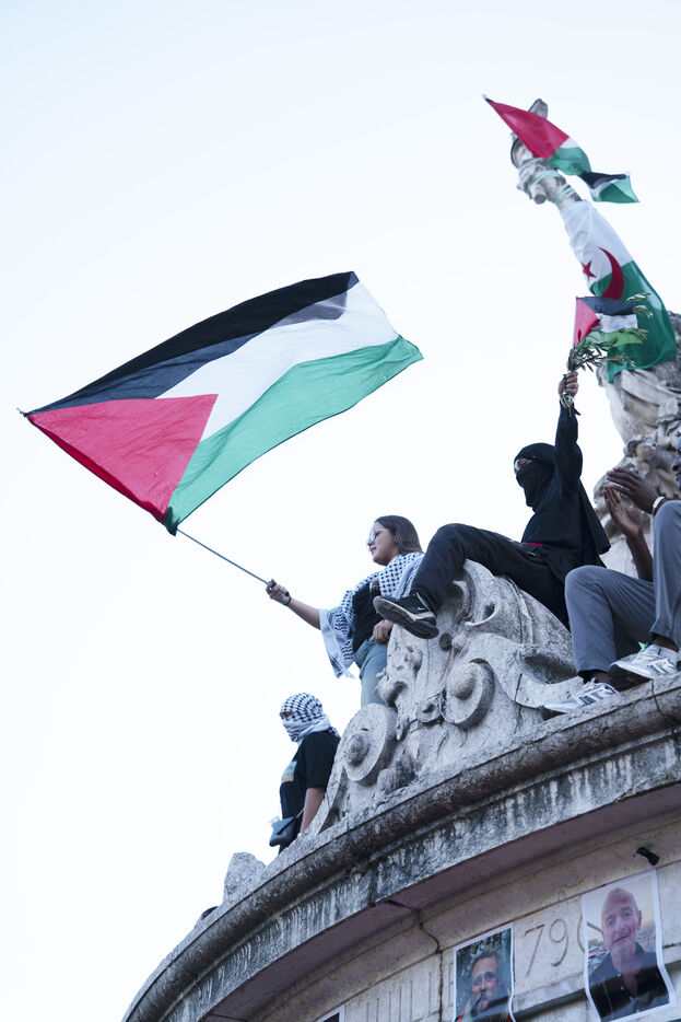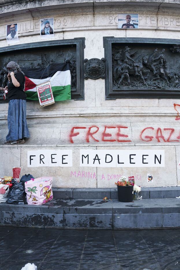 Third evening of rallies and occupations in support of the Freedom Flotilla, Place de la République, Paris. The boat carrying 12 pro-Palestinian activists denouncing Israel's humanitarian blockade of the Gaza Strip was spotted and intercepted in waters close to Gaza the day before, and the activists have been unable to communicate with the outside world since. Among the 12 activists on board were several French nationals, including MEP Rima Hassan, as well as the young Swedish woman Greta Thunberg. They are activists, humanitarians, journalists and doctors, French, German, Brazilian, Turkish, Swedish, Spanish and Dutch, who left Italy on June 1 to break the Israeli blockade of Gaza. June 11, 2025.