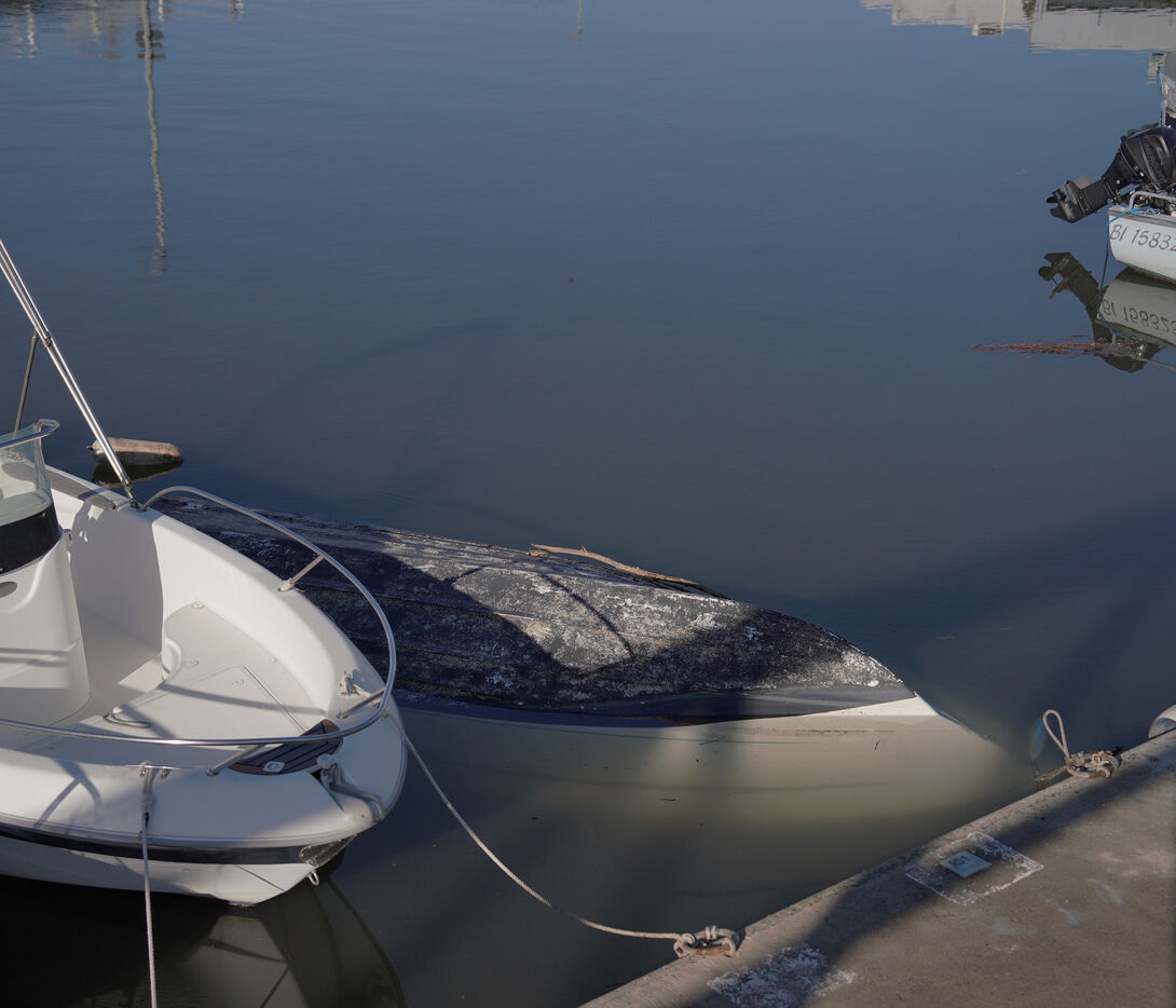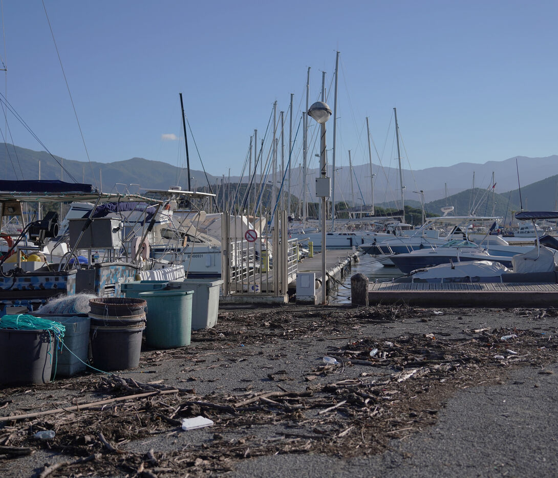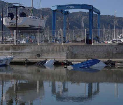 En Corse, à Saint-Florent, le pont du centre-ville s'est effondré, des bateaux stationnés dans le port ont pris l'eau : conséquences des inondations. Le 28 décembre 2025.