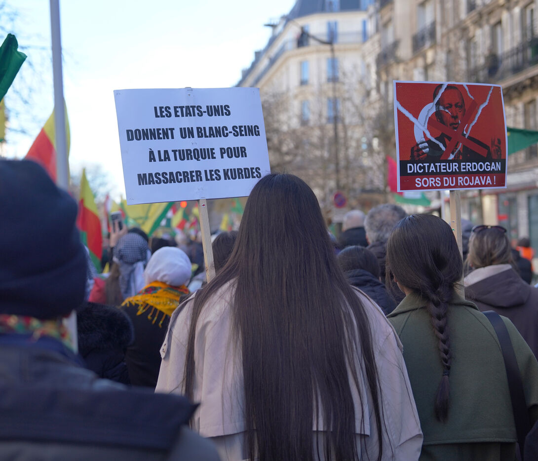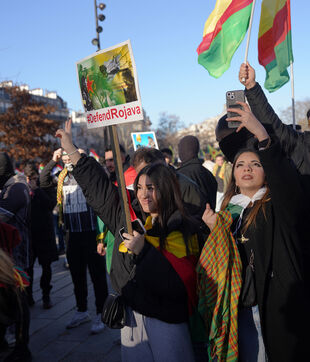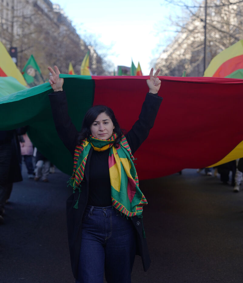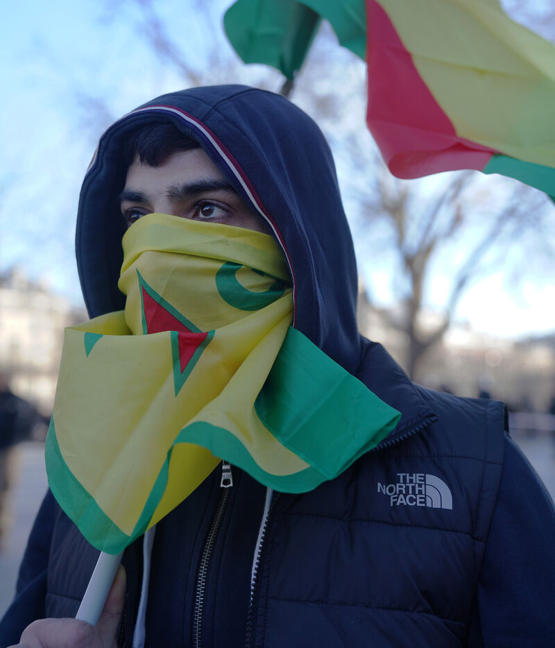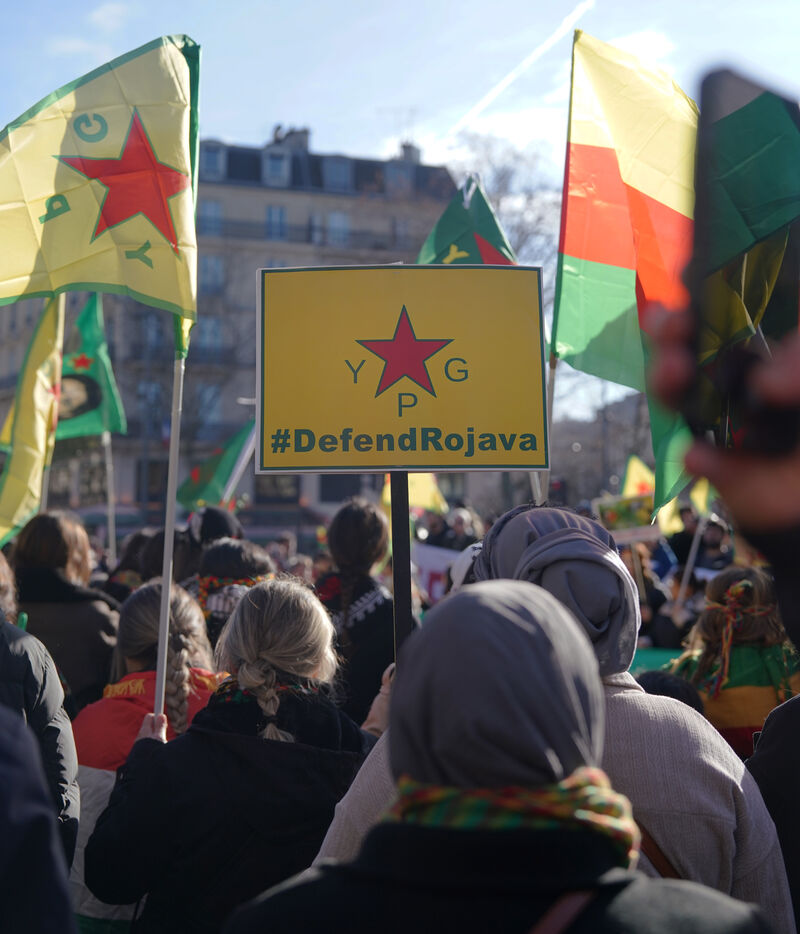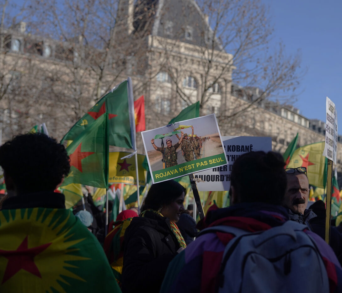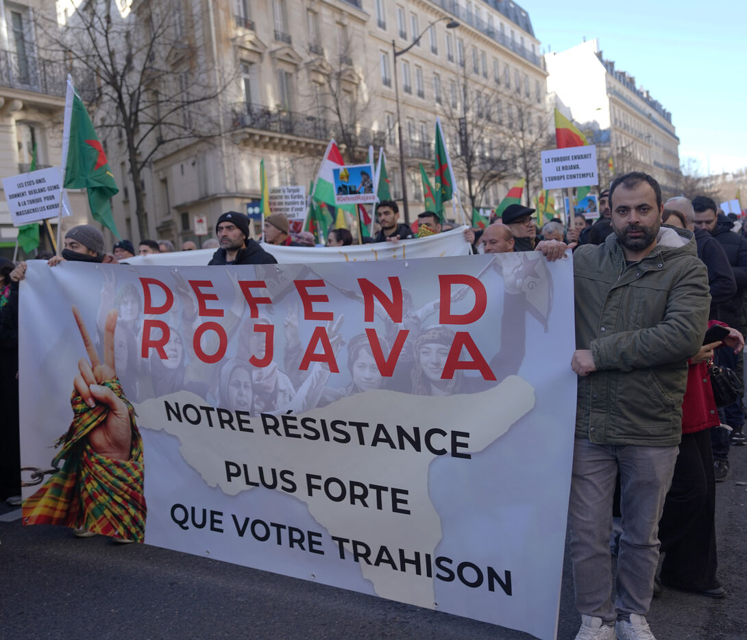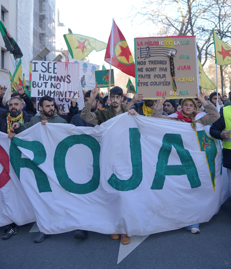 Demonstration in support of Rojava in Paris, threatened by attacks from the army of Ahmed al Charaa, a former jihadist who became interim president at the end of 2023 after the fall of Bashar al Assad's dictatorship in Syria. January 24, 2026.