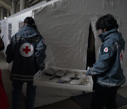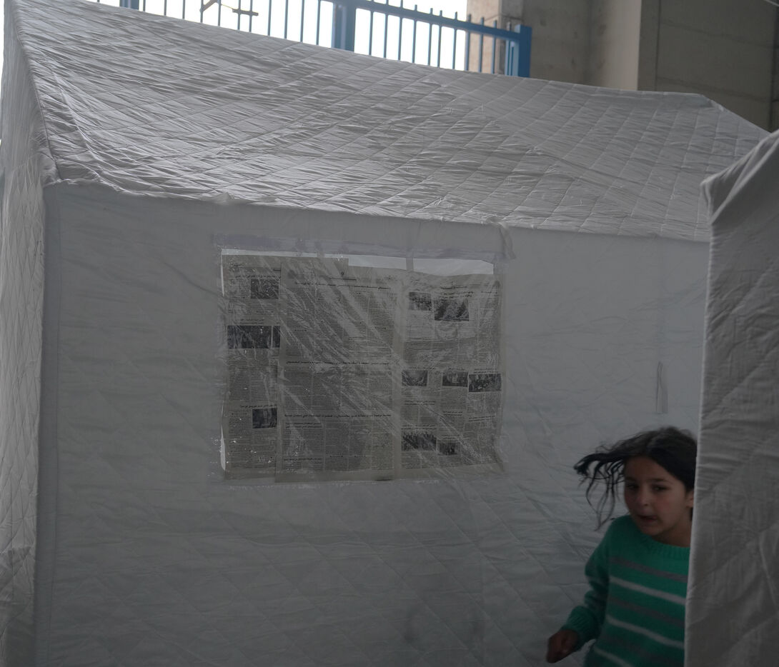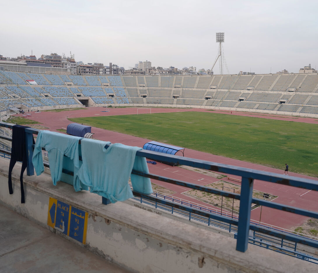 Stade Camille-Chamoun, plus grand stade de football du Liban, aménage en centre d'accueil pour les personnes déplacées venues du sud du pays. Il y a sept jours, le gouvernement a demandé la préparation du stade pour l'accueil des réfugiés. Ici, les personnes qui ont dû quitter leurs maisons ont accès à la nourriture, l'eau, l'électricité, des couvertures et des tentes rigides. 900 personnes sont installées dans le stade pour l'instant. Le 13 mars 2026.