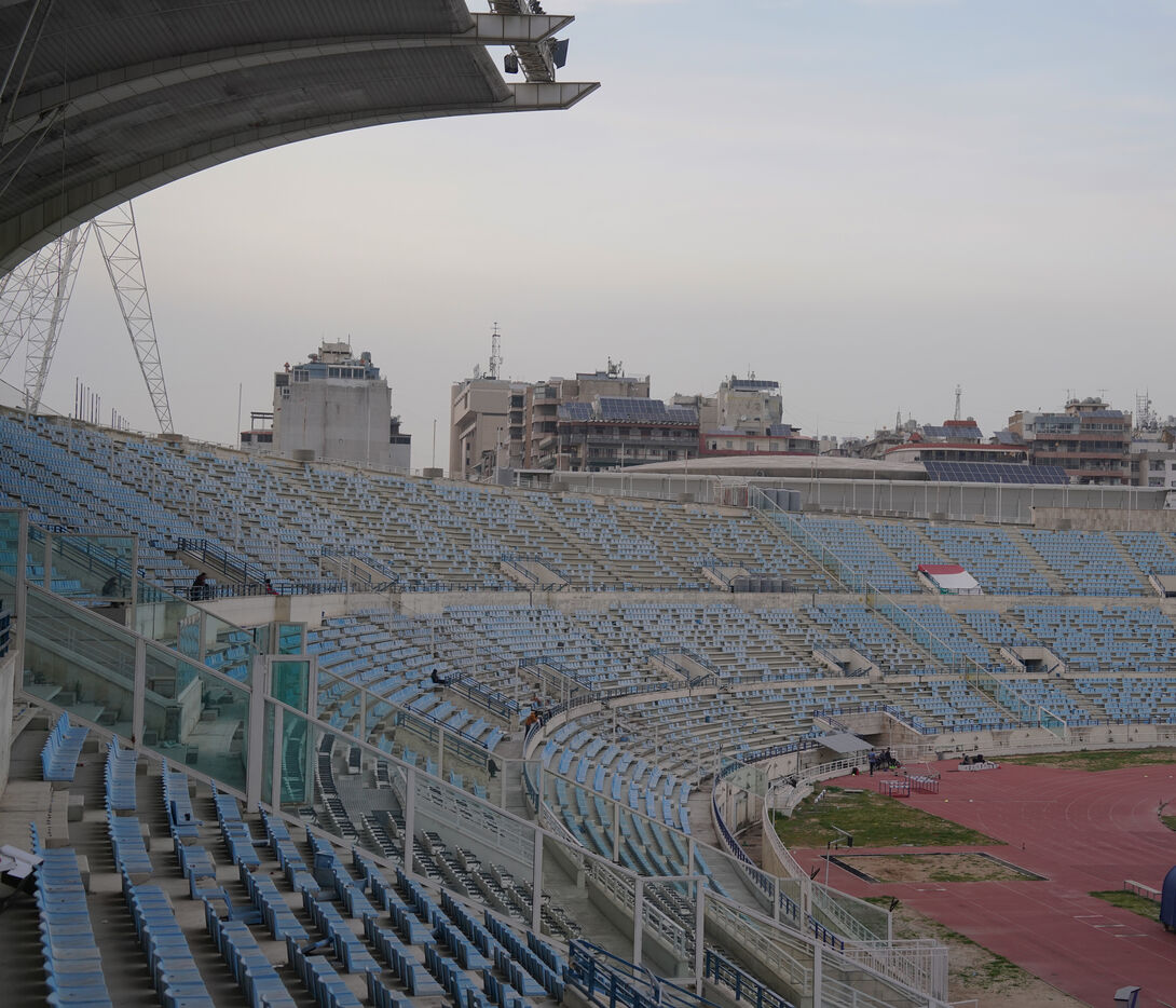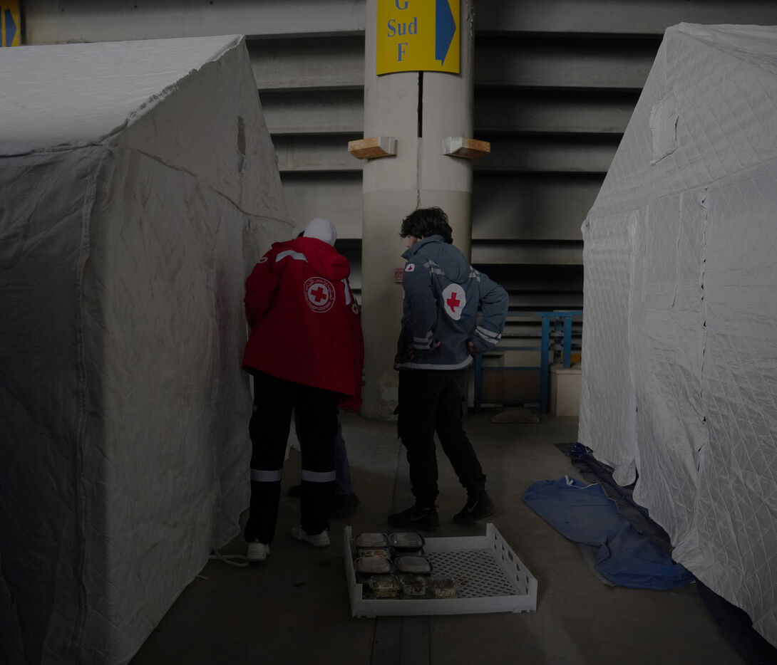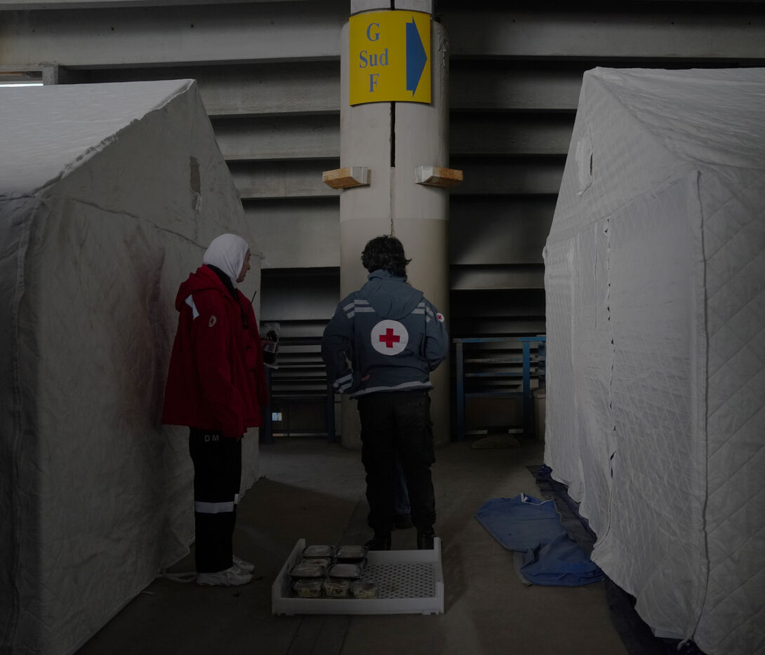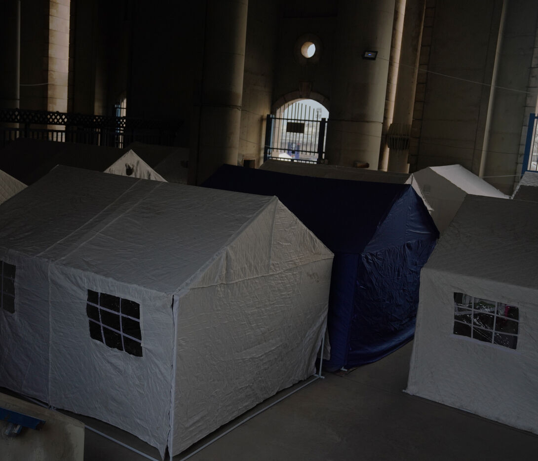 Camille Chamoun Stadium, Lebanon’s largest soccer stadium, has been converted into a shelter for displaced people from the south of the country. Seven days ago, the government ordered the stadium to be prepared to accommodate refugees. Here, people who have had to leave their homes have access to food, water, electricity, blankets, and hard-sided tents. 900 people are currently housed in the stadium. March 13, 2026.