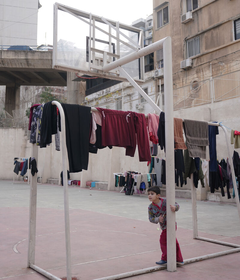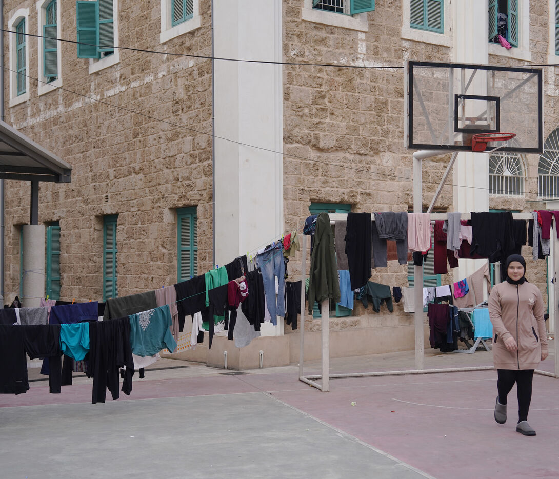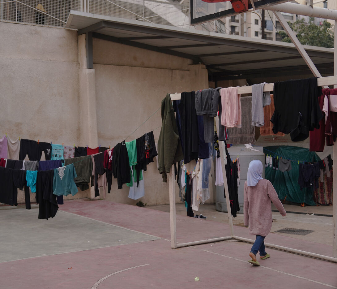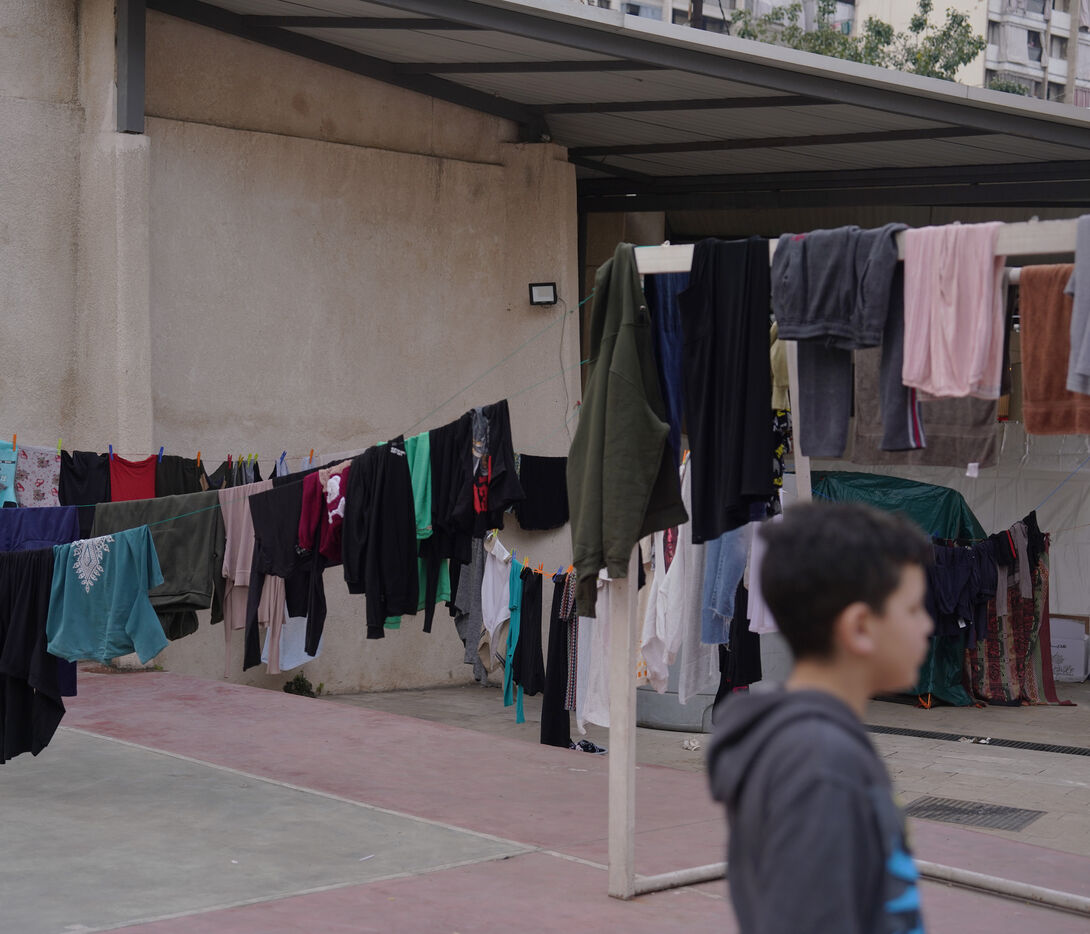 The Hassan Khaled School in Beirut has been converted into a shelter for displaced people. Here, people who have had to leave their homes have access to food, water, electricity, blankets, and tents.