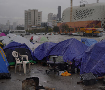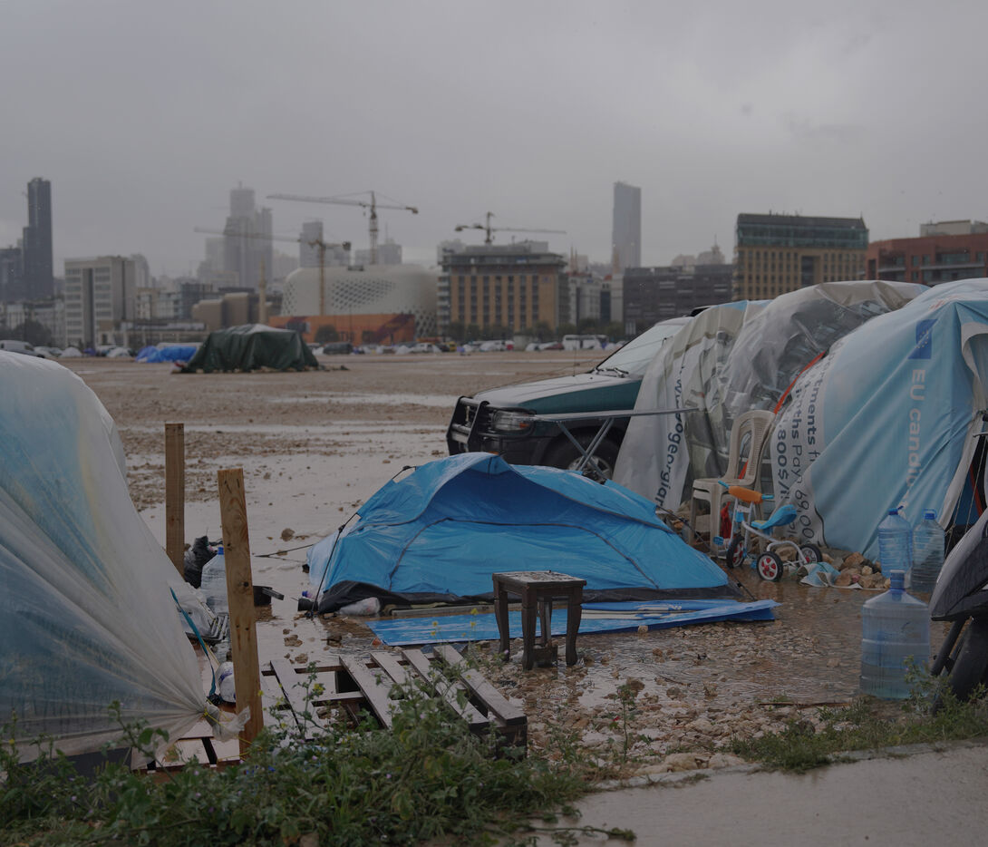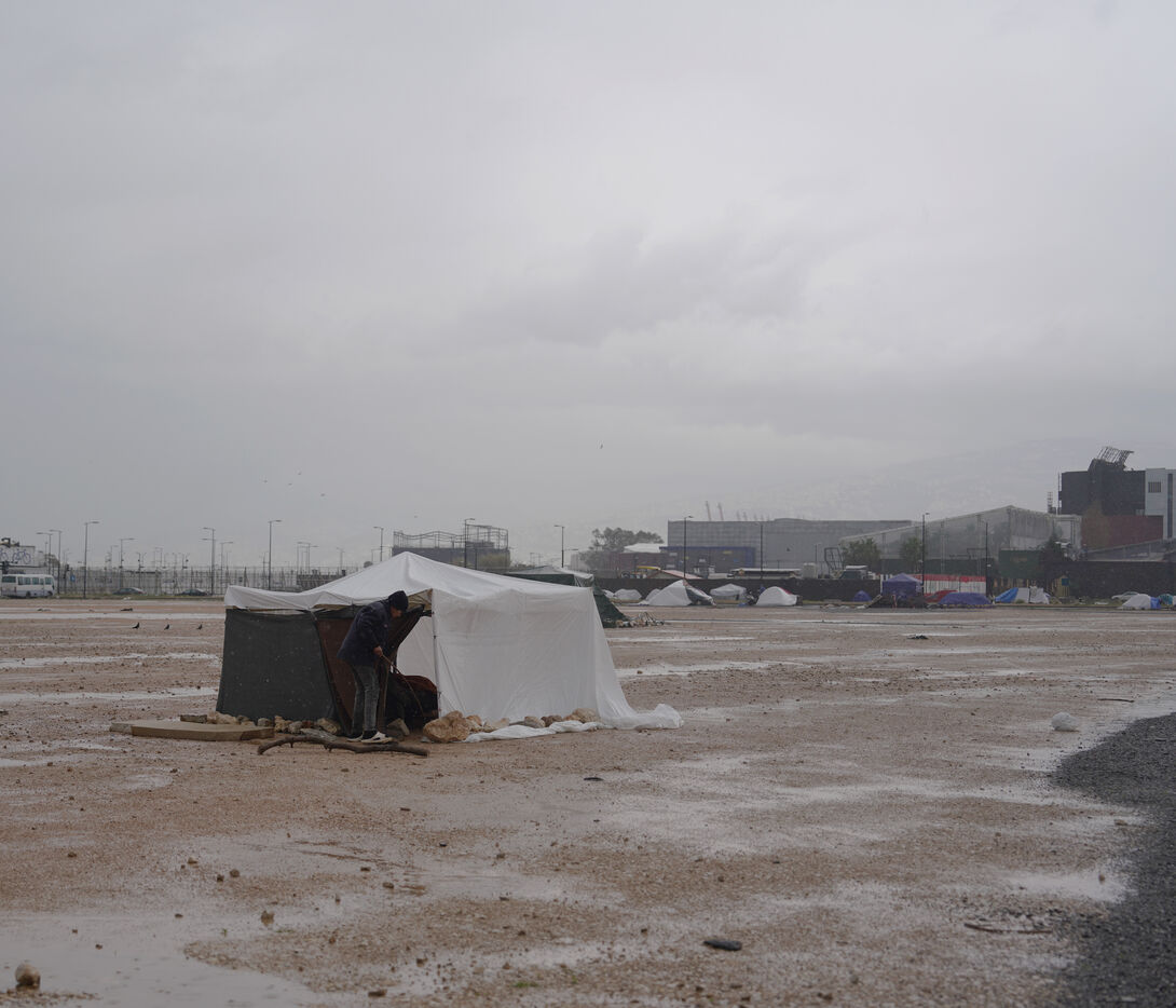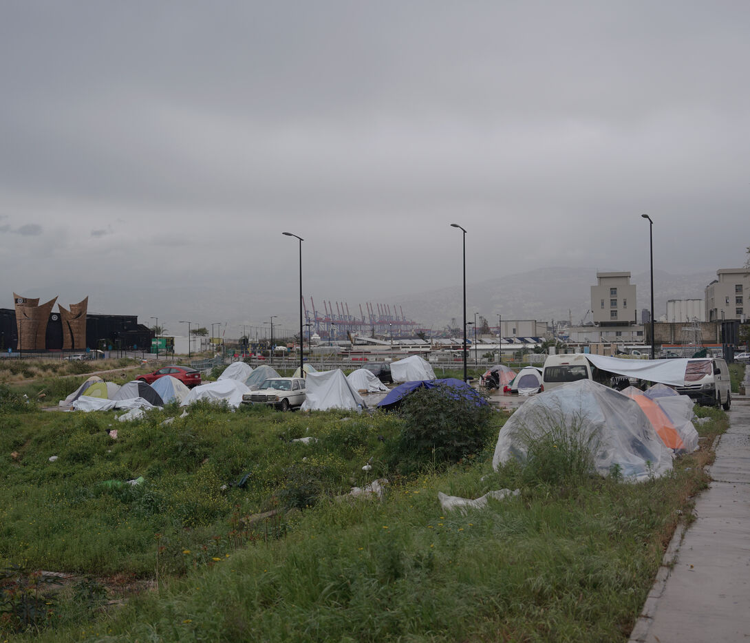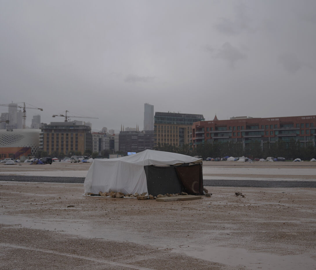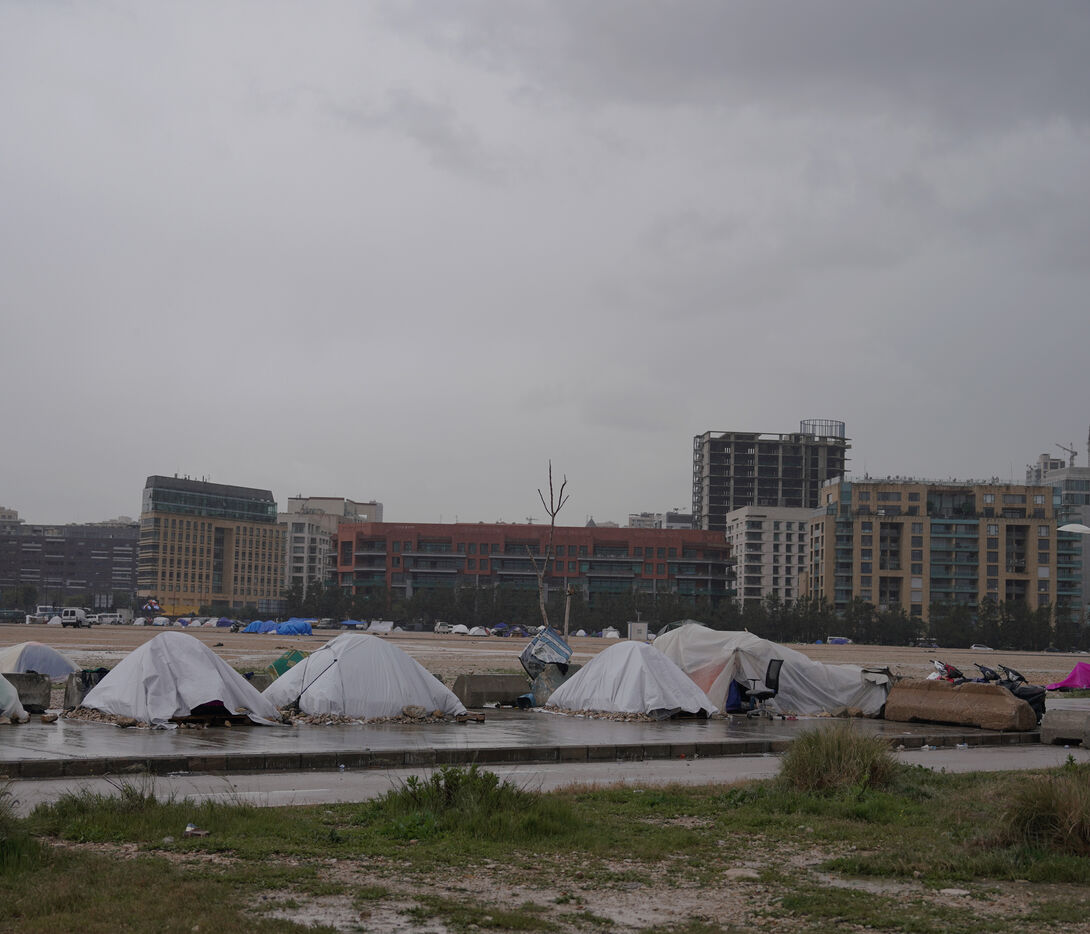 Camps for displaced people in the rain along the Beirut waterfront on March 21, 2026.