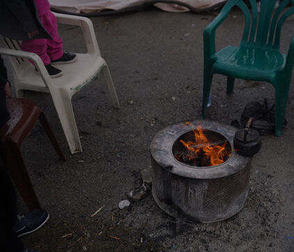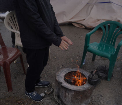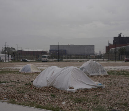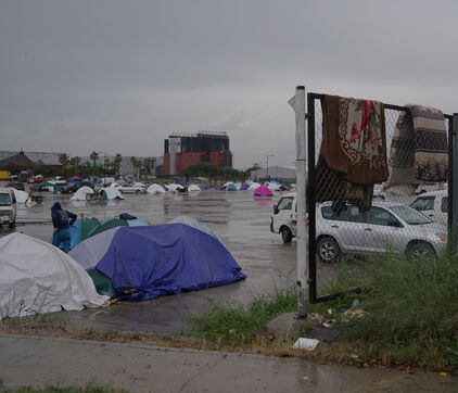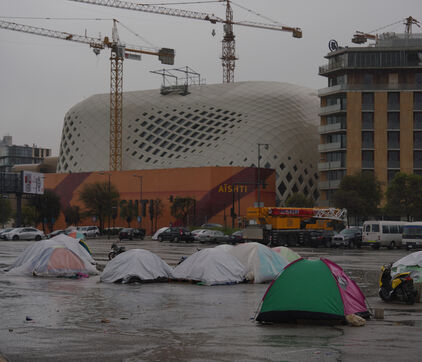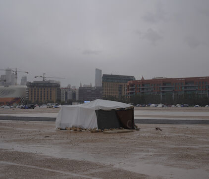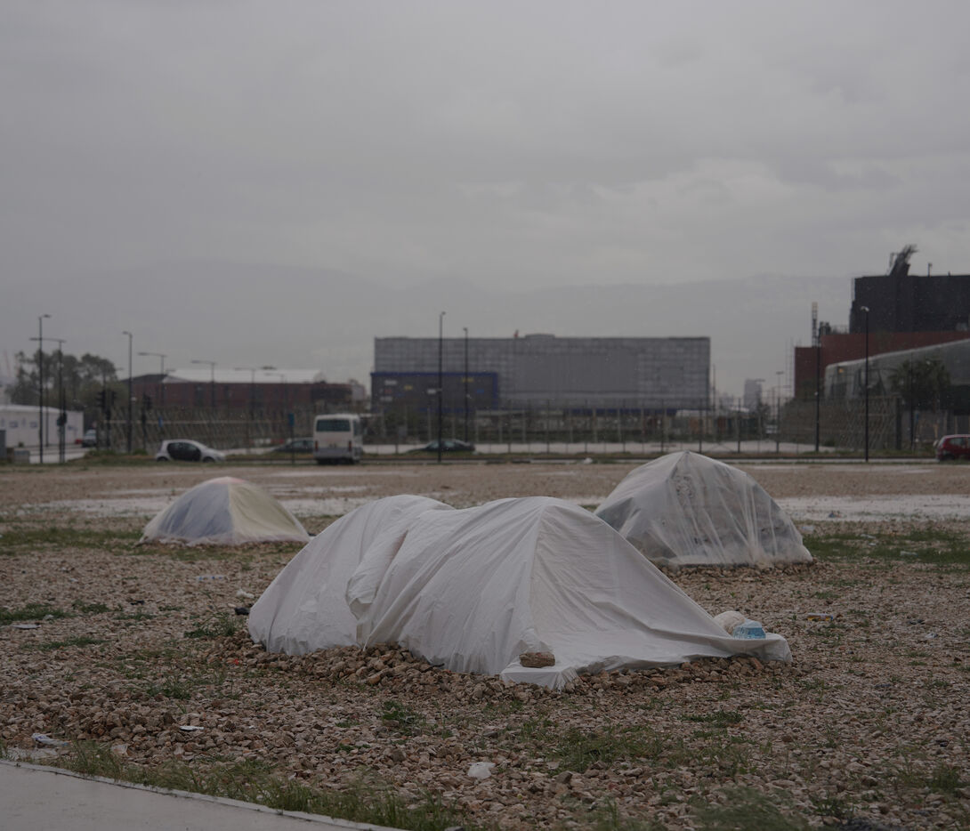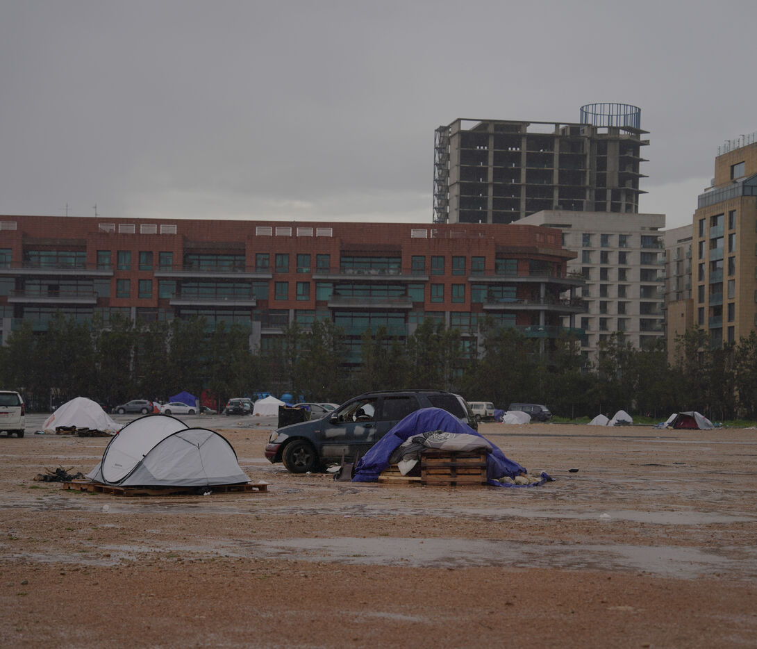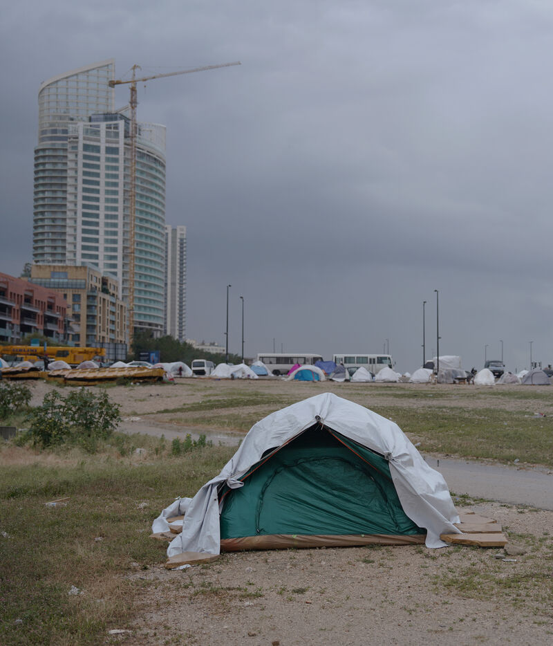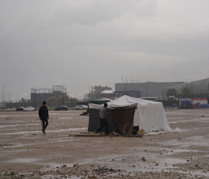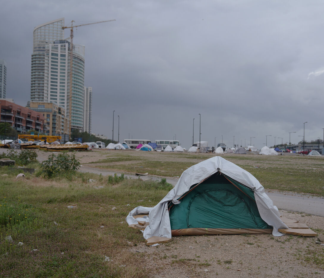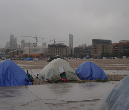 Camps for displaced people in the rain along the Beirut waterfront on March 21, 2026.